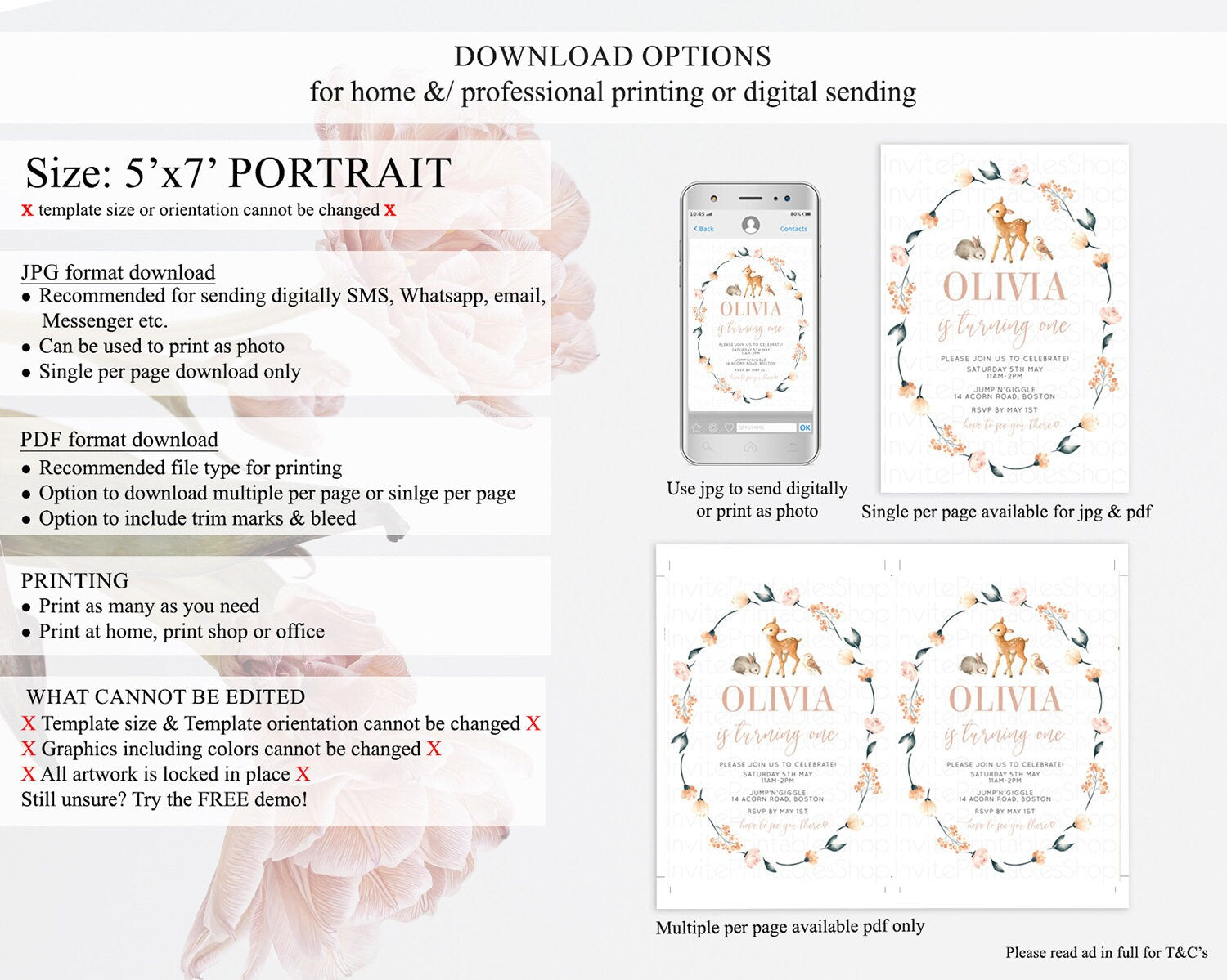 Fawn Birthday Invitation Deer Birthday Invitation Enchanted Forest Party Butterfly Pastel Flowers Whimsical 2nd 1st First Birthday D10241