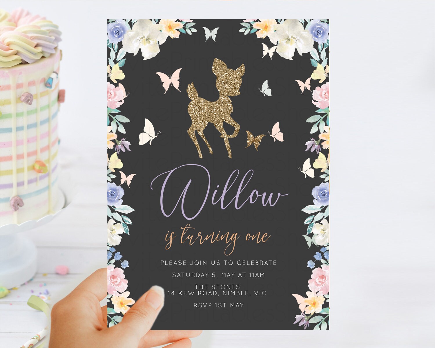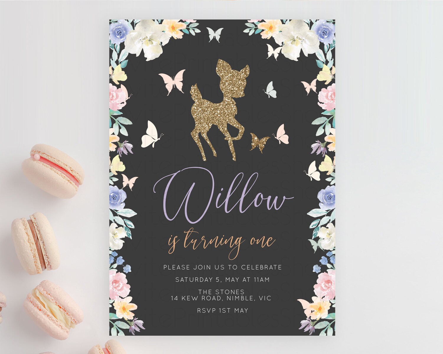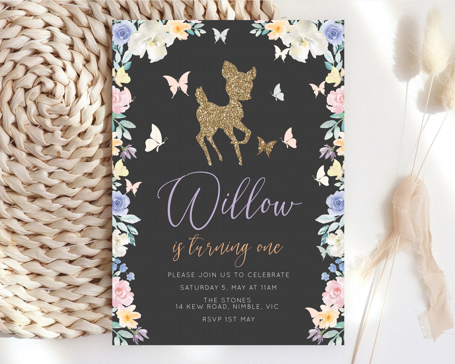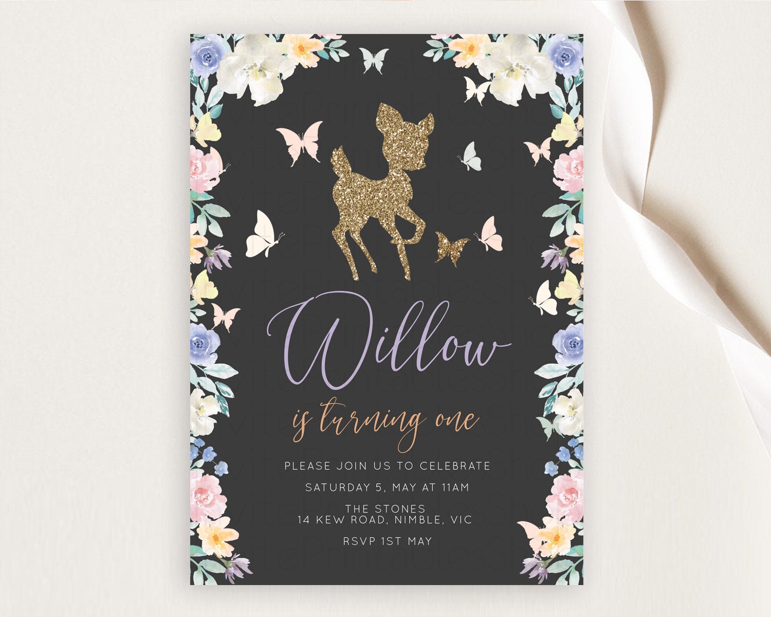 Fawn Birthday Invitation Deer Birthday Invitation Enchanted Forest Party Butterfly Pastel Flowers Whimsical 2nd 1st First Birthday D10323