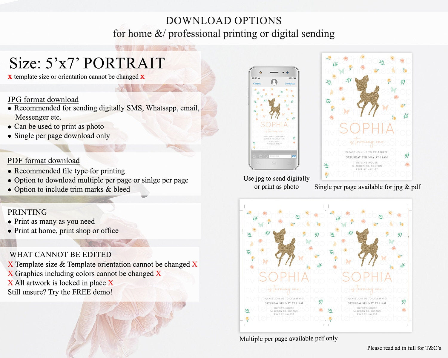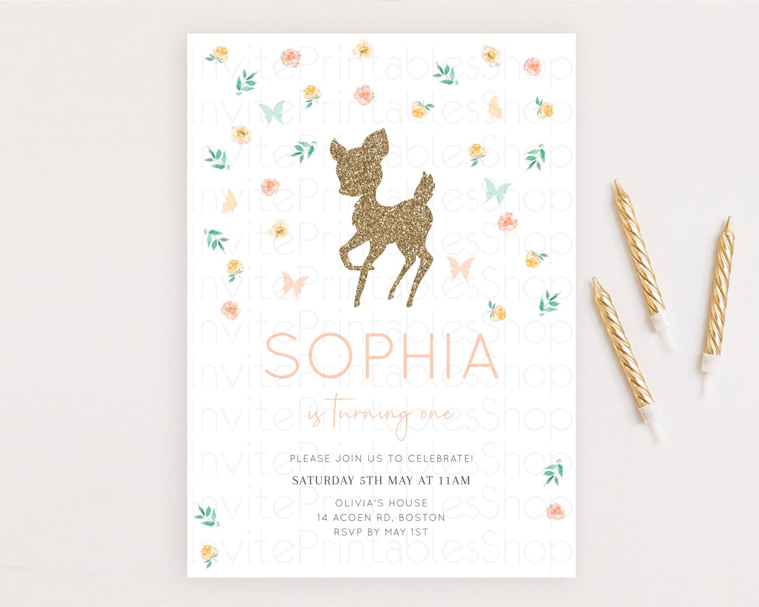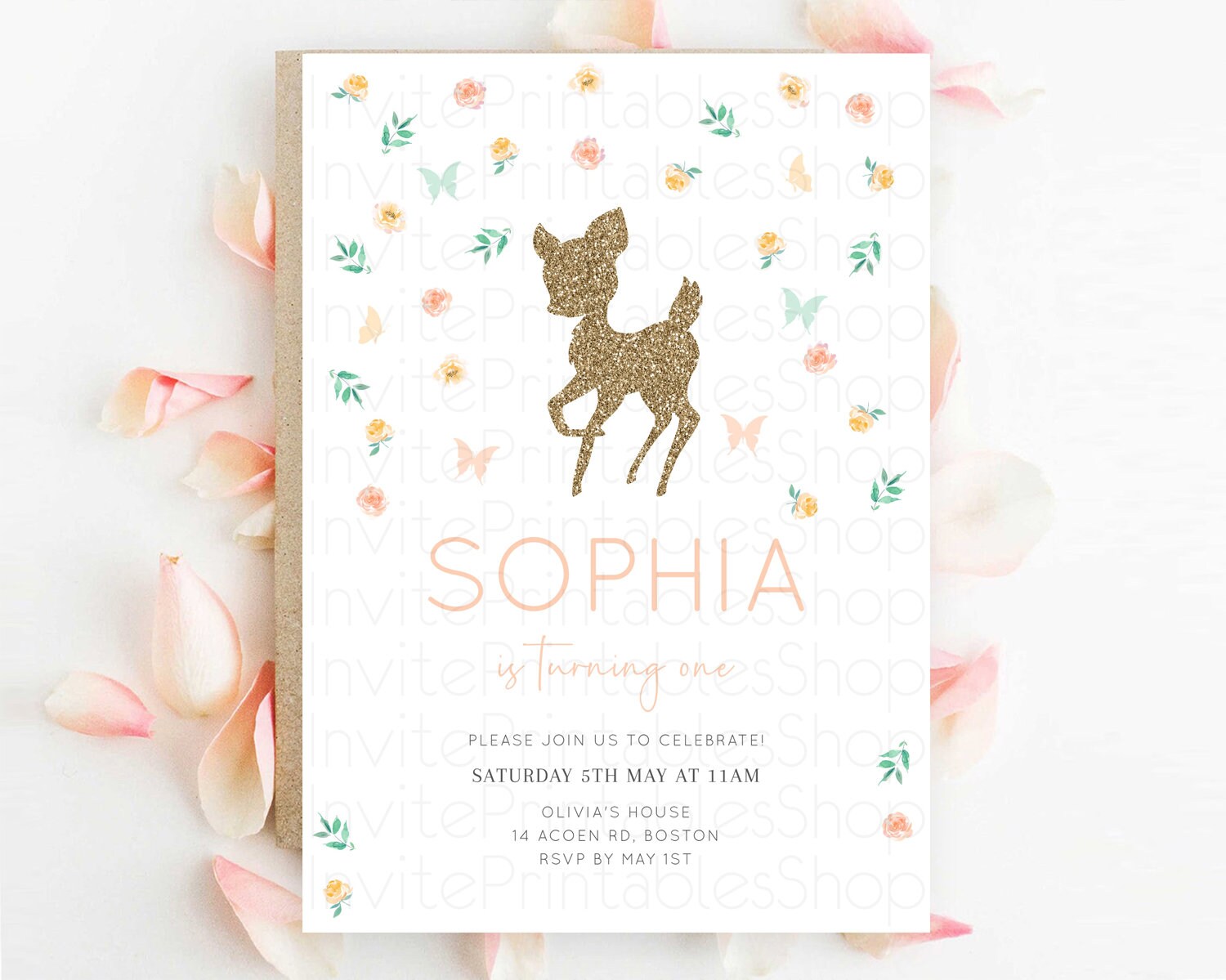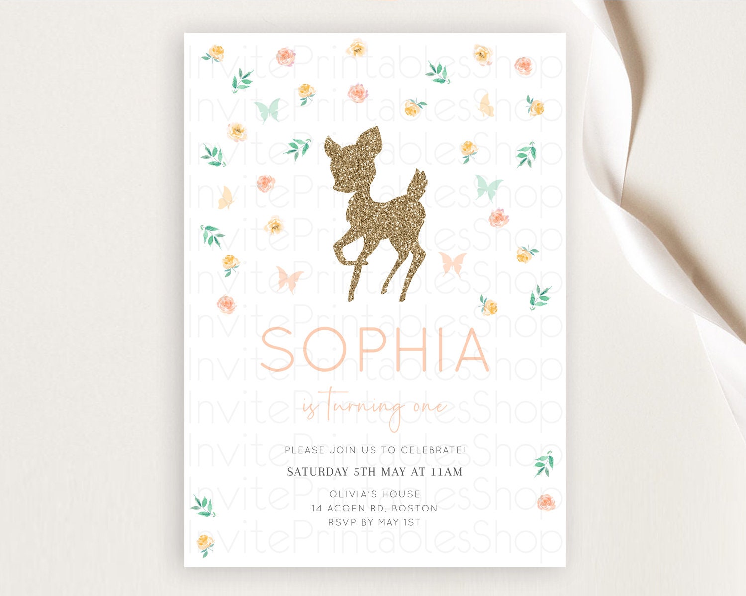Fawn Birthday Invitation Deer Birthday Invitation Enchanted Forest Party Butterfly Pastel Flowers Whimsical 2nd 1st First Birthday D10355