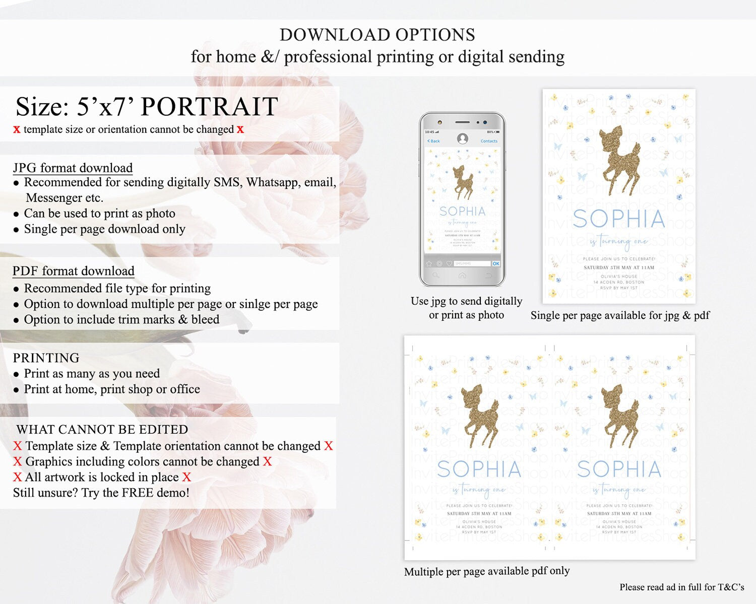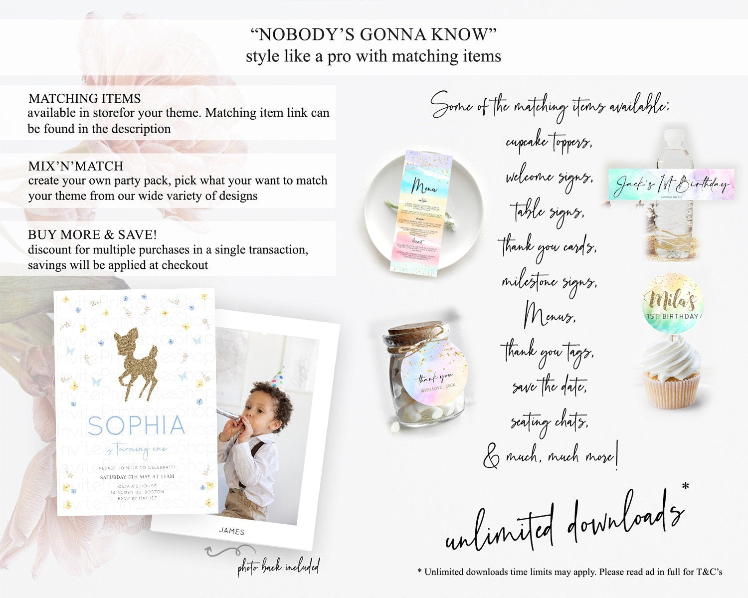 Fawn Birthday Invitation Deer Birthday Invitation Enchanted Forest Party Butterfly Pastel Flowers Whimsical 2nd 1st First Birthday D10360