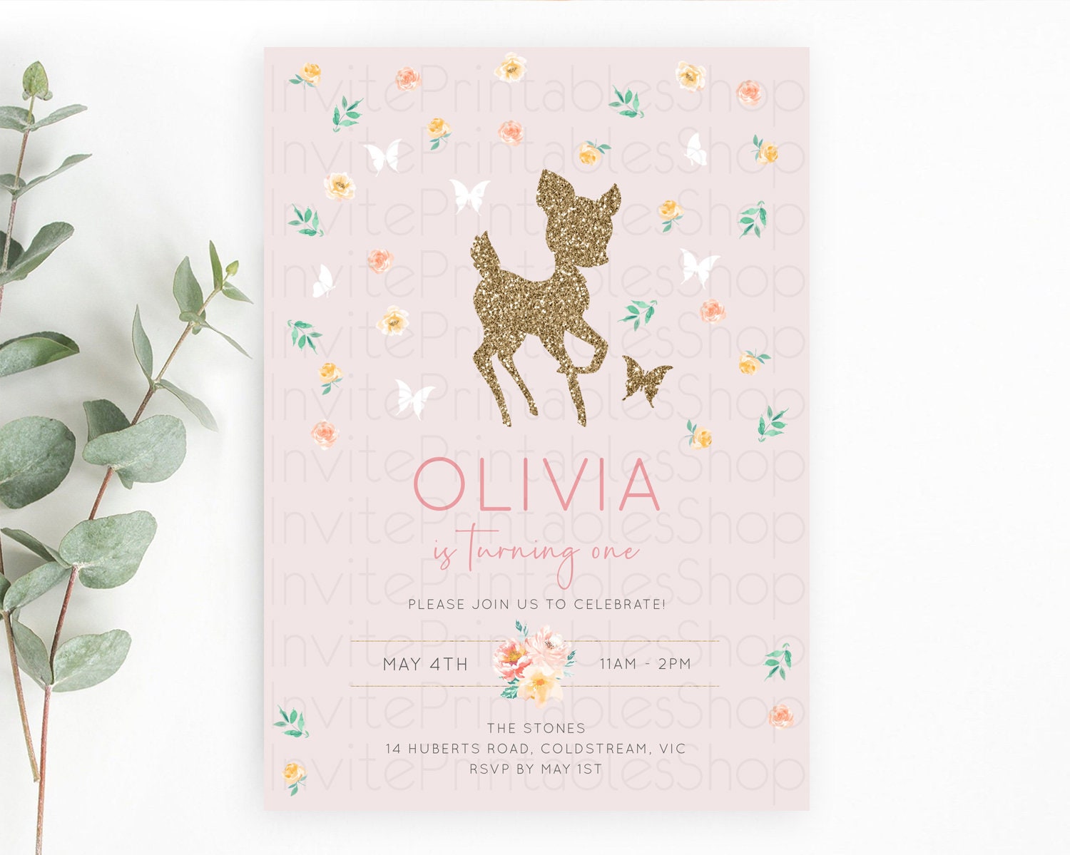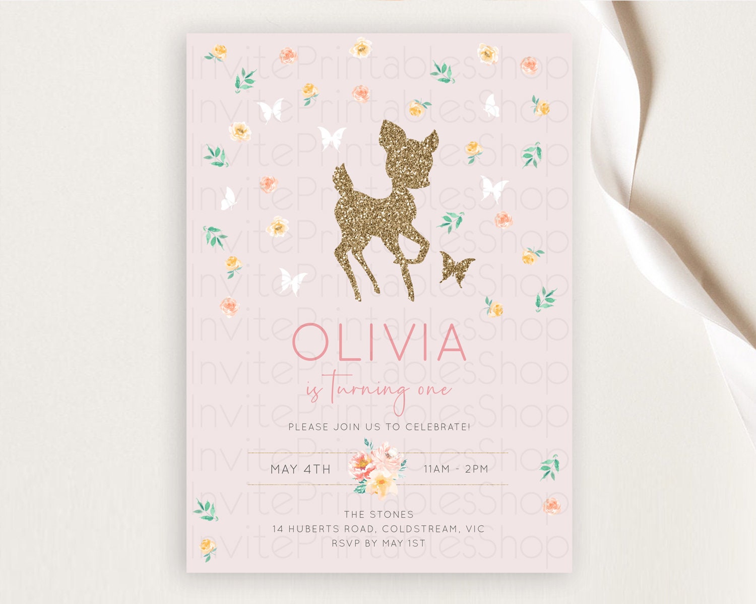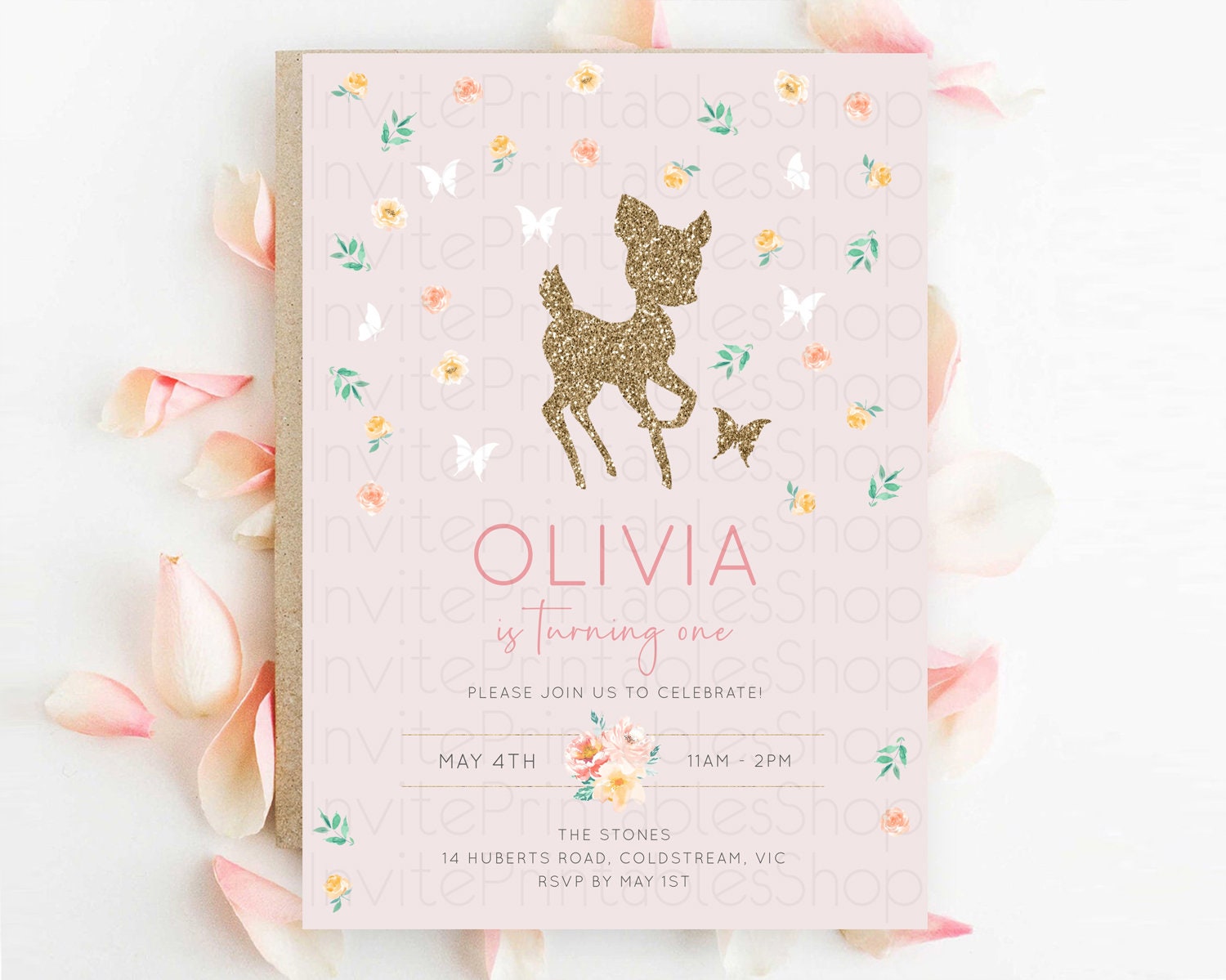 Fawn Birthday Invitation Deer Birthday Invitation Enchanted Forest Party Butterfly Pastel Flowers Whimsical 2nd 1st First Birthday D10386