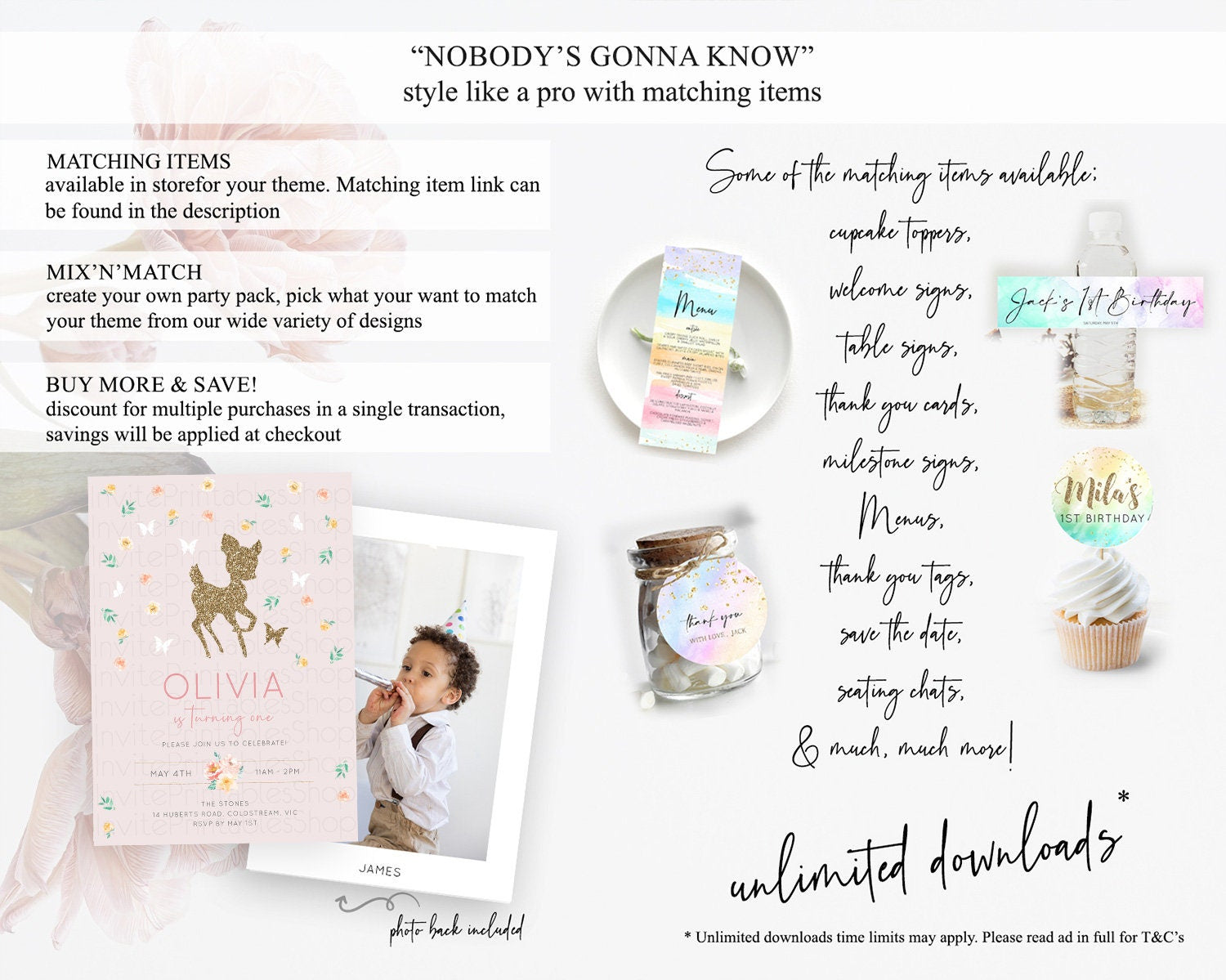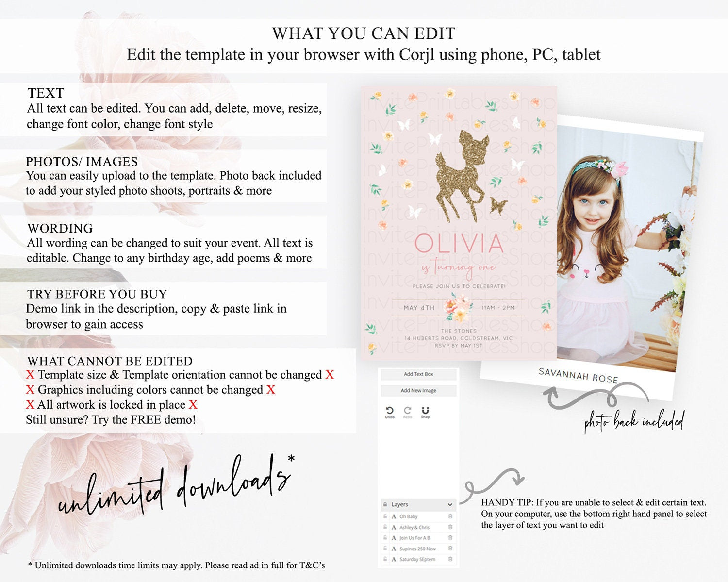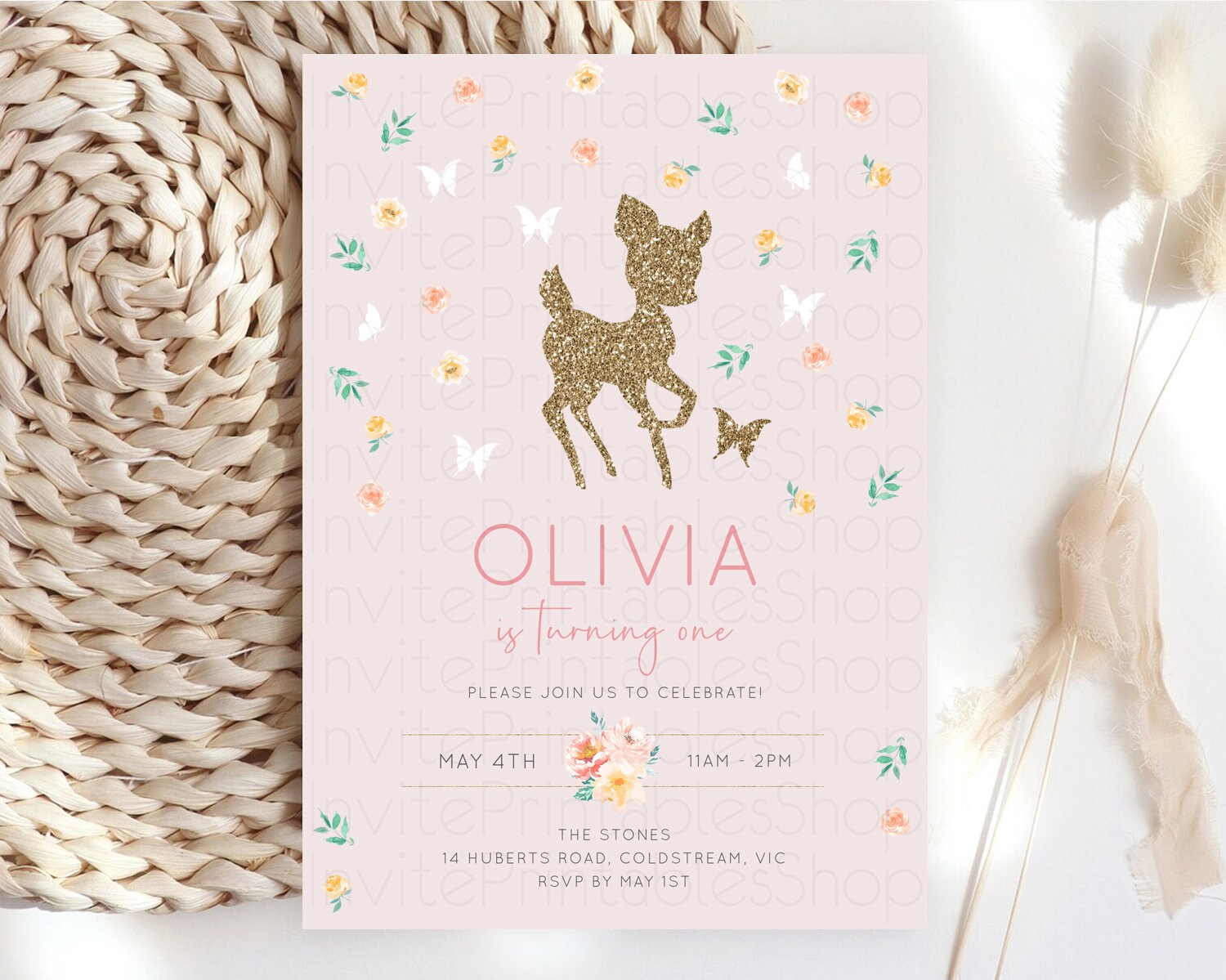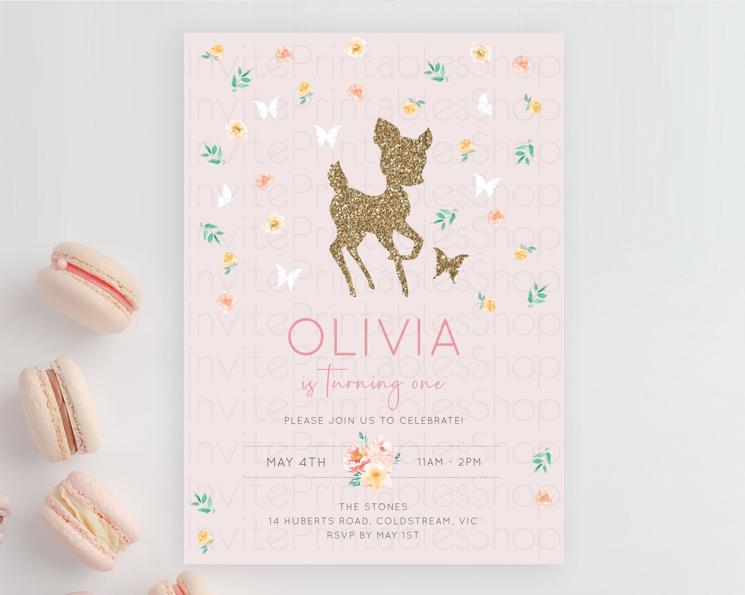 Fawn Birthday Invitation Deer Birthday Invitation Enchanted Forest Party Butterfly Pastel Flowers Whimsical 2nd 1st First Birthday D10386