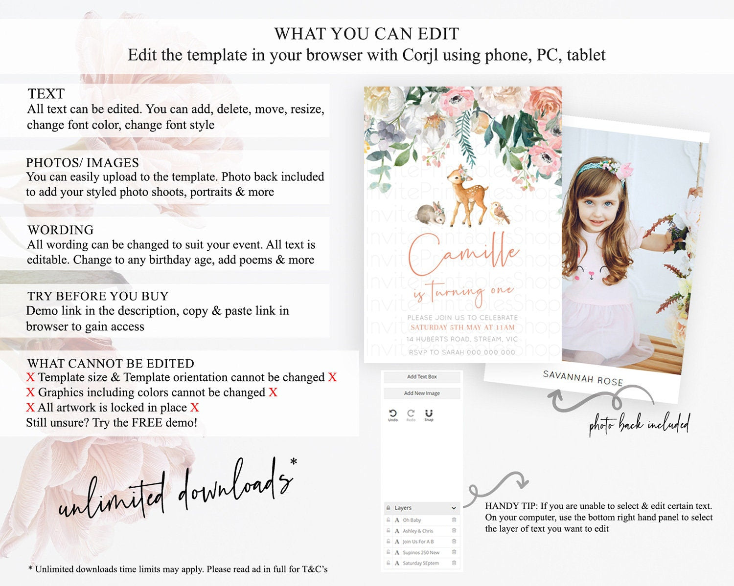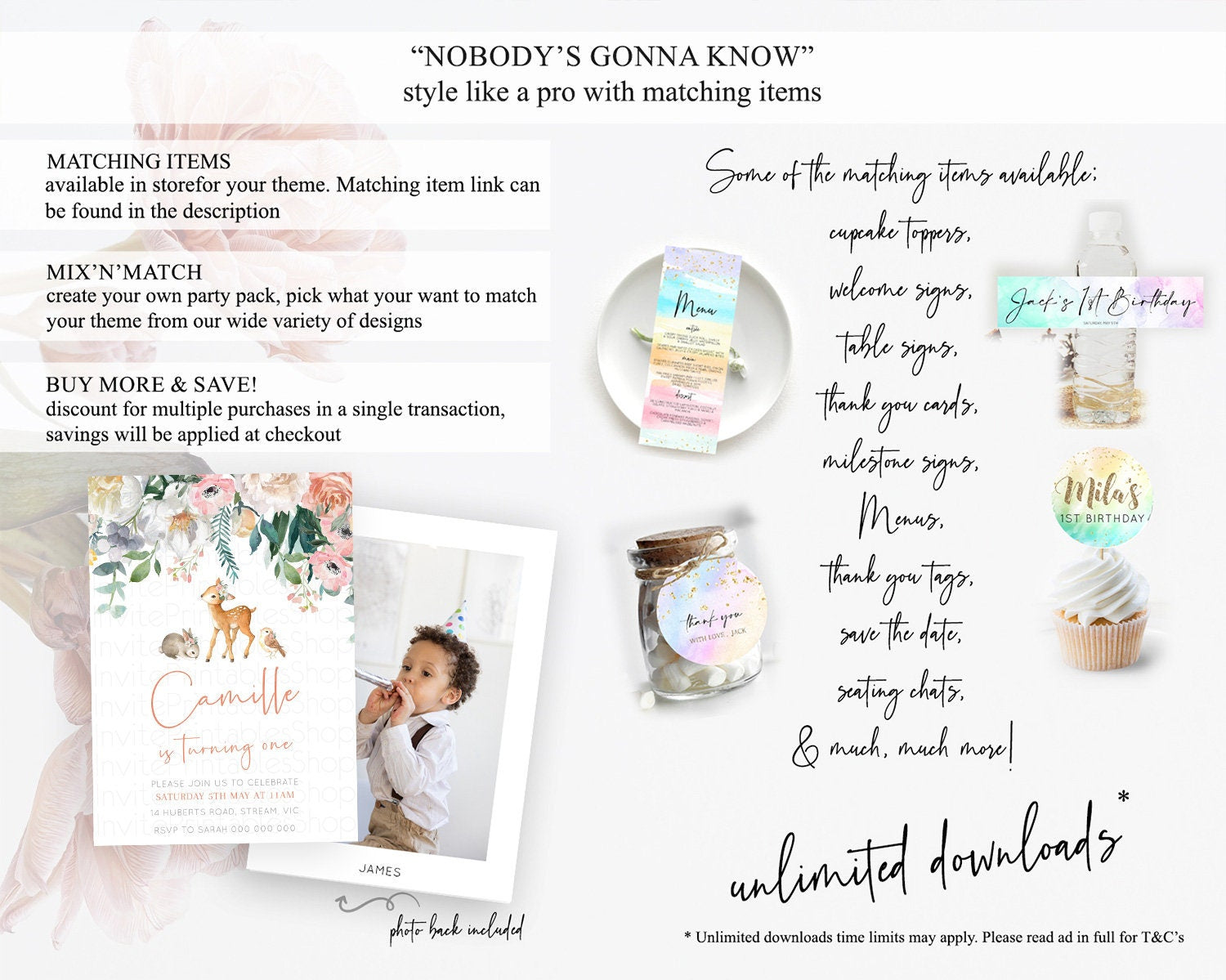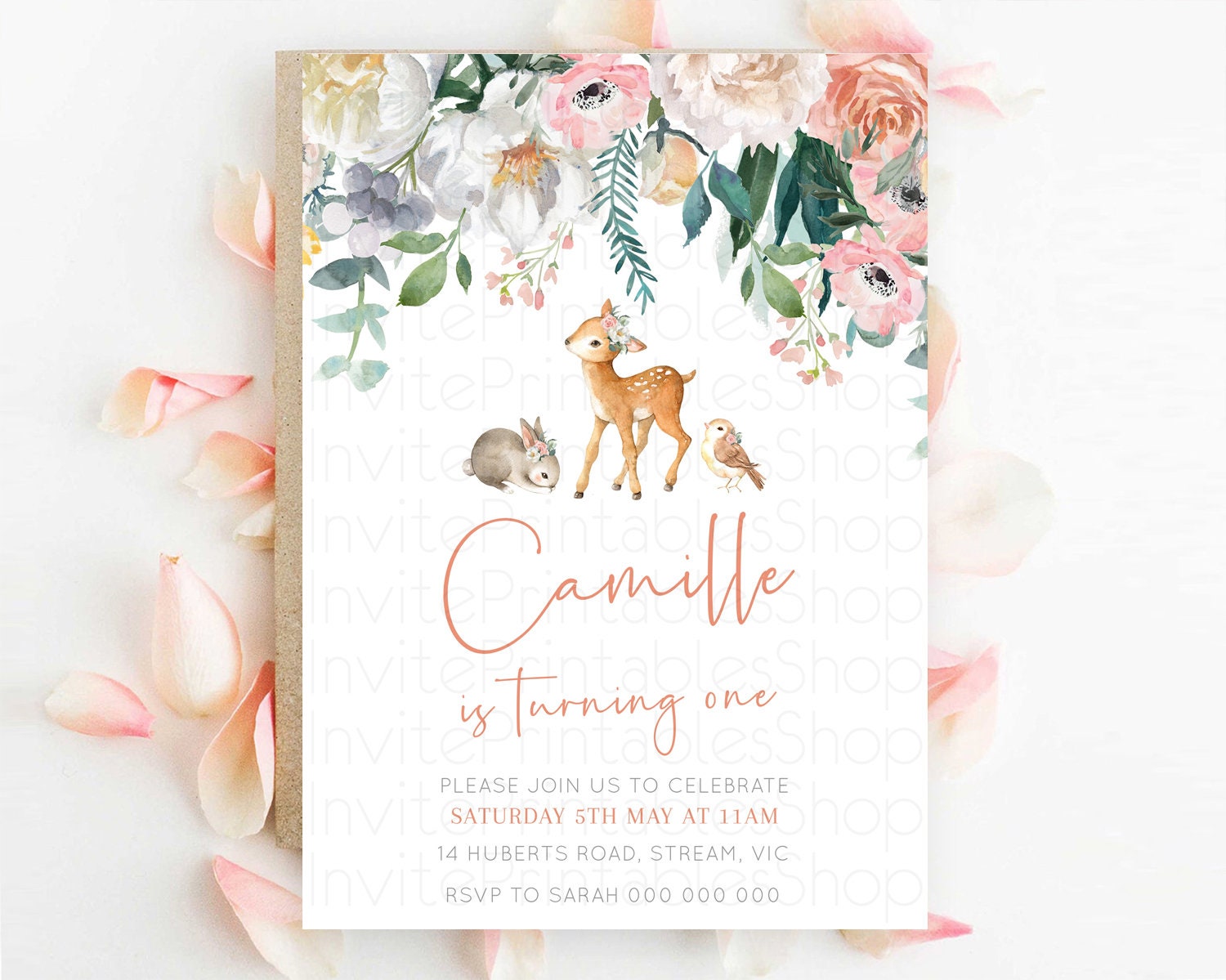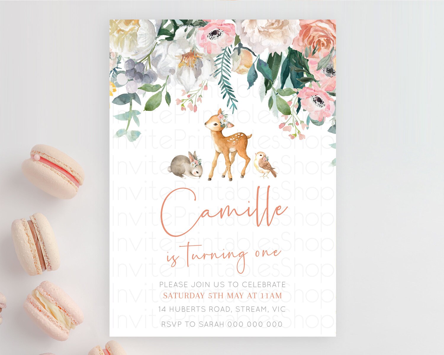 Fawn Birthday Invitation Deer Birthday Invitation Enchanted Forest Party Butterfly Pastel Flowers Whimsical 2nd 1st First Birthday D10733