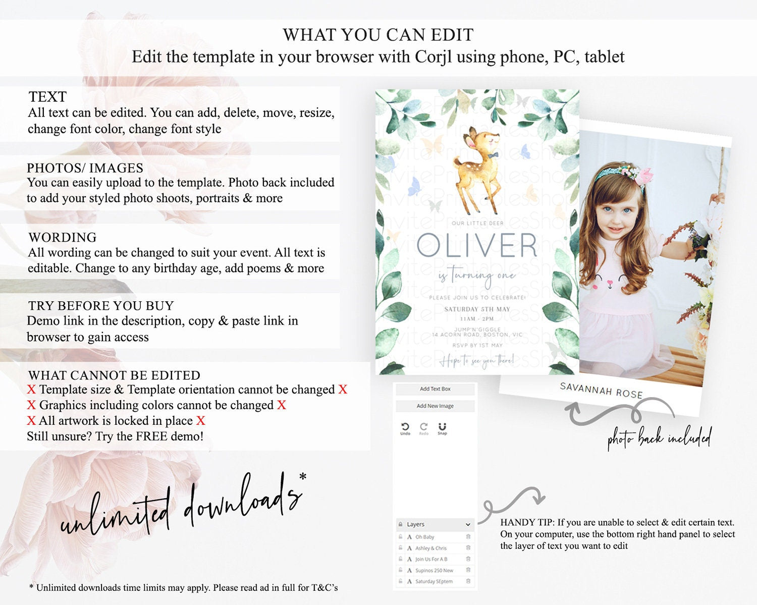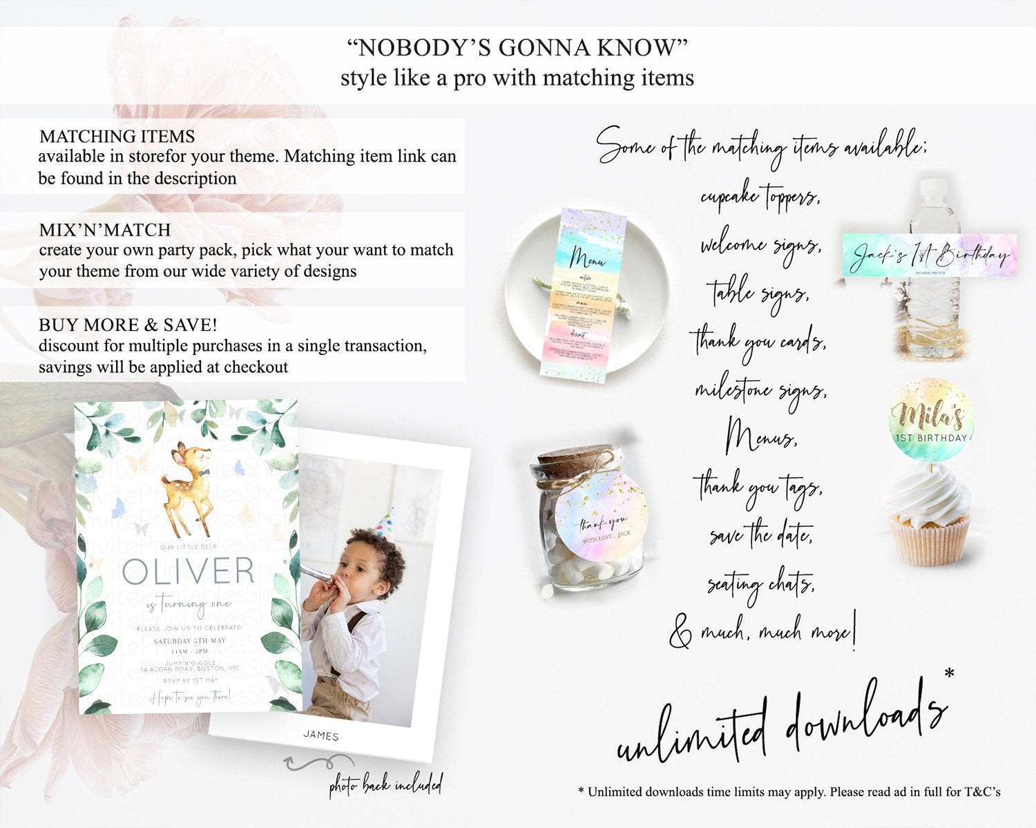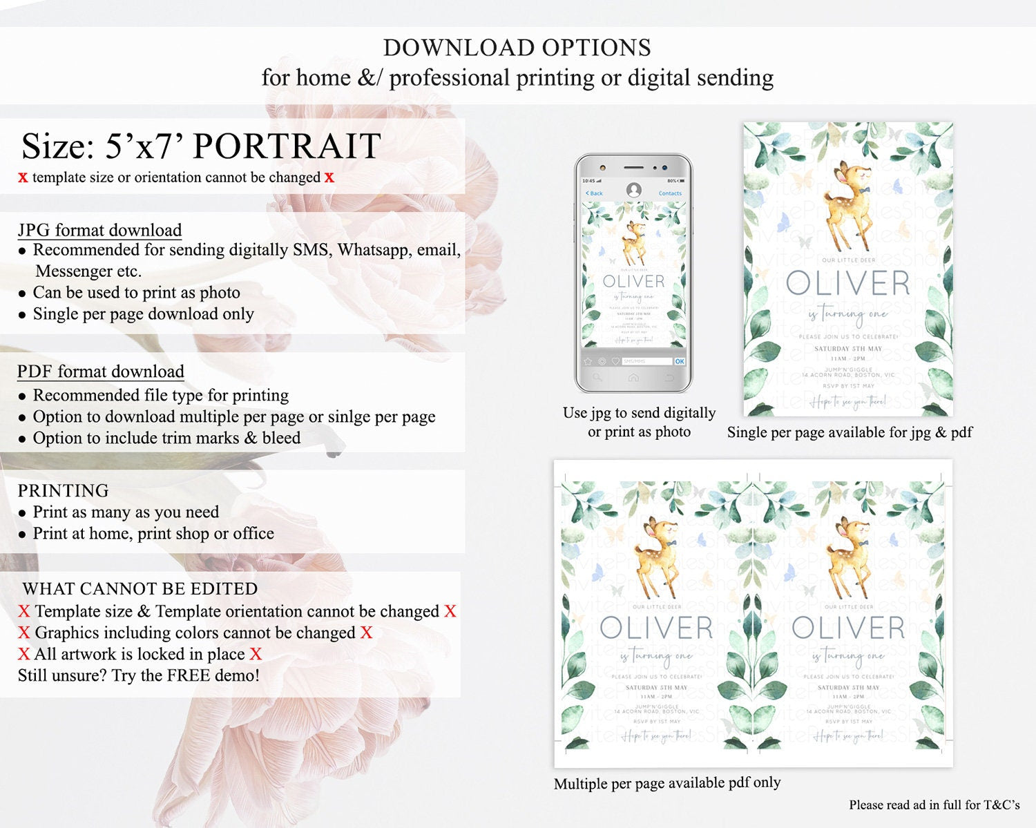 Fawn Birthday Invitation Deer Birthday Invitation Enchanted Forest Party Butterfly Pastel Flowers Whimsical 2nd 1st First Birthday D10767