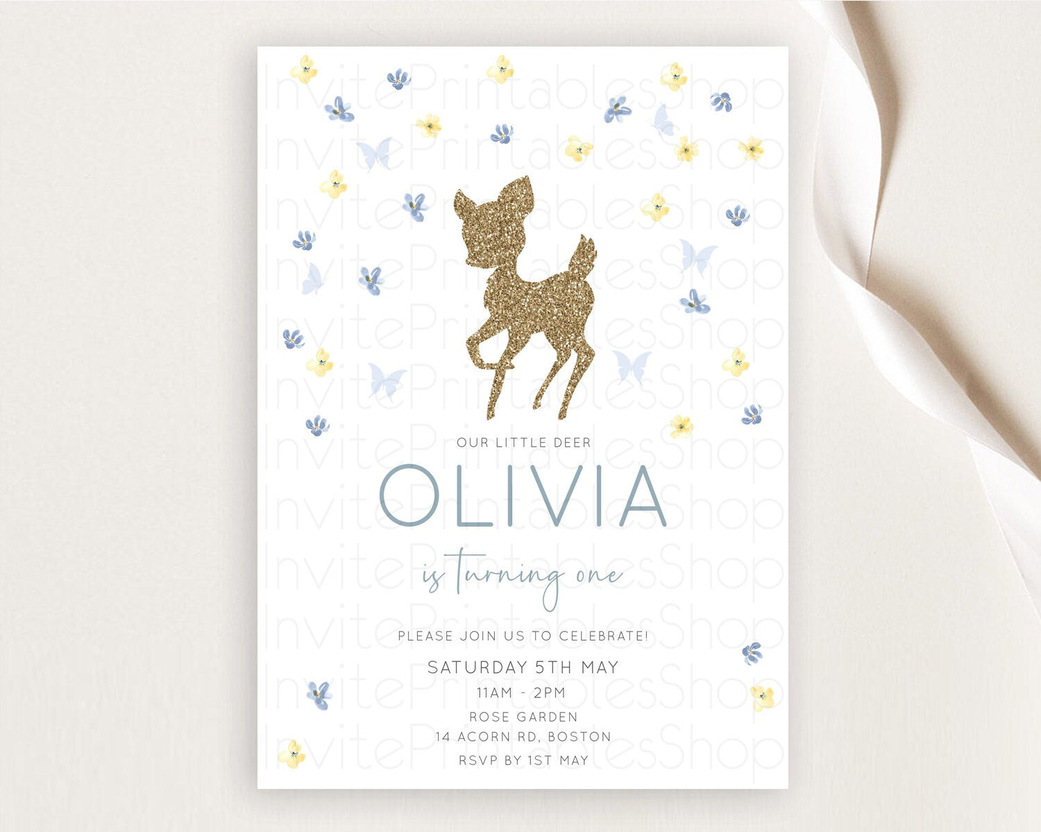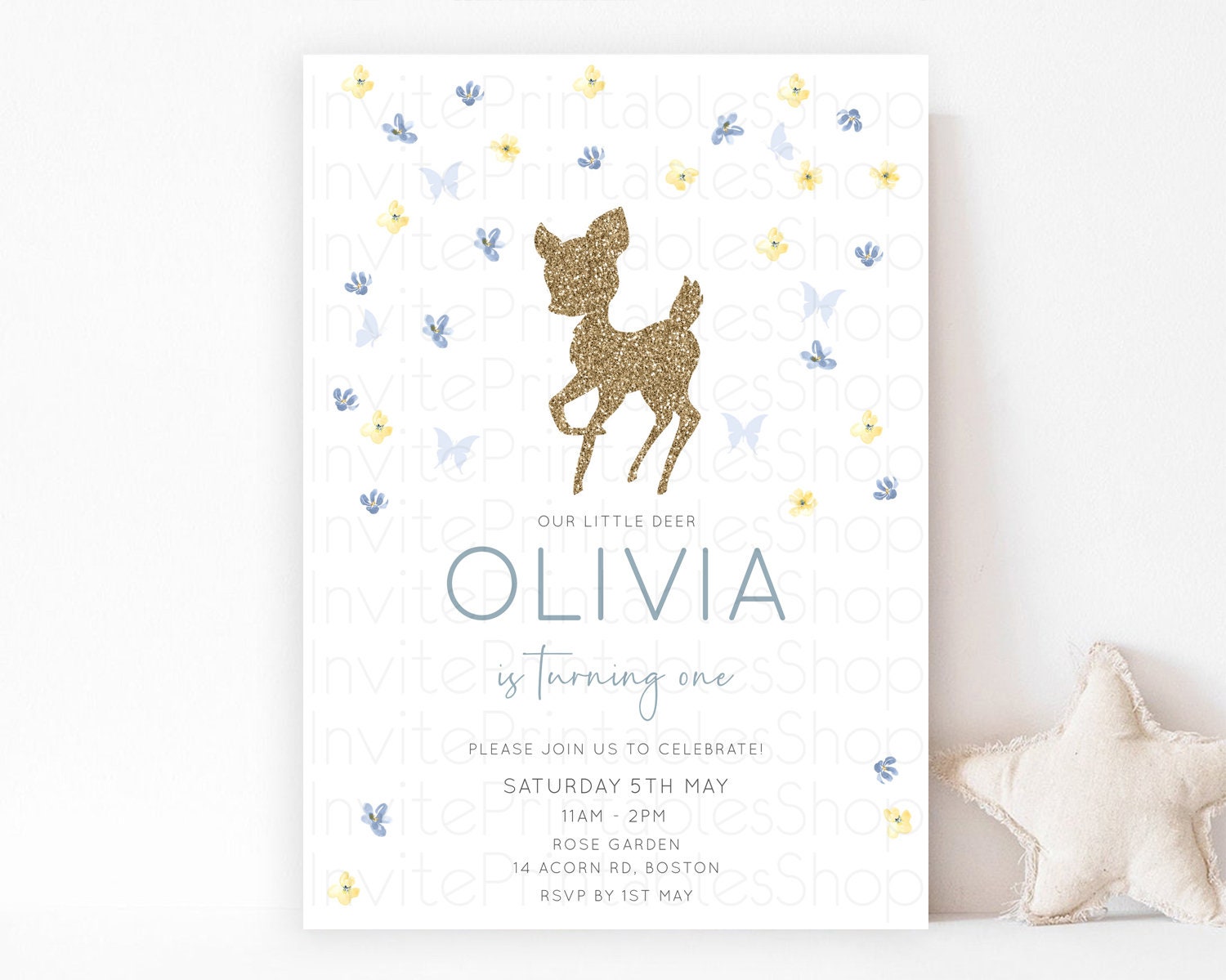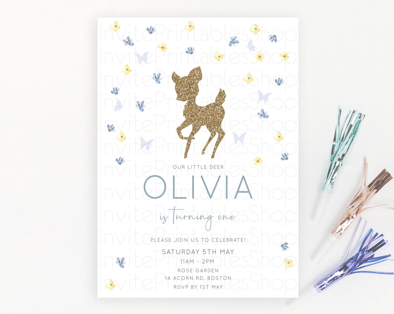 Fawn Birthday Invitation Deer Birthday Invitation Enchanted Forest Party Butterfly Pastel Flowers Whimsical 2nd 1st First Birthday D10864