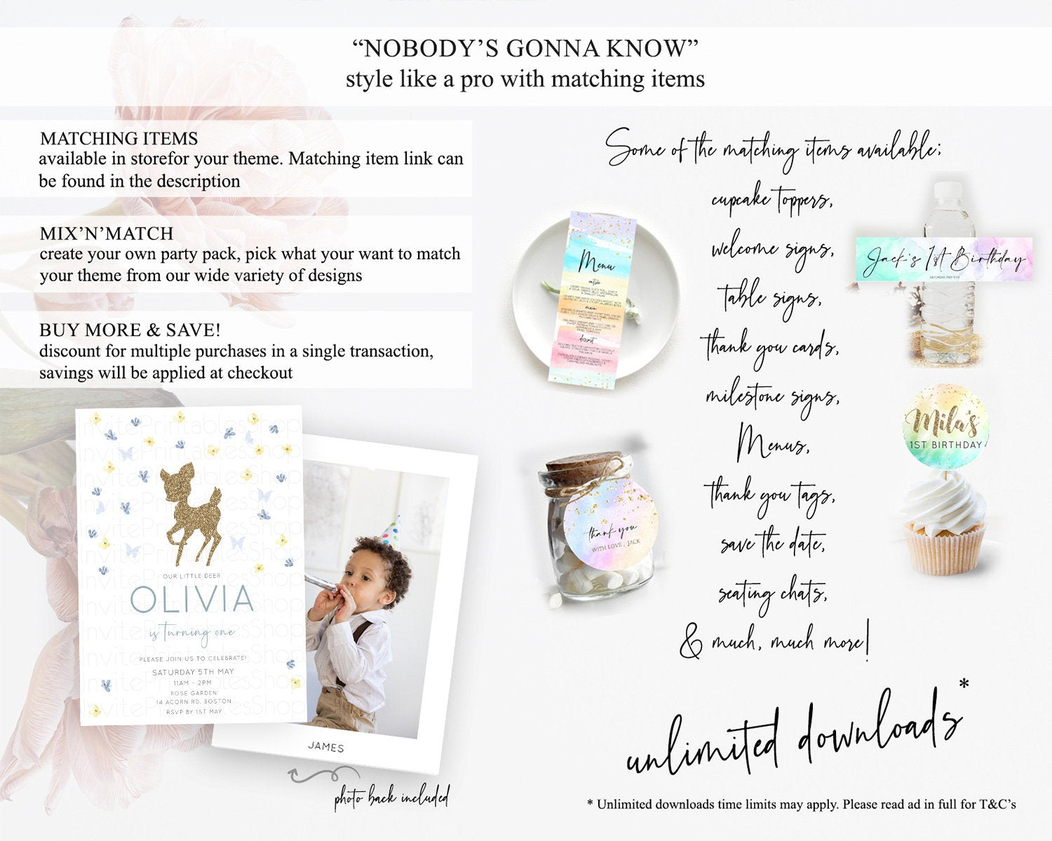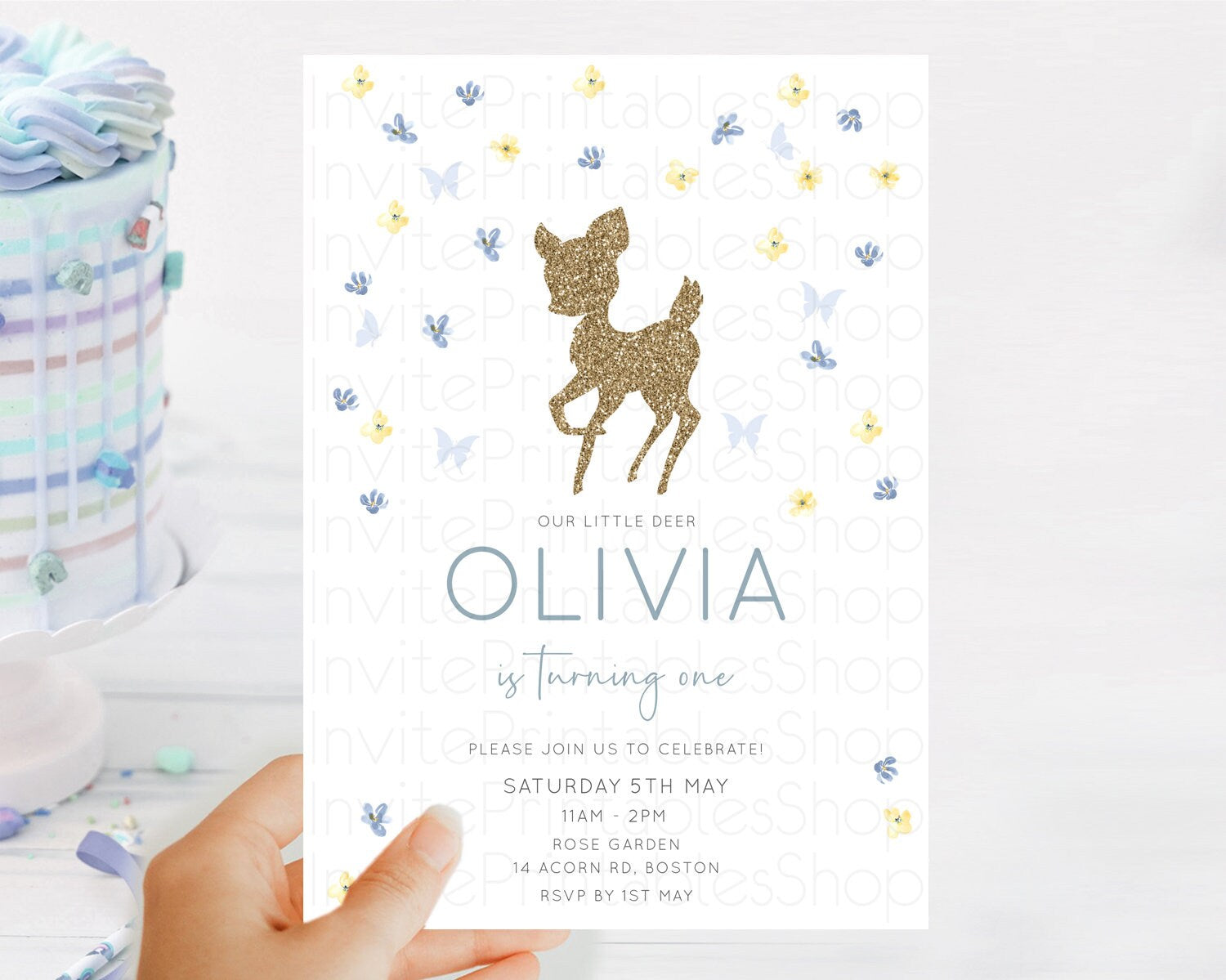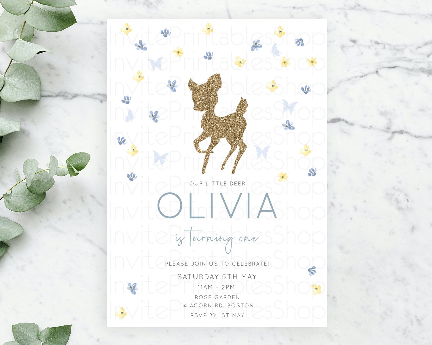 Fawn Birthday Invitation Deer Birthday Invitation Enchanted Forest Party Butterfly Pastel Flowers Whimsical 2nd 1st First Birthday D10864