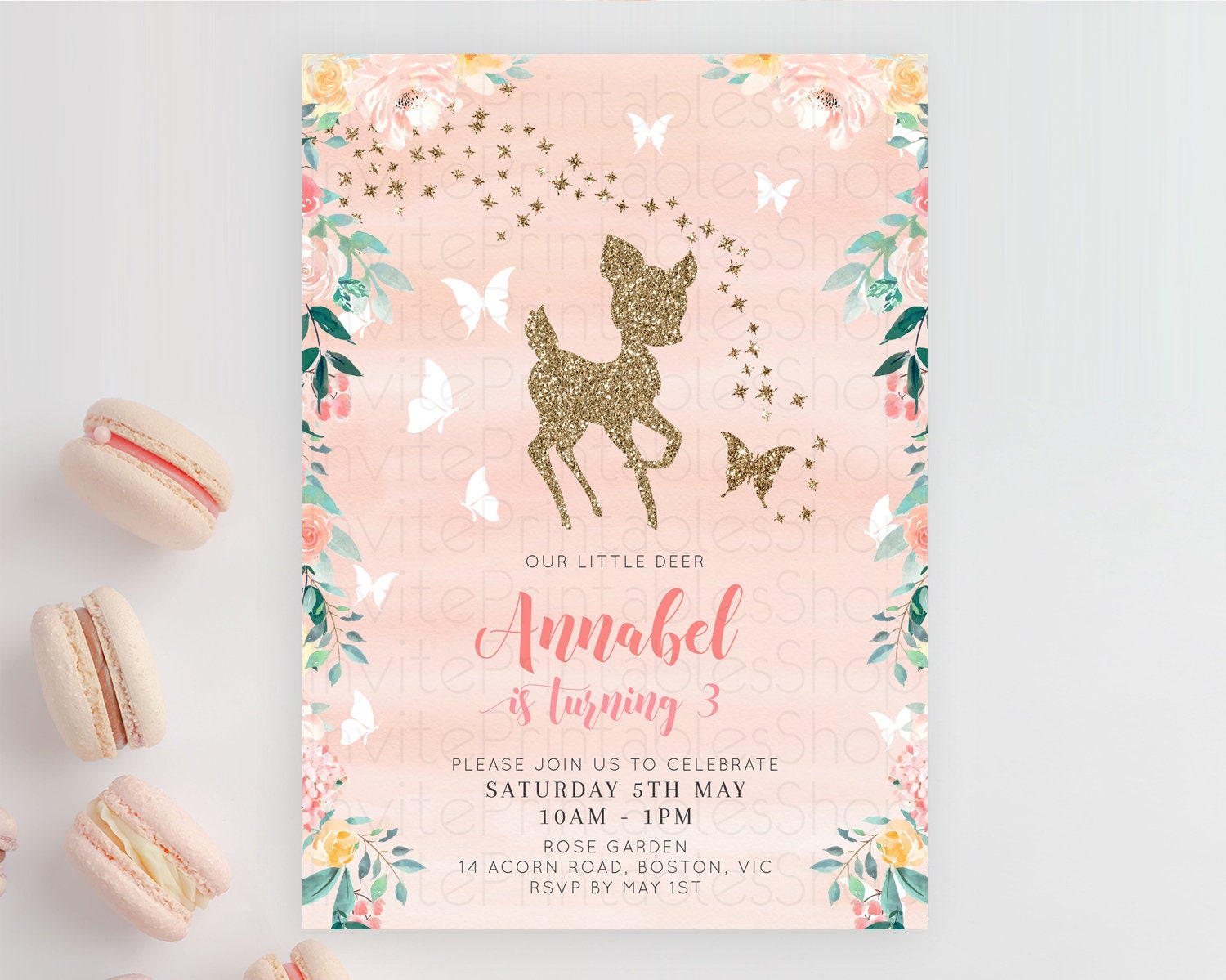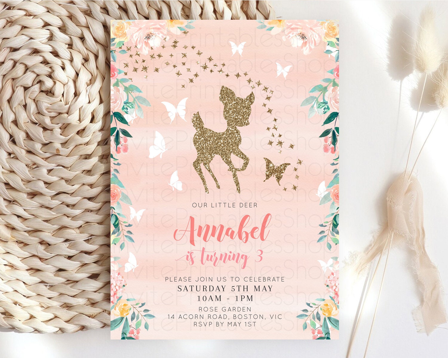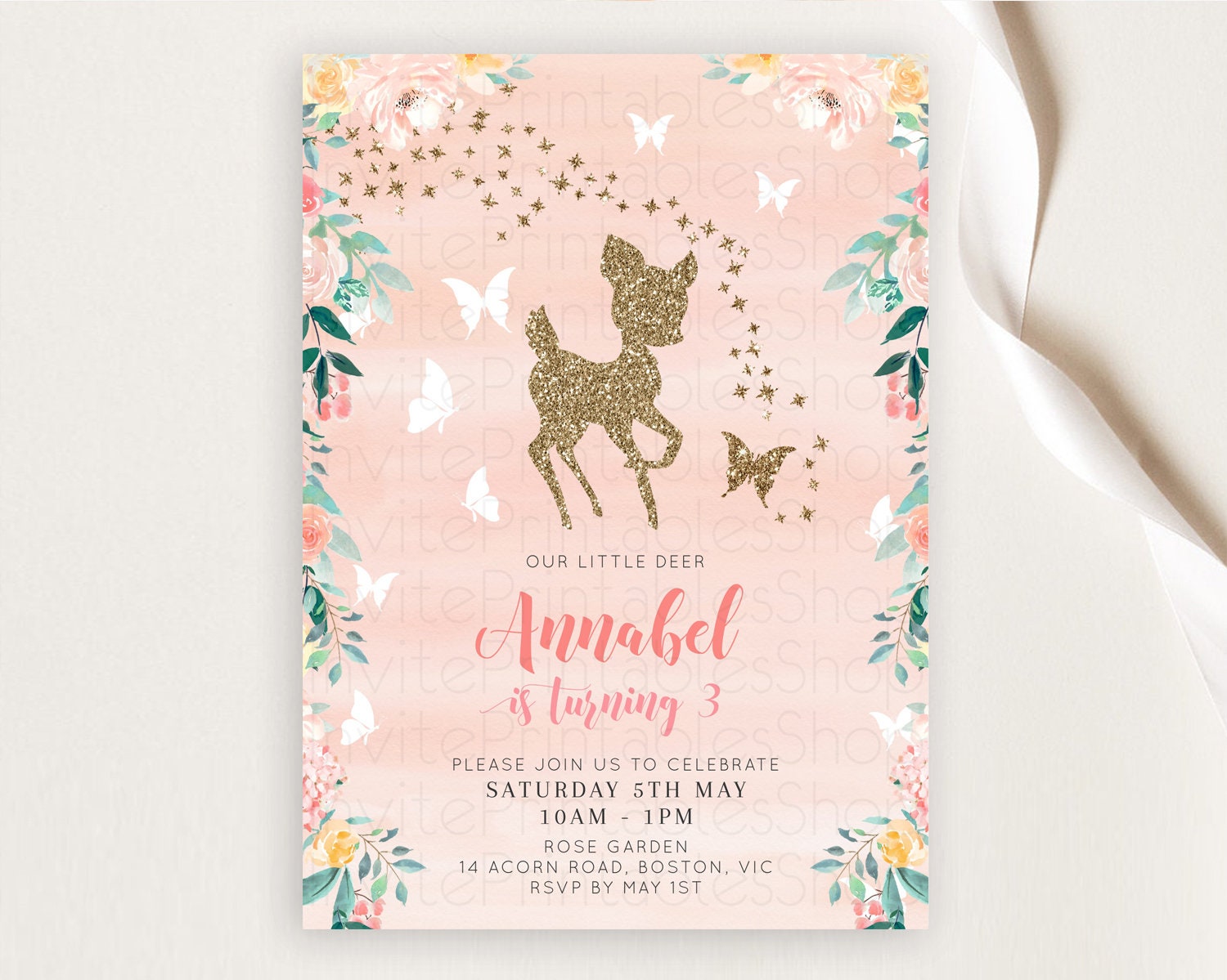 Fawn Birthday Invitation Deer Birthday Invitation Enchanted Forest Party Butterfly Pastel Flowers Whimsical 2nd 1st First Birthday D10873