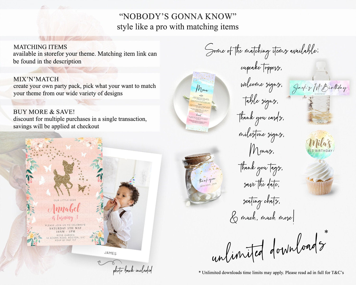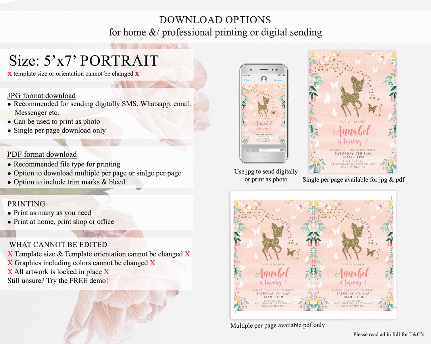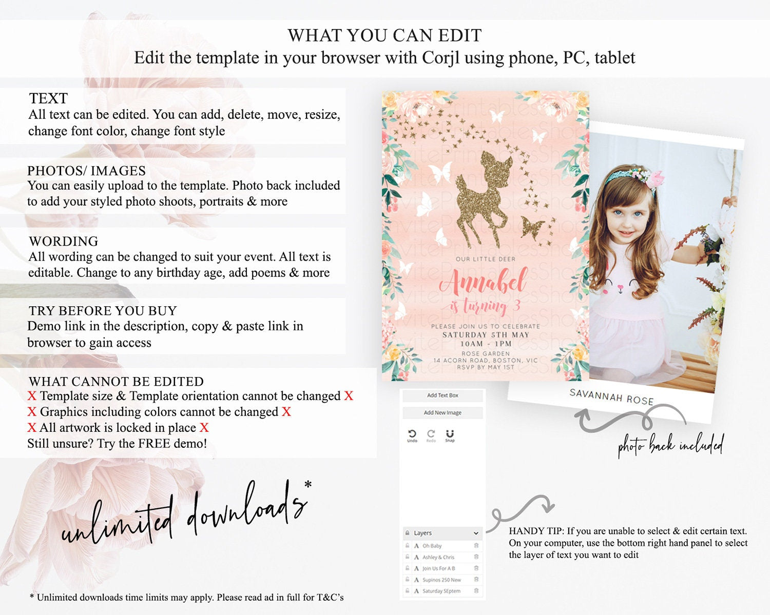 Fawn Birthday Invitation Deer Birthday Invitation Enchanted Forest Party Butterfly Pastel Flowers Whimsical 2nd 1st First Birthday D10873