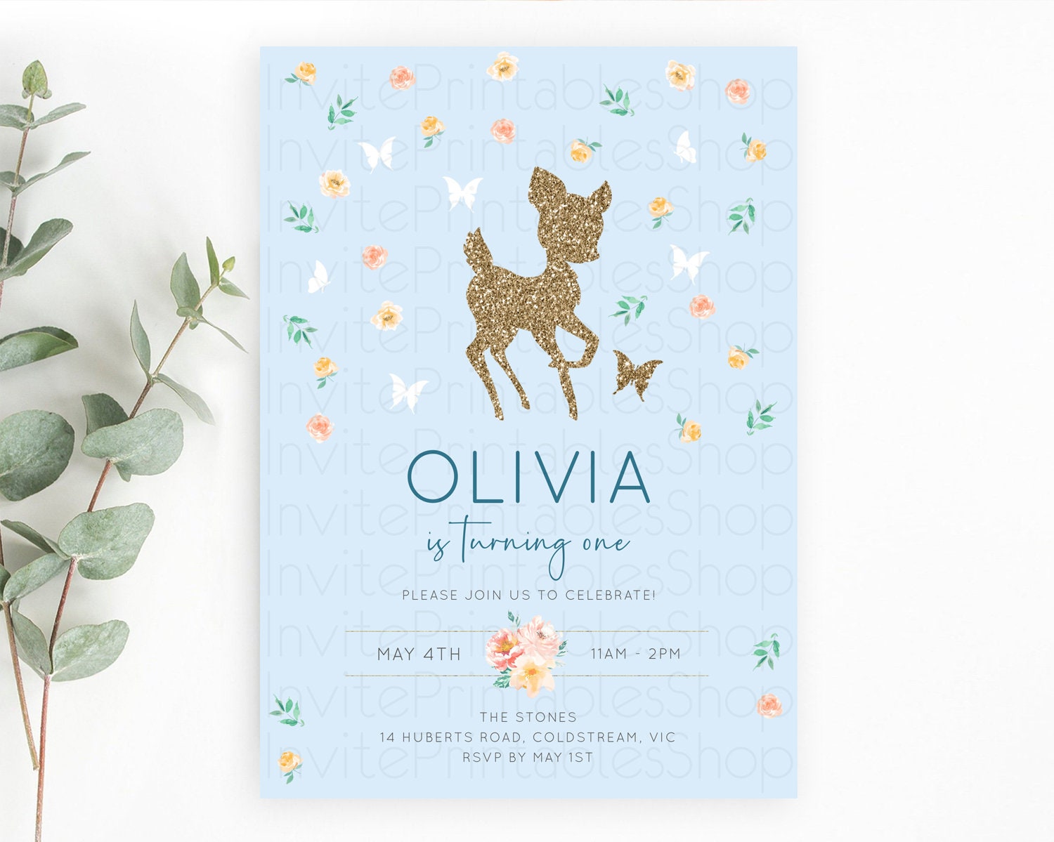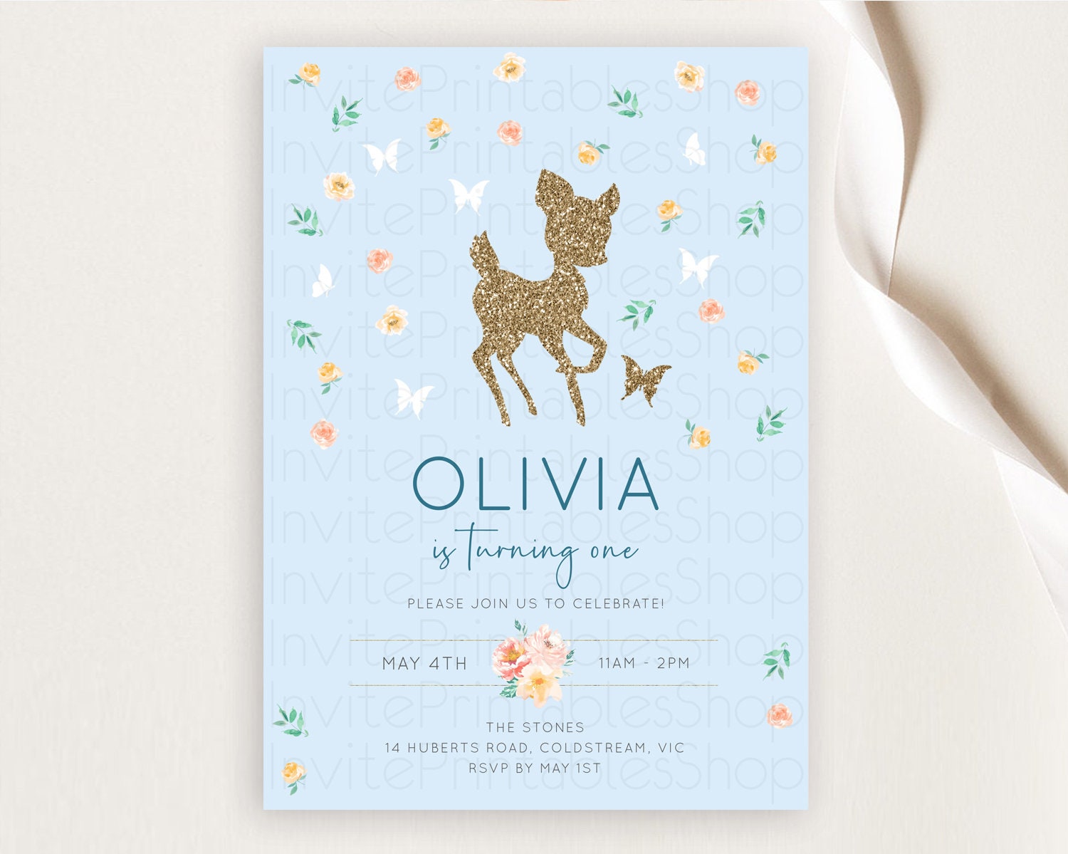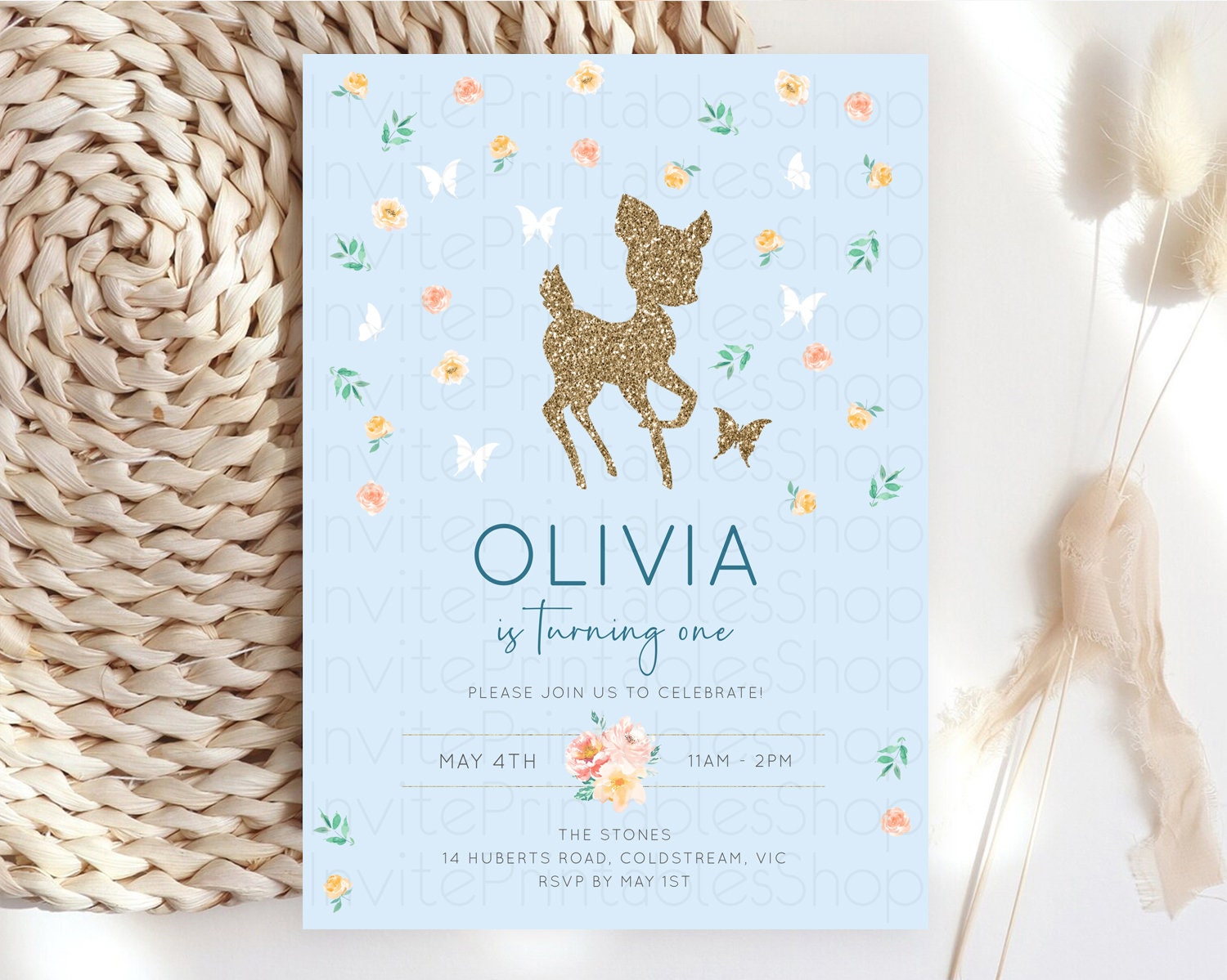 Fawn Birthday Invitation Deer Birthday Invitation Enchanted Forest Party Butterfly Pastel Flowers Whimsical 2nd 1st First Birthday D10902