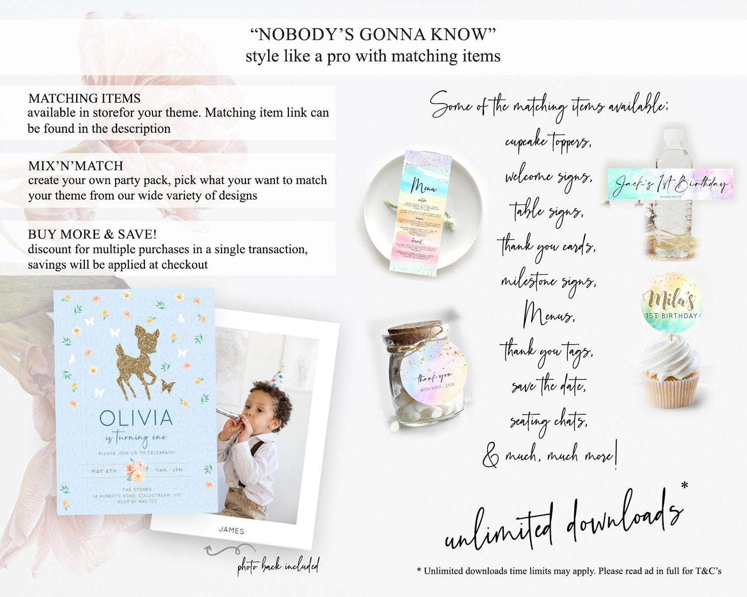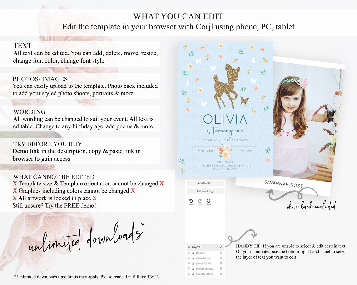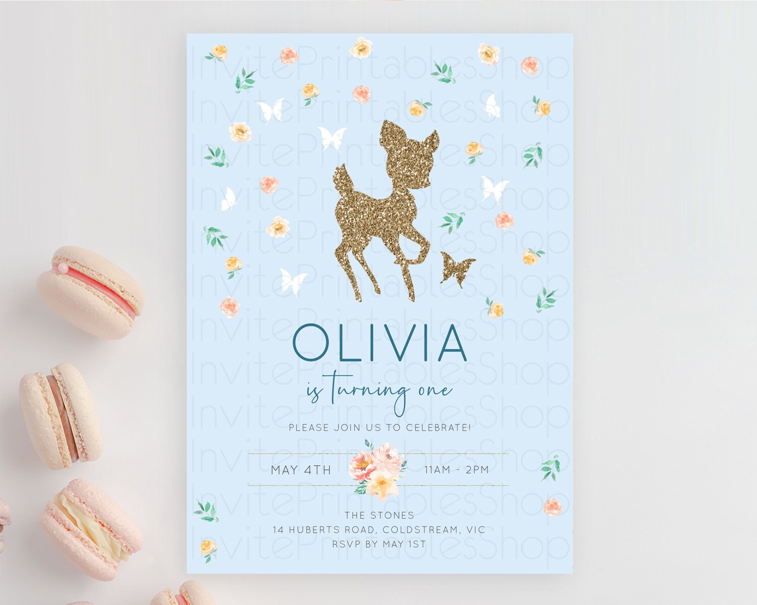 Fawn Birthday Invitation Deer Birthday Invitation Enchanted Forest Party Butterfly Pastel Flowers Whimsical 2nd 1st First Birthday D10902