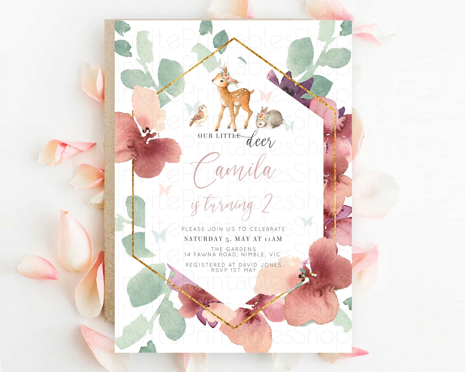 Fawn Birthday Invitation Deer Birthday Invitation Enchanted Forest Party Butterfly Pastel Flowers Whimsical 2nd 1st First Birthday D10913