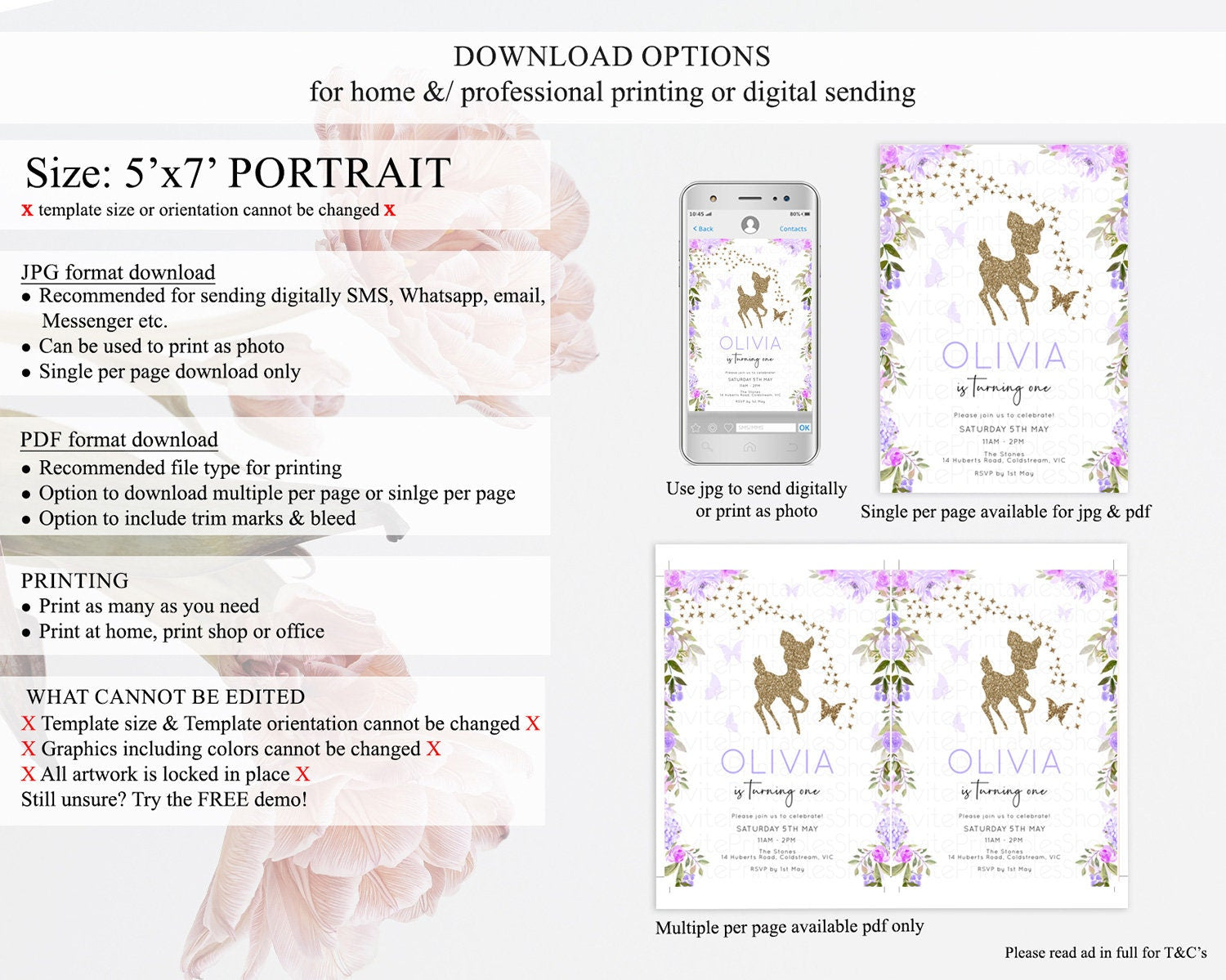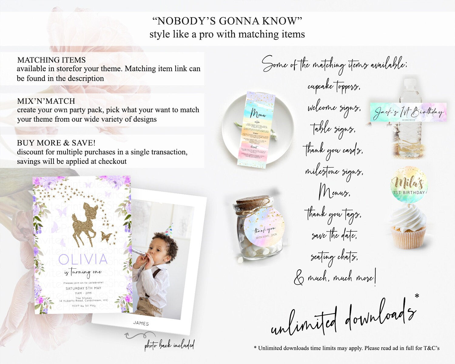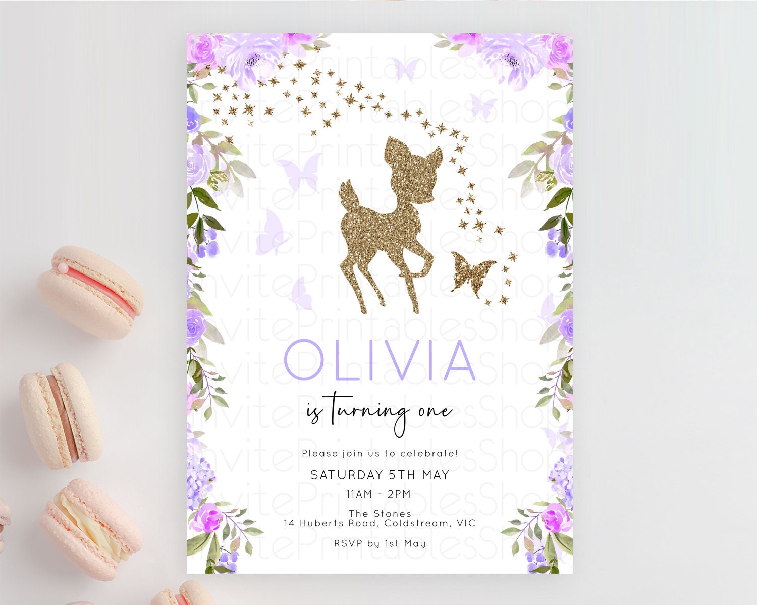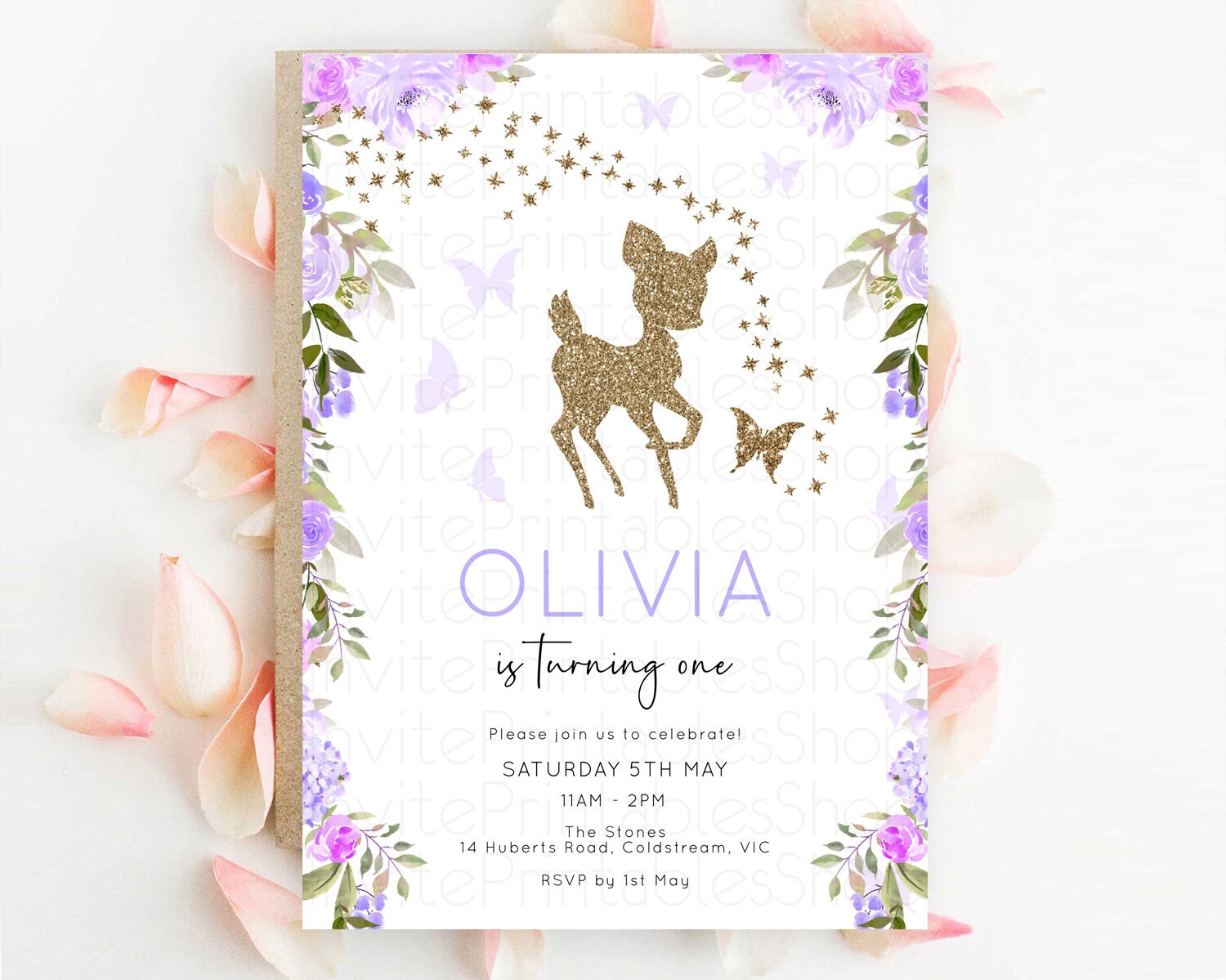Fawn Birthday Invitation Deer Birthday Invitation Enchanted Forest Party Butterfly Pastel Flowers Whimsical 2nd 1st First Birthday D10914
