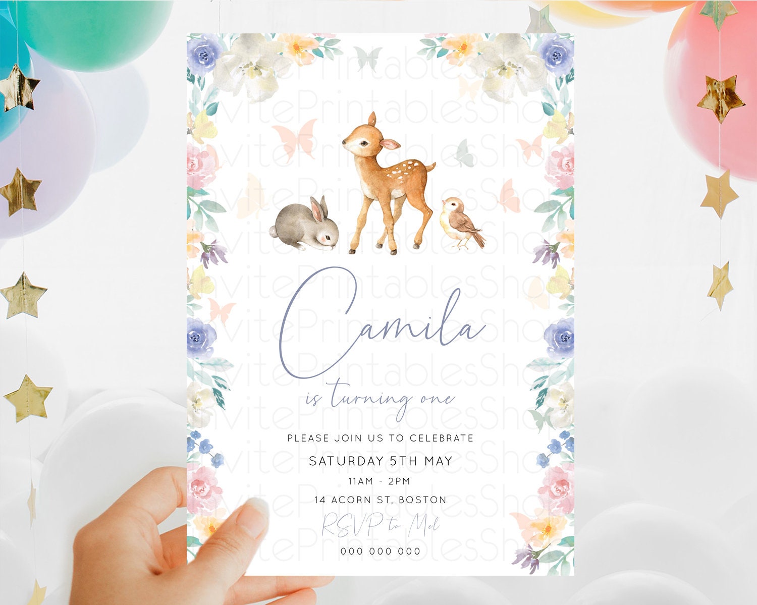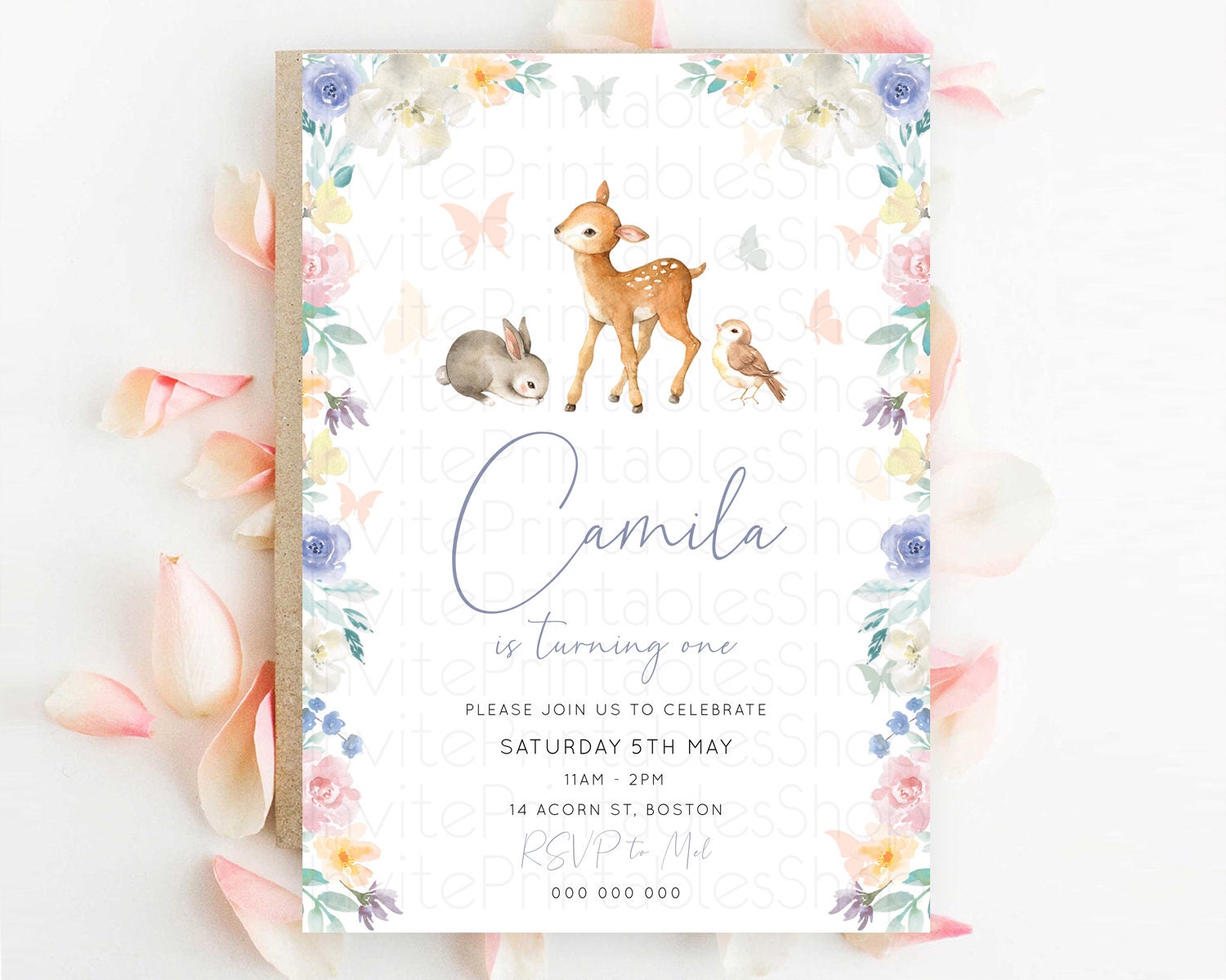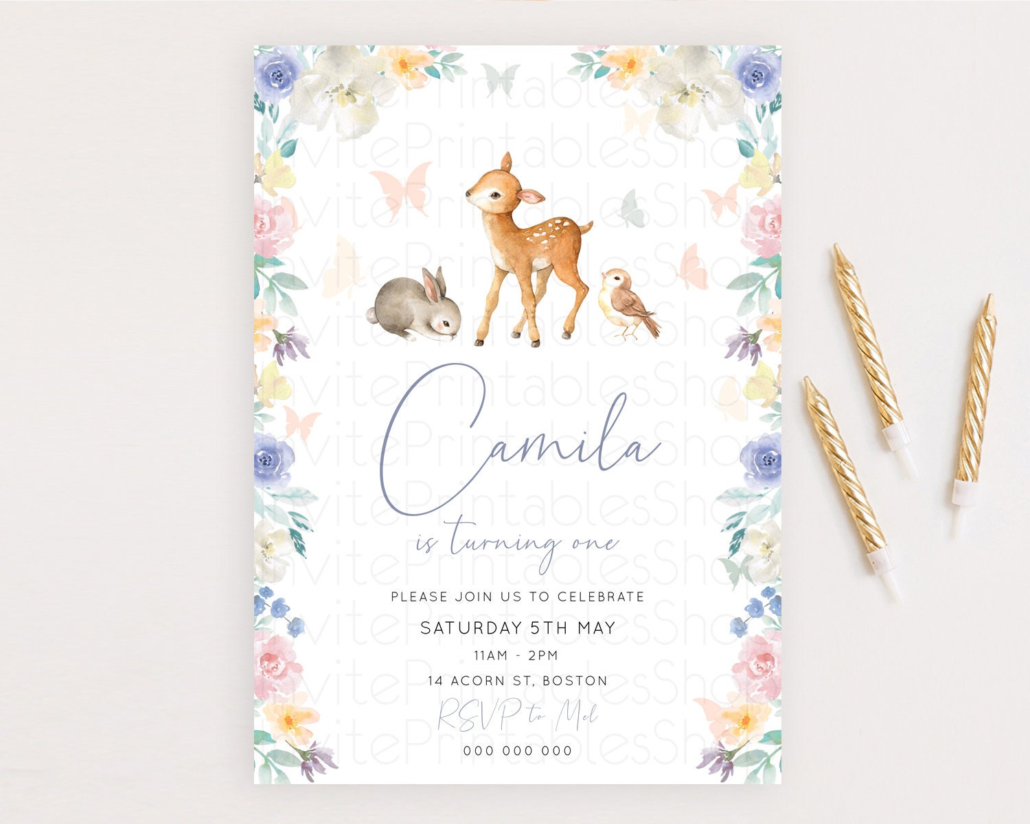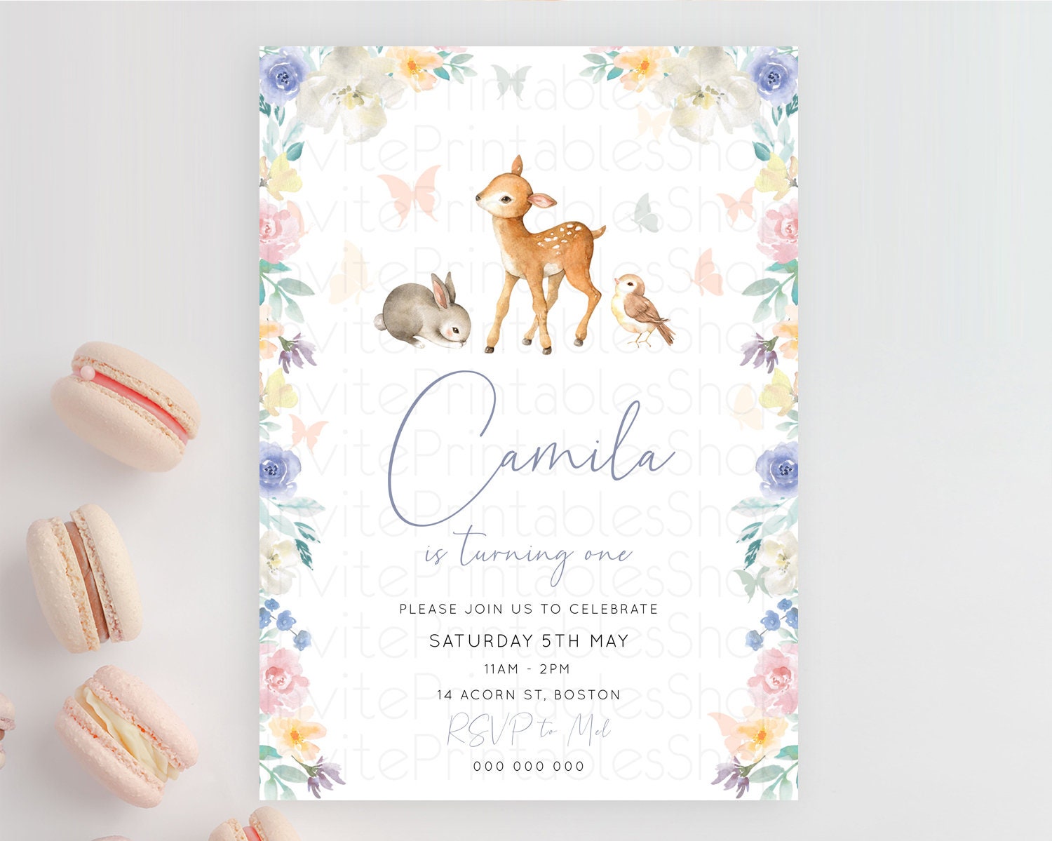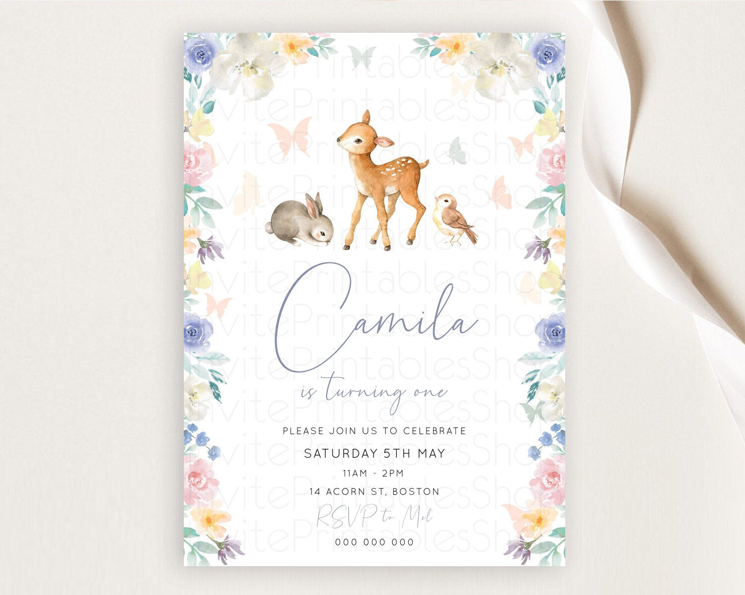 Fawn Birthday Invitation Deer Birthday Invitation Enchanted Forest Party Butterfly Pastel Flowers Whimsical 2nd 1st First Birthday D10930