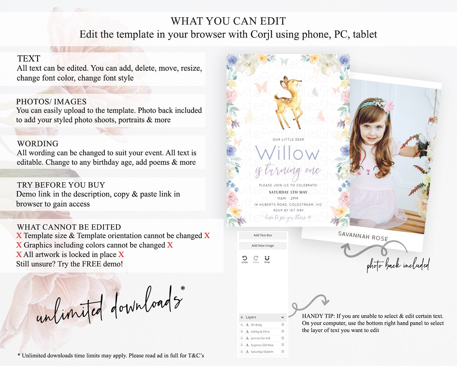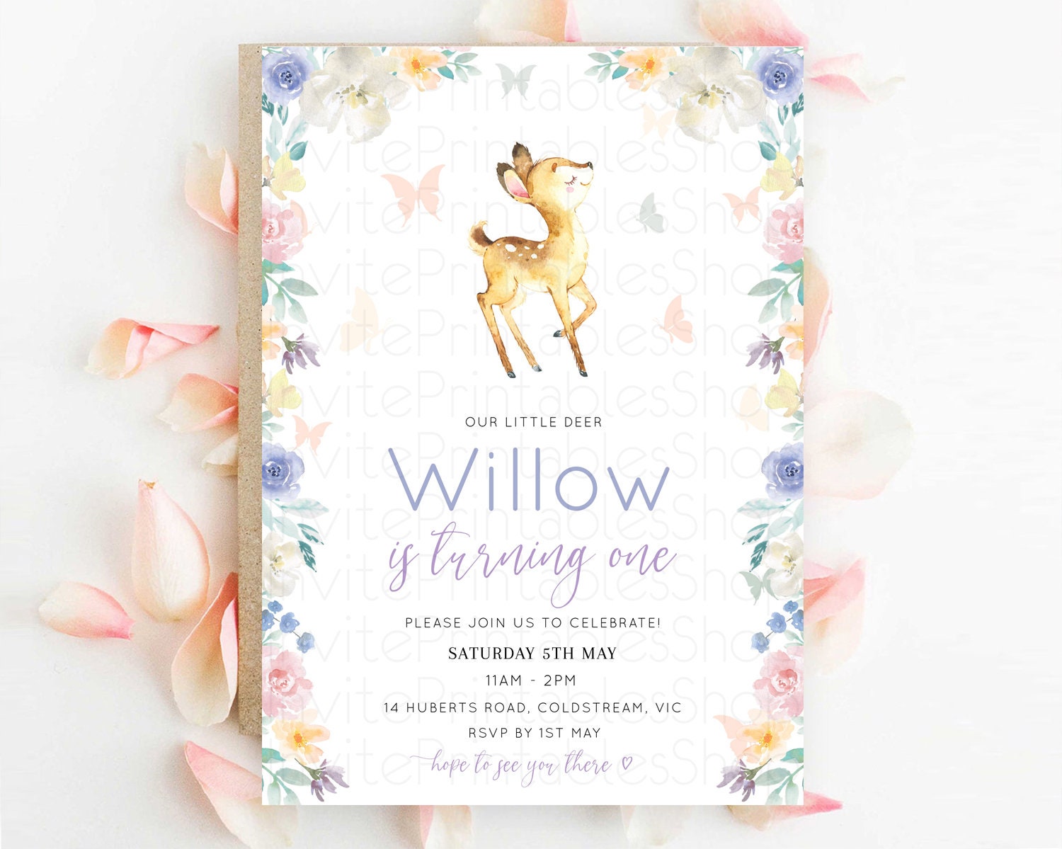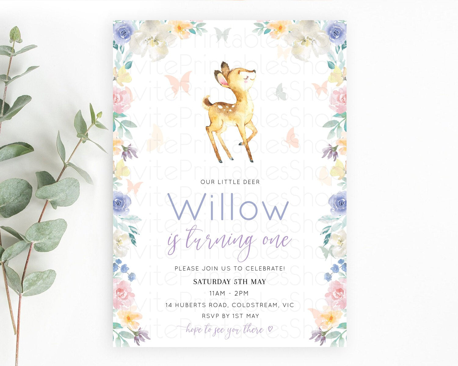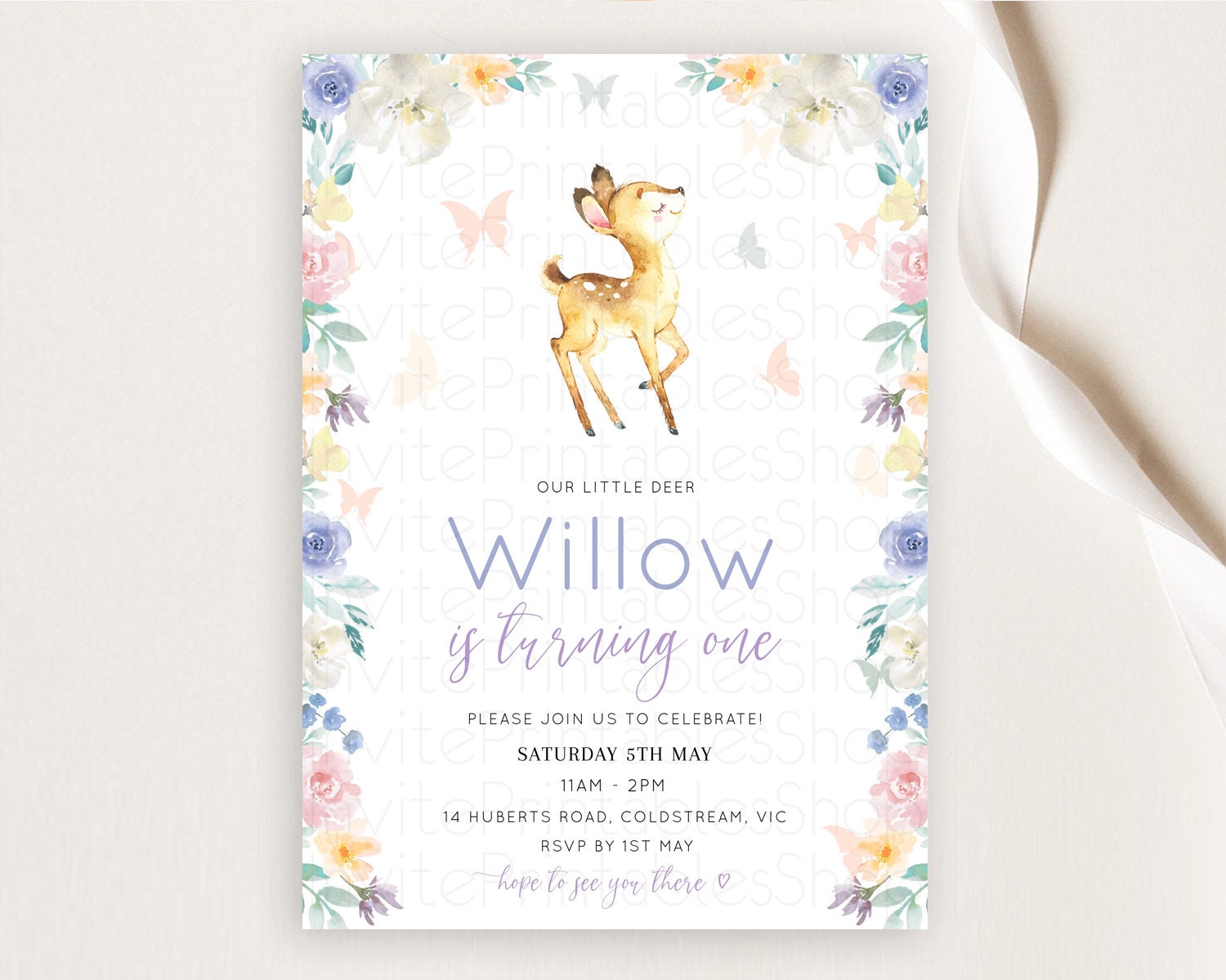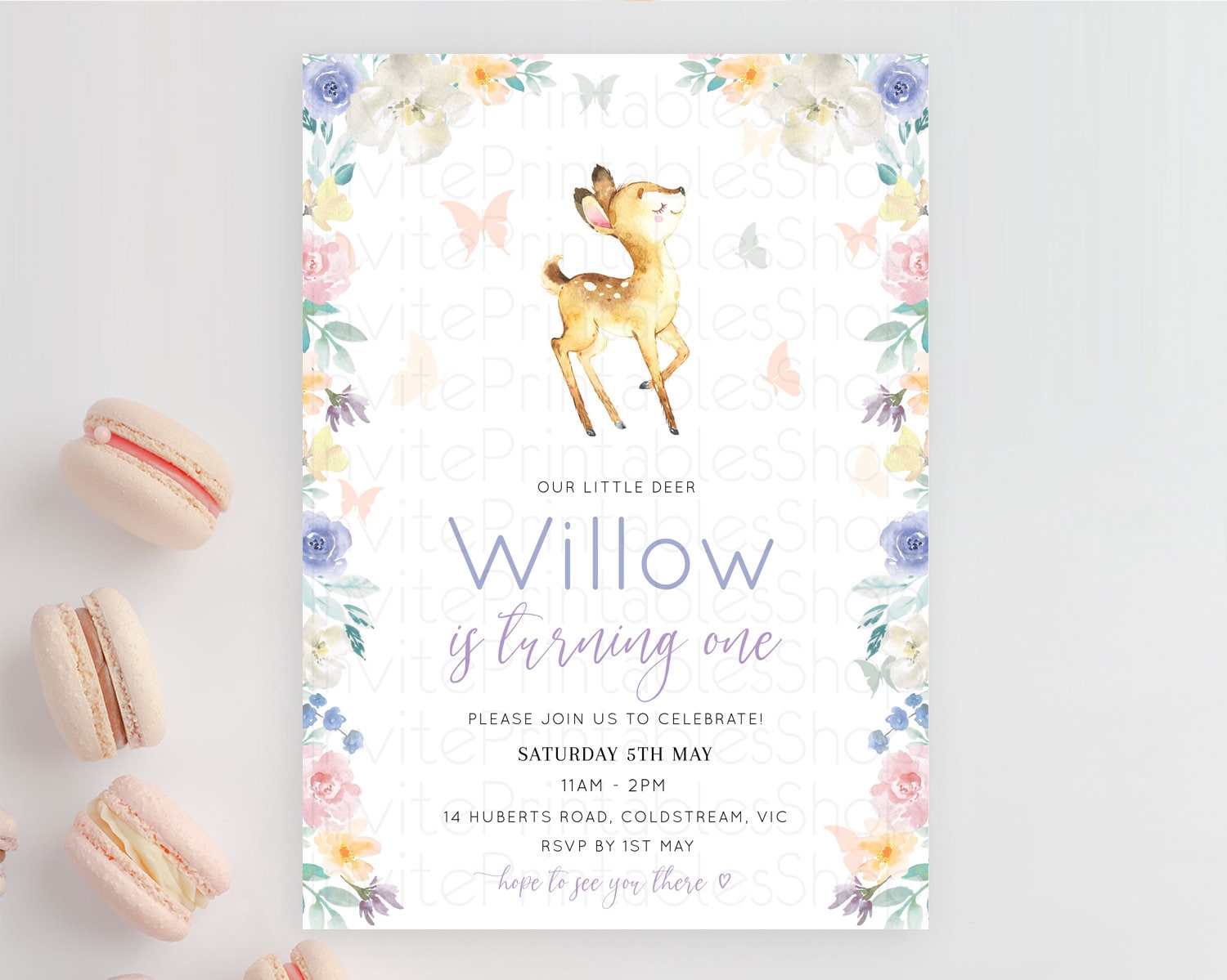 Fawn Birthday Invitation Deer Birthday Invitation Enchanted Forest Party Butterfly Pastel Flowers Whimsical 2nd 1st First Birthday D10965