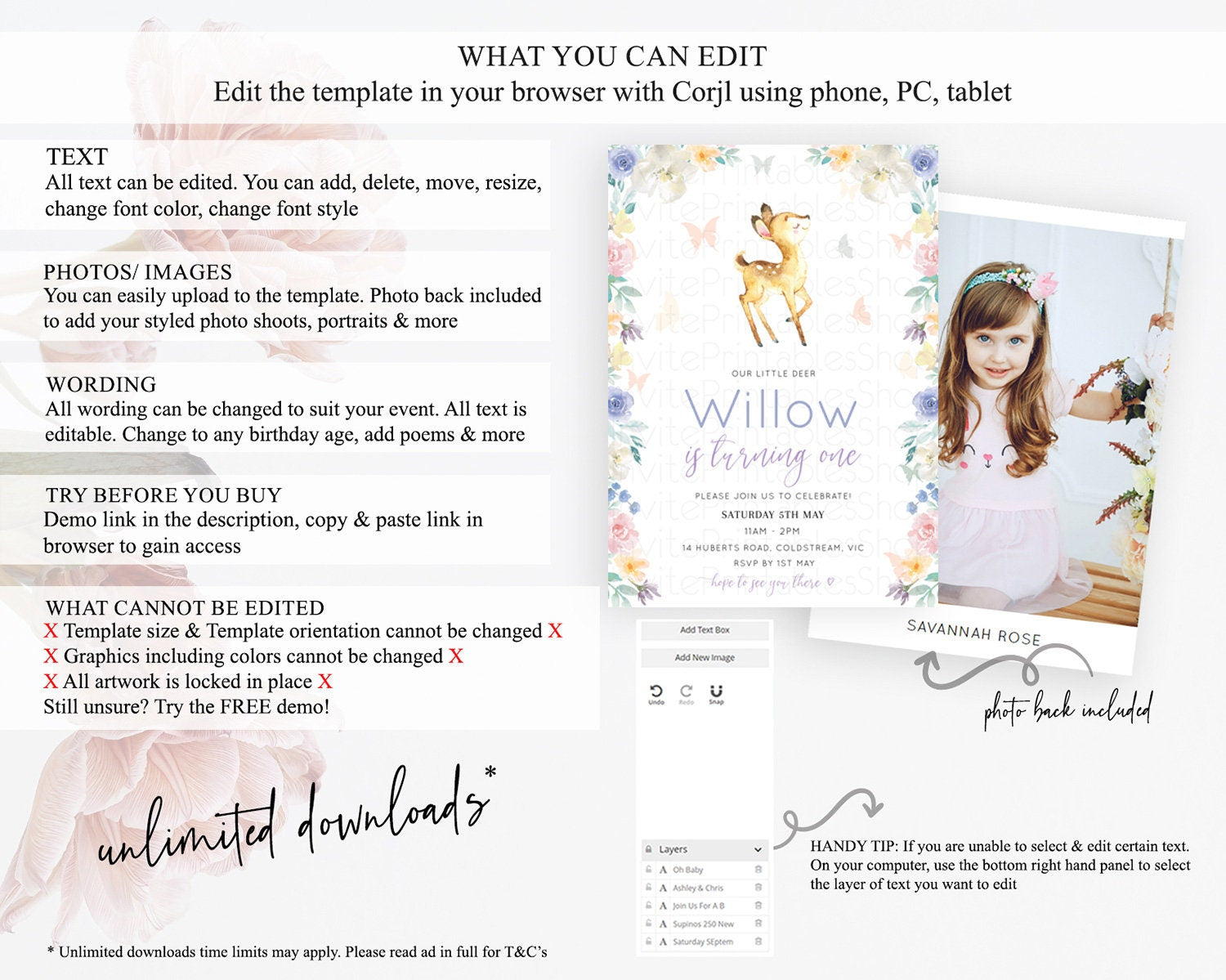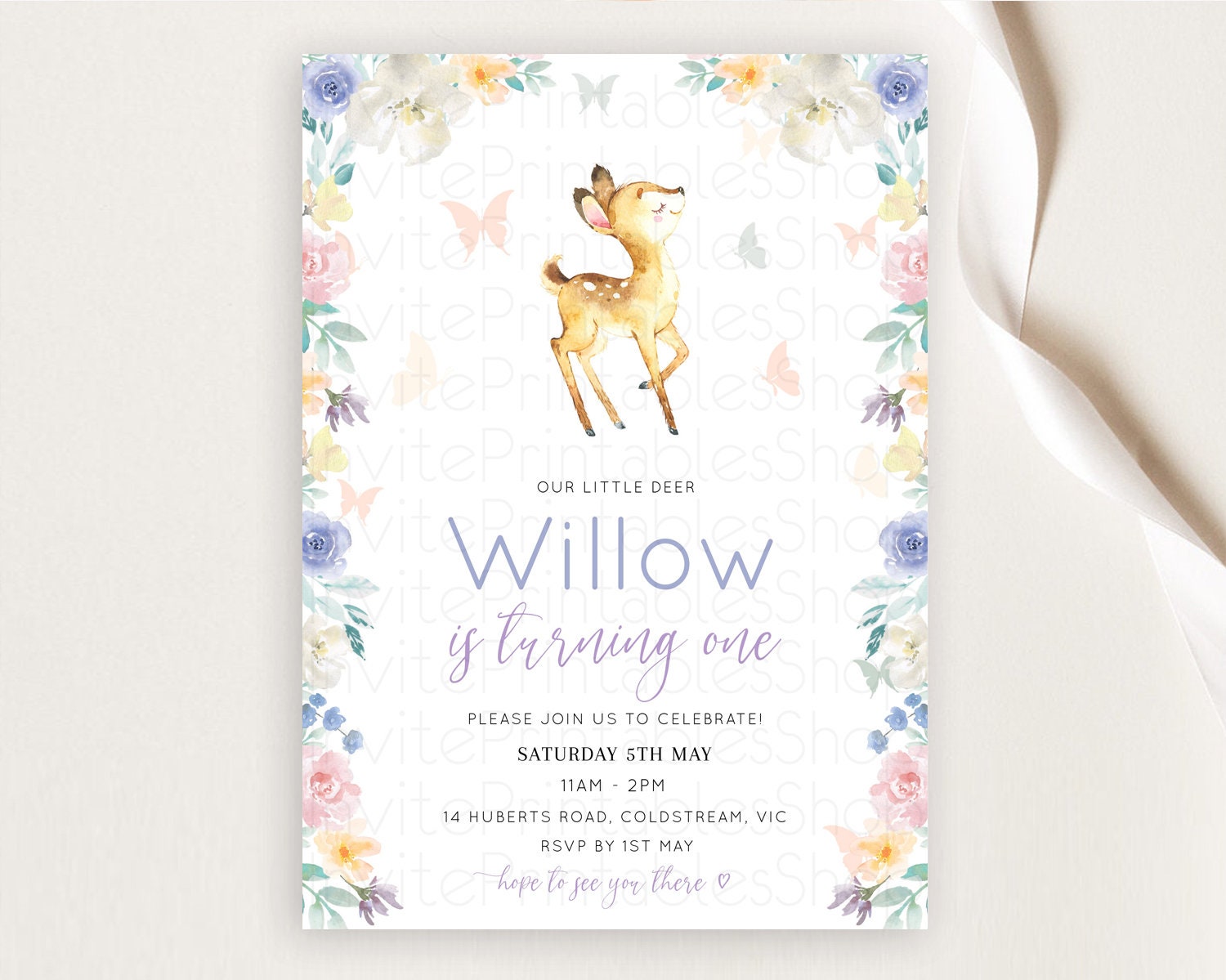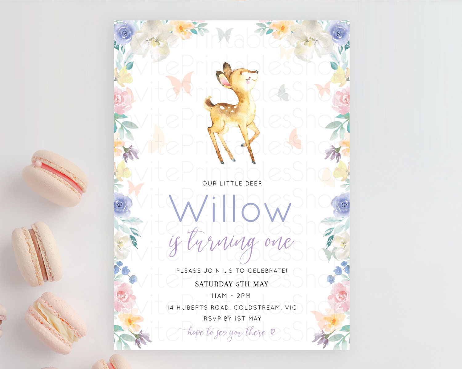 Fawn Birthday Invitation Deer Birthday Invitation Enchanted Forest Party Butterfly Pastel Flowers Whimsical 2nd 1st First Birthday D11001