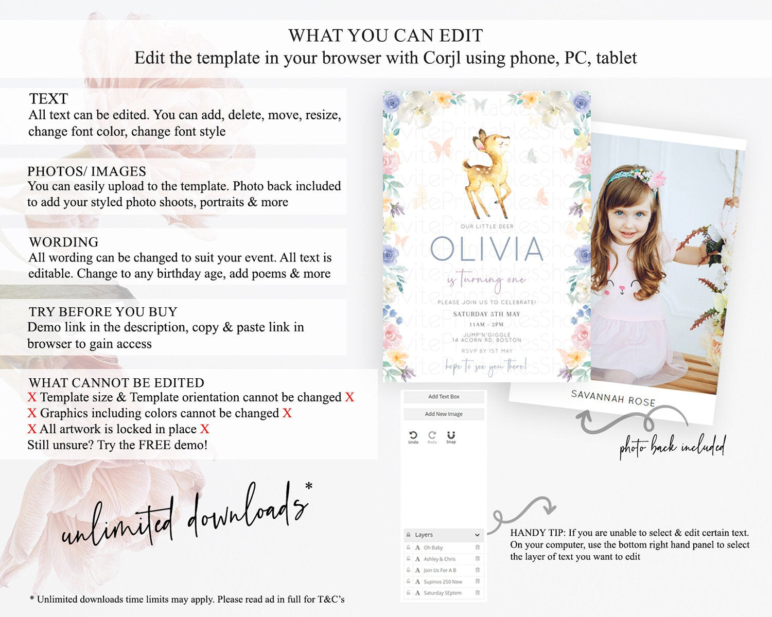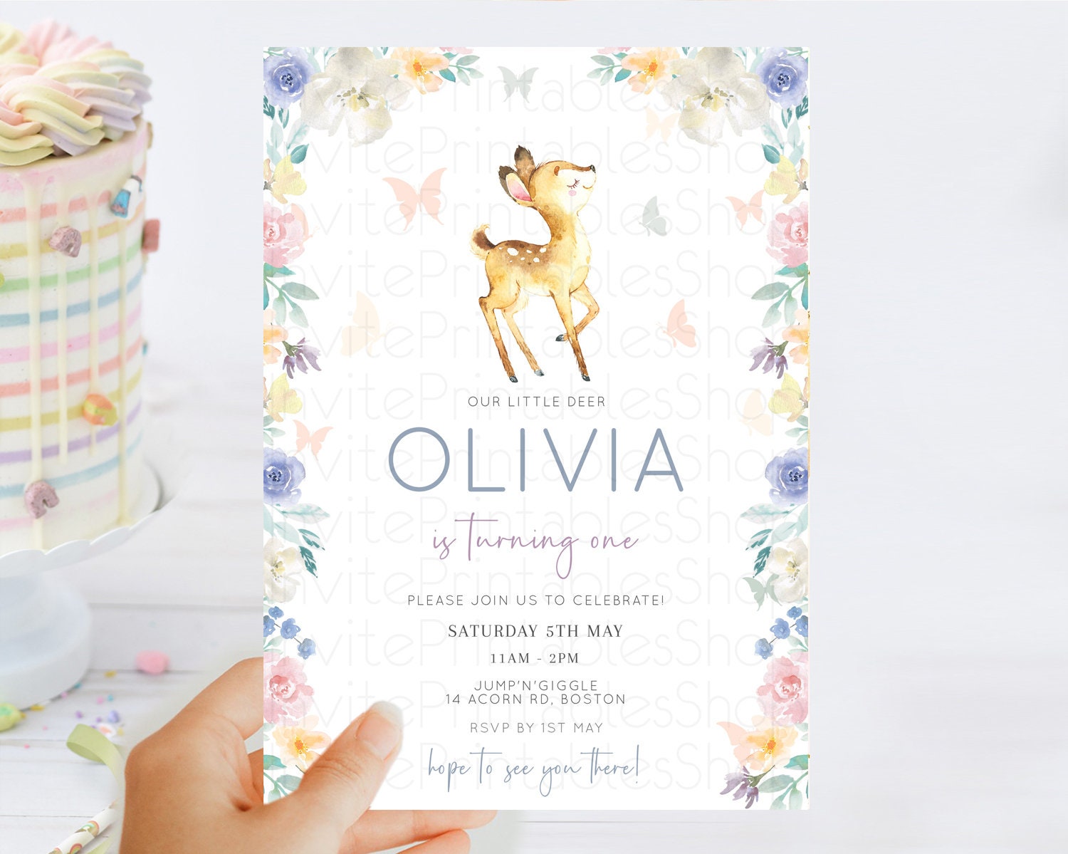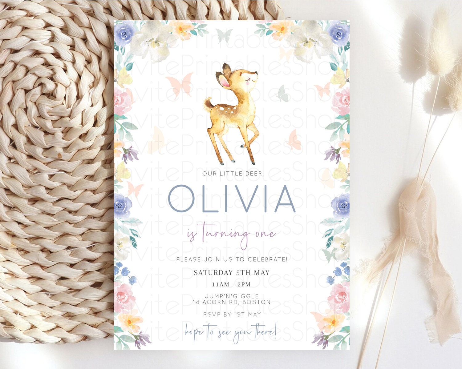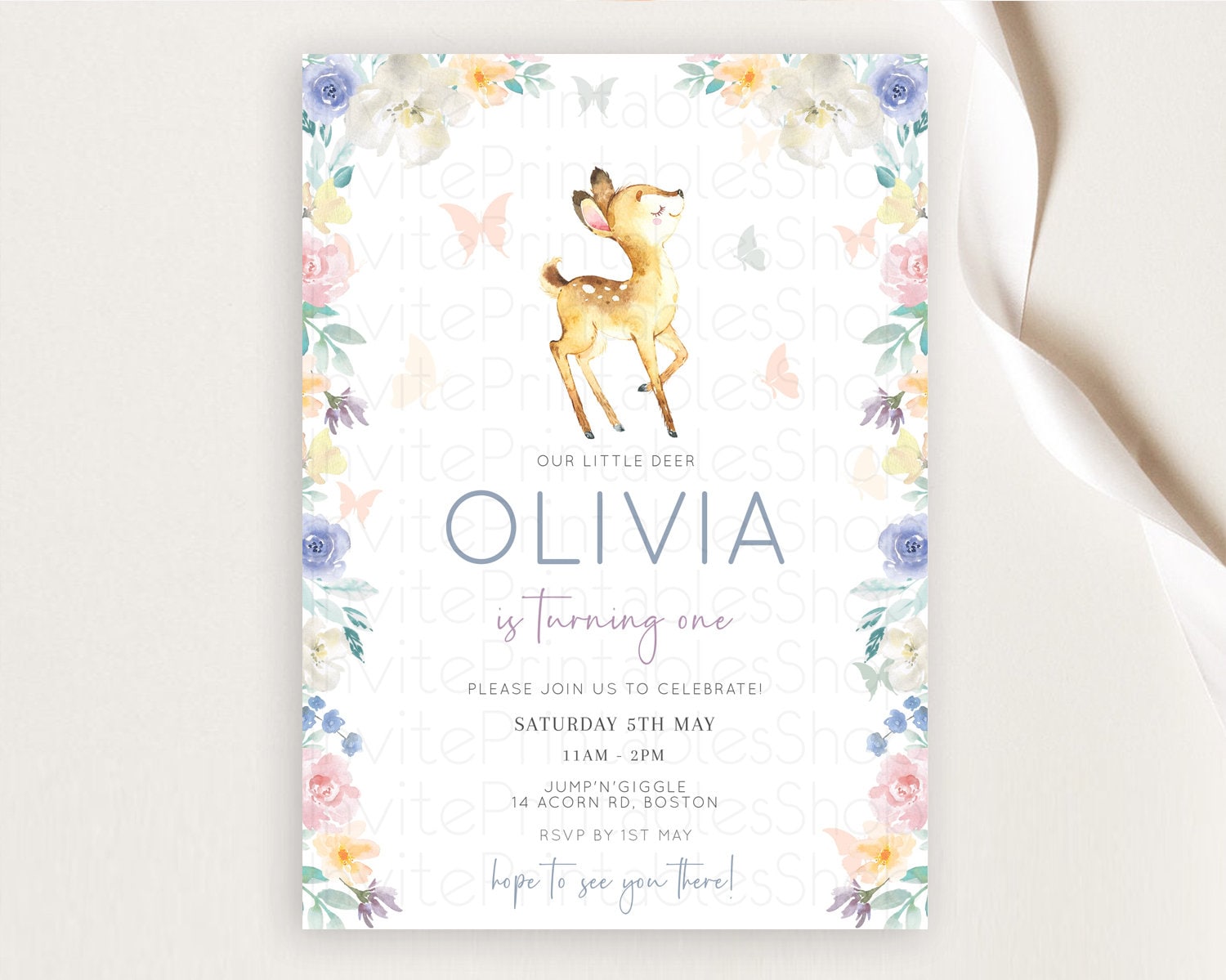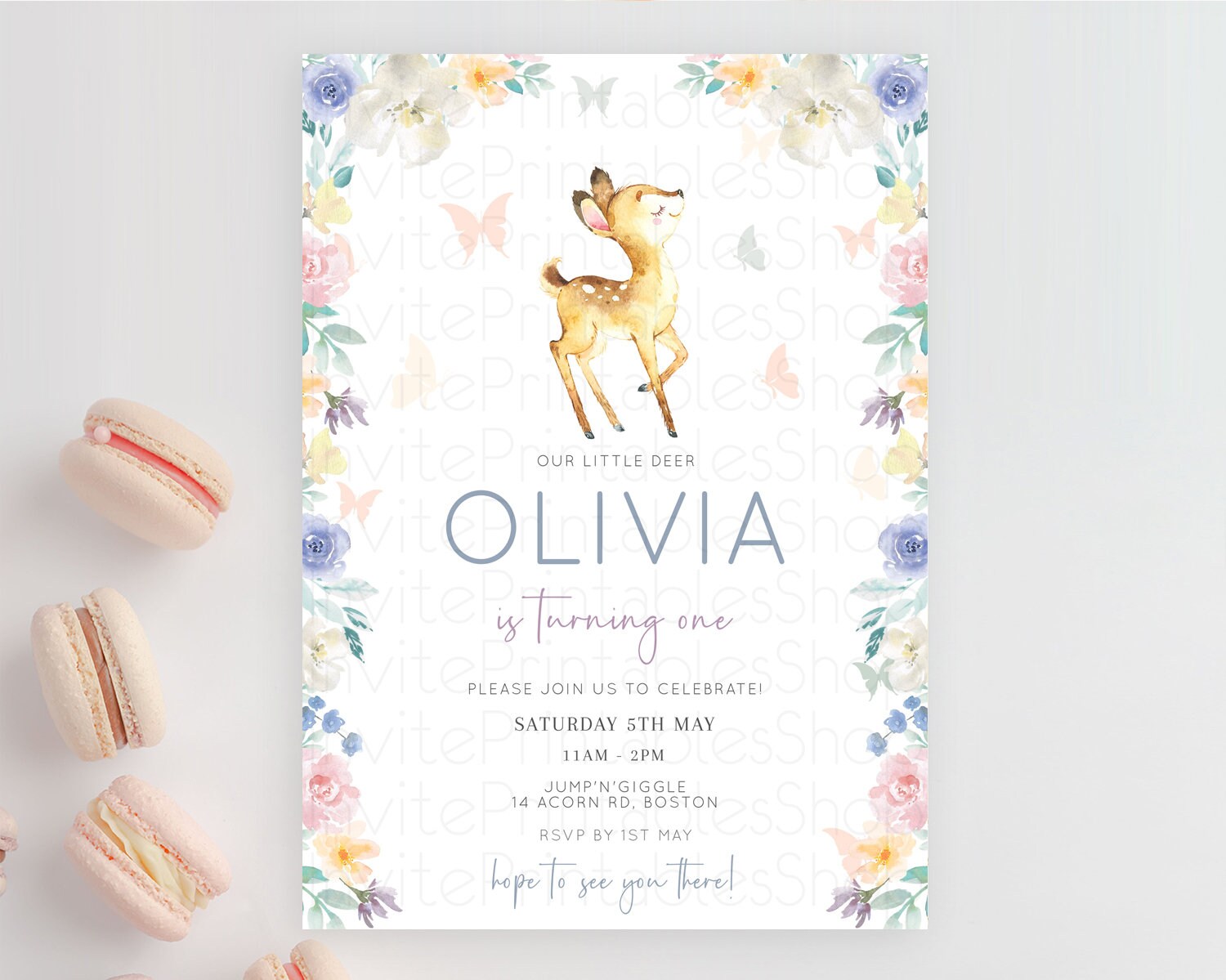 Fawn Birthday Invitation Deer Birthday Invitation Enchanted Forest Party Butterfly Pastel Flowers Whimsical 2nd 1st First Birthday D11035