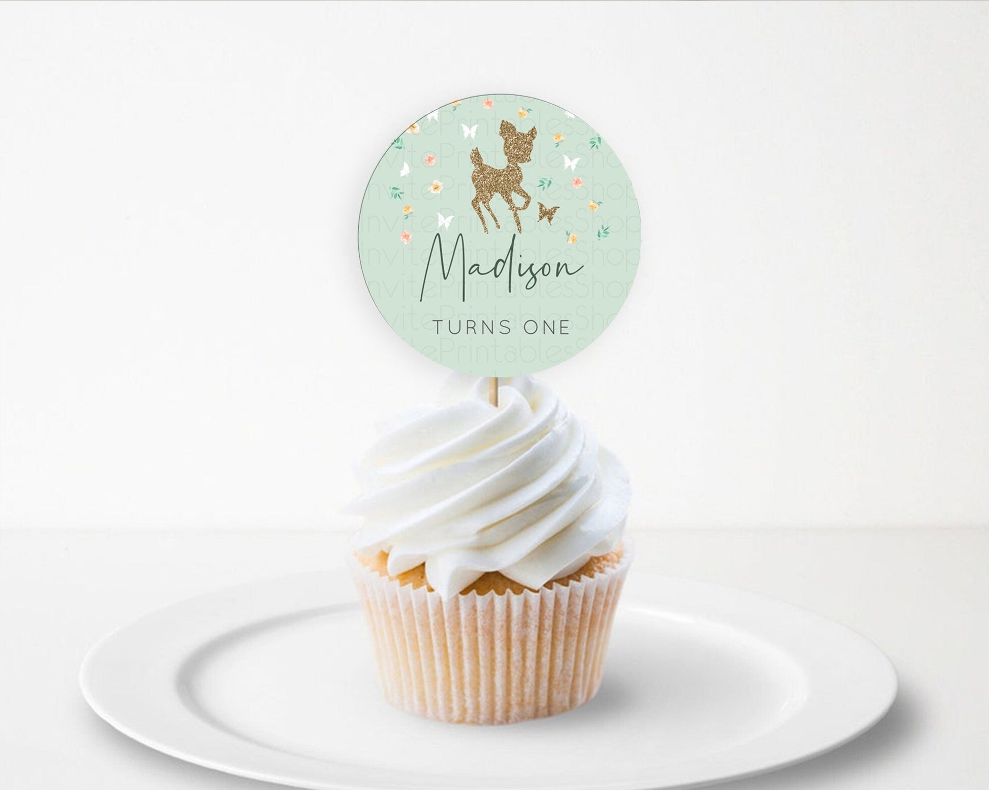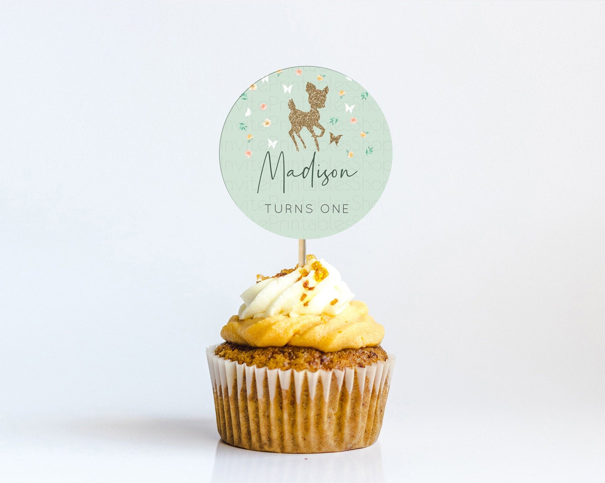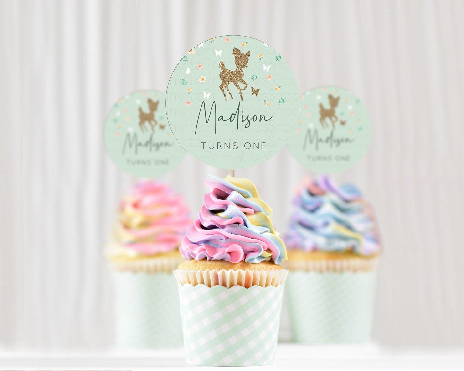 Fawn Cupcake Toppers Deer Cupcake Toppers Enchanted Forest Party Butterfly Pastel Flowers Woofland Cupcake Toppers First Birthday D10385