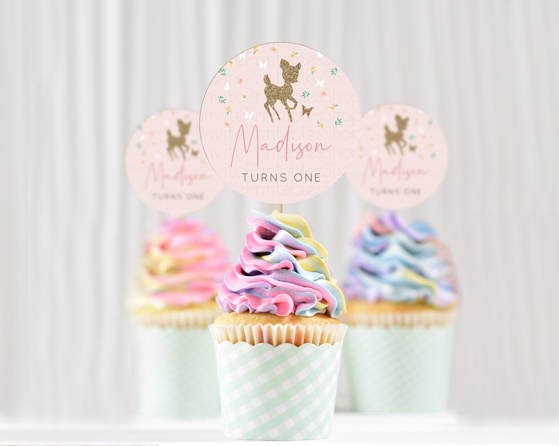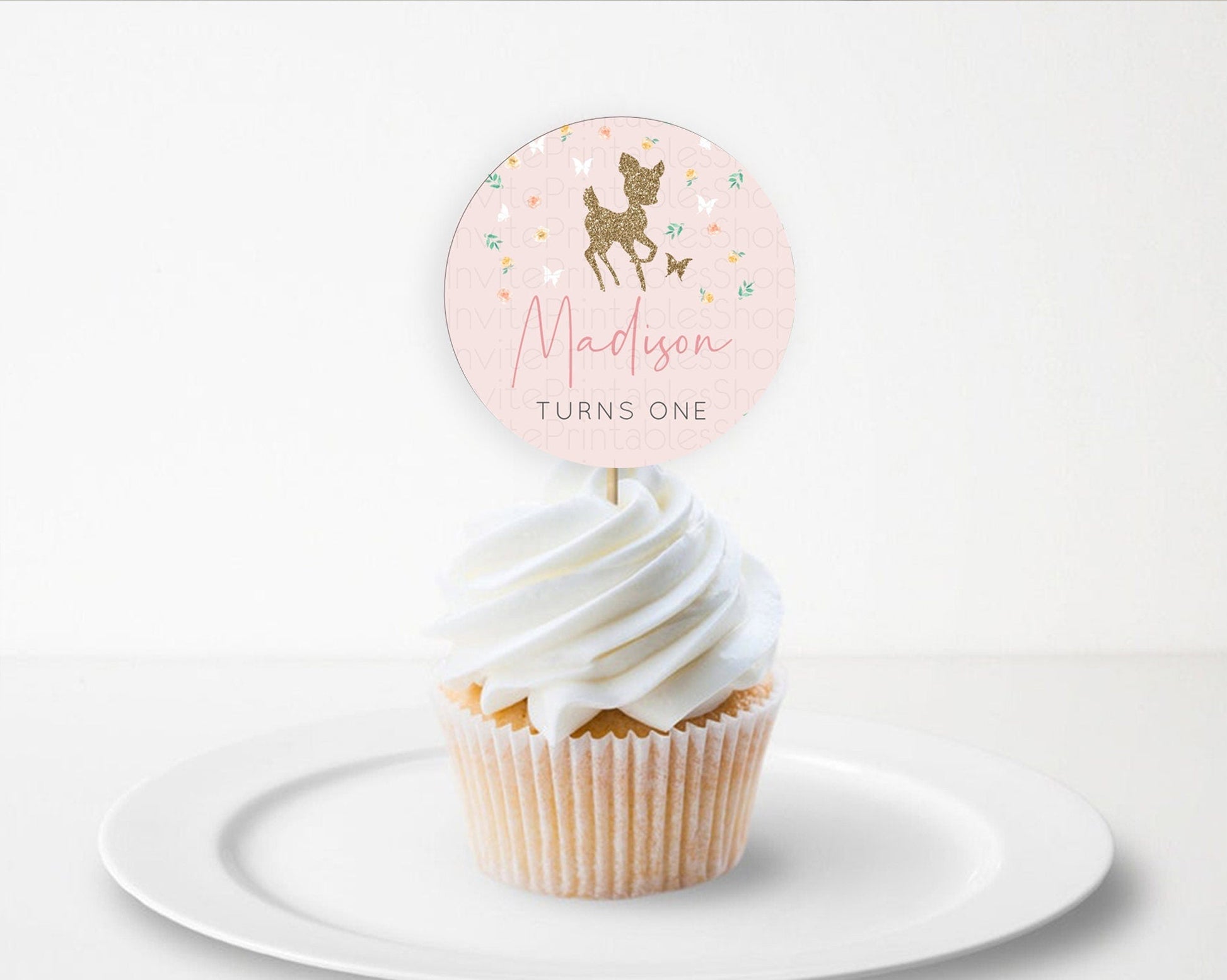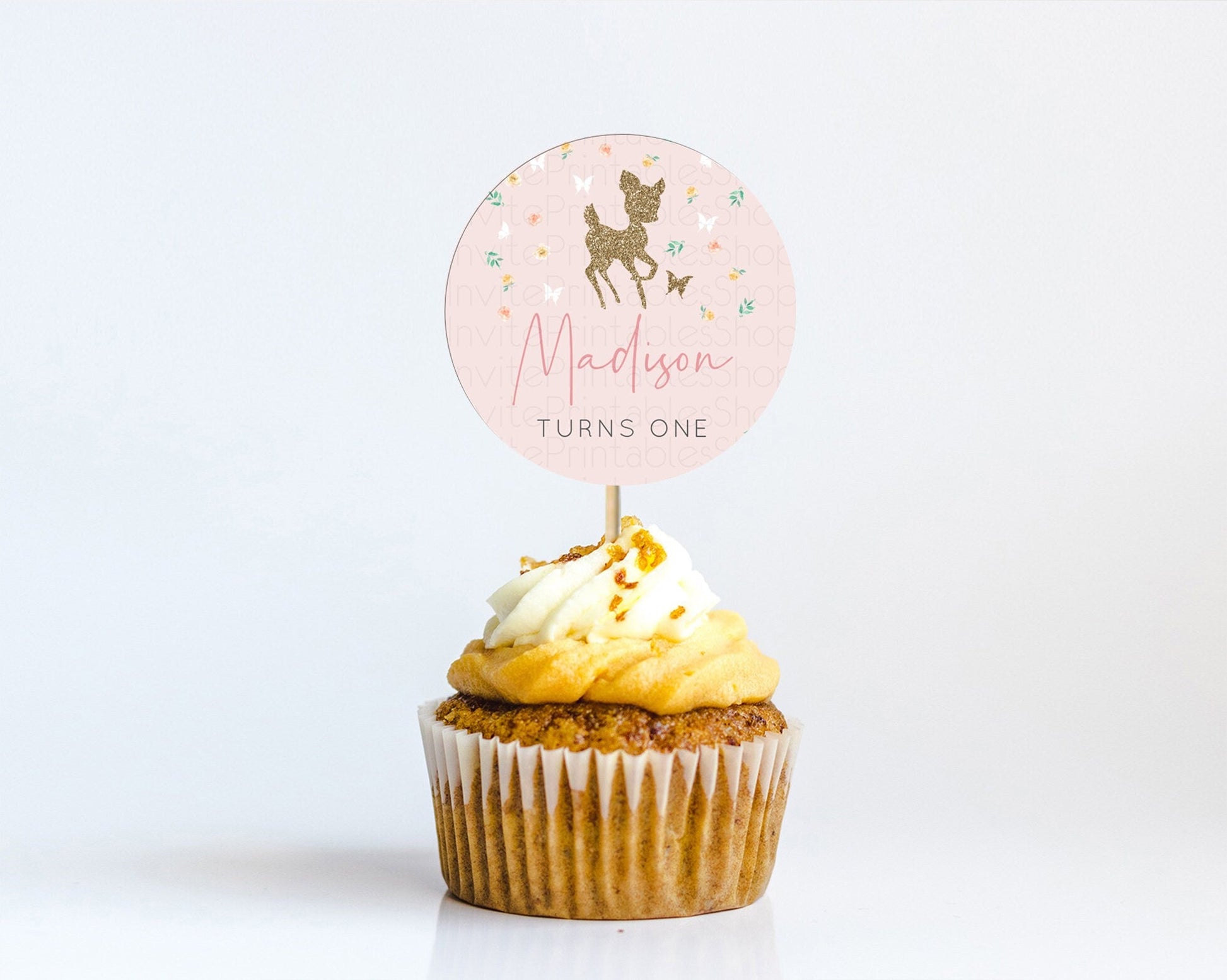 Fawn Cupcake Toppers Deer Cupcake Toppers Enchanted Forest Party Butterfly Pastel Flowers Woofland Cupcake Toppers First Birthday D10386