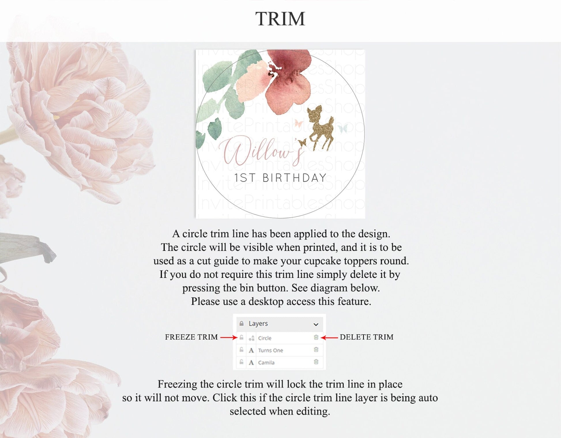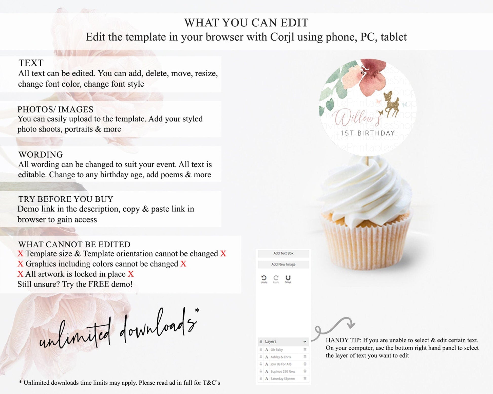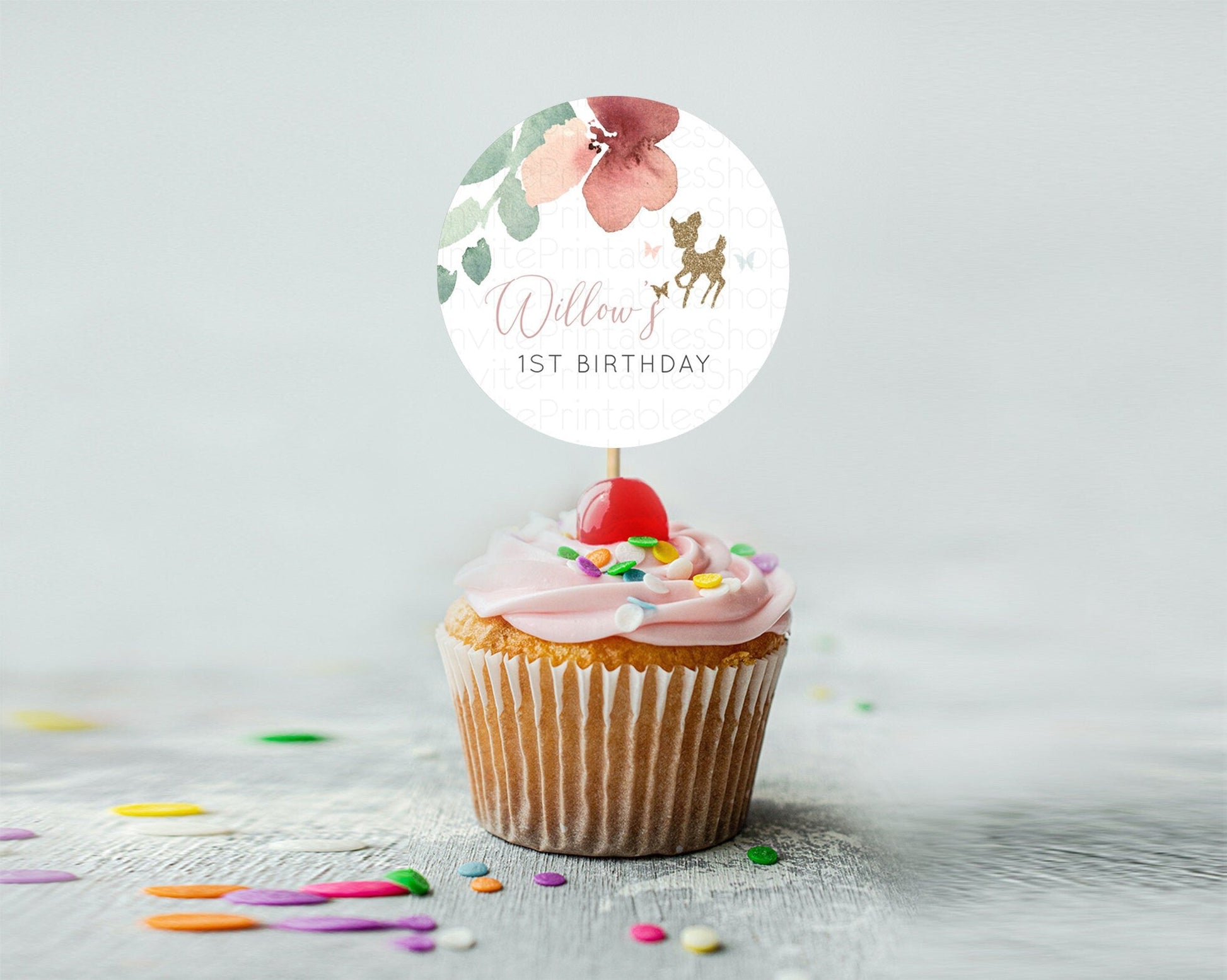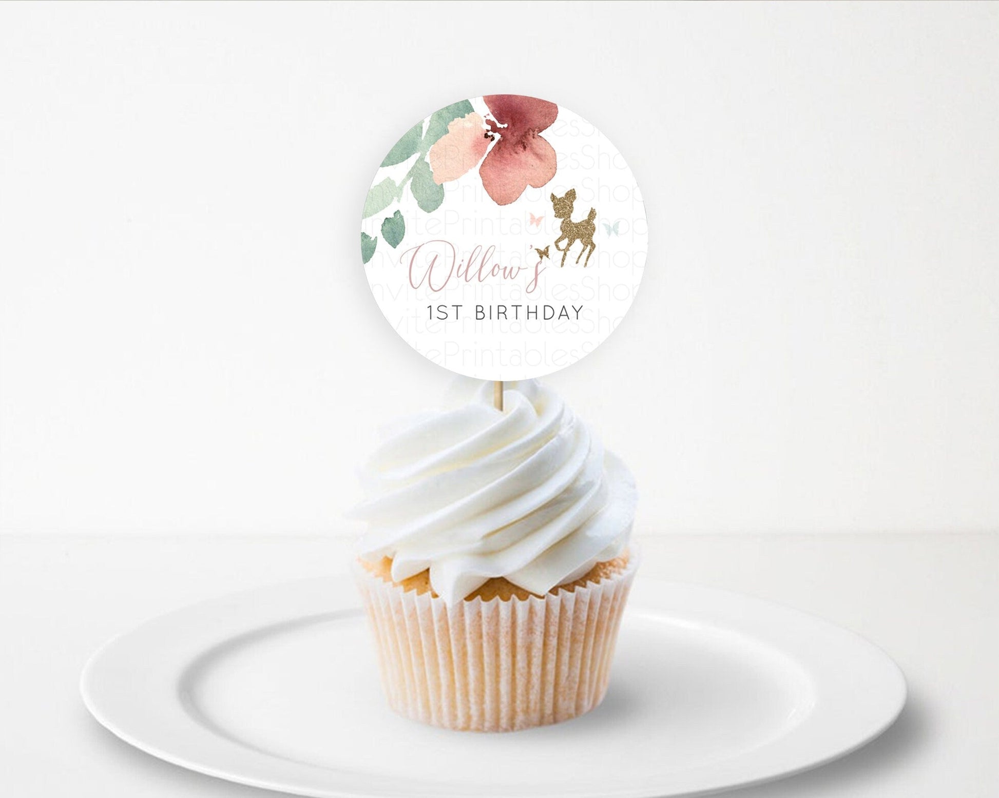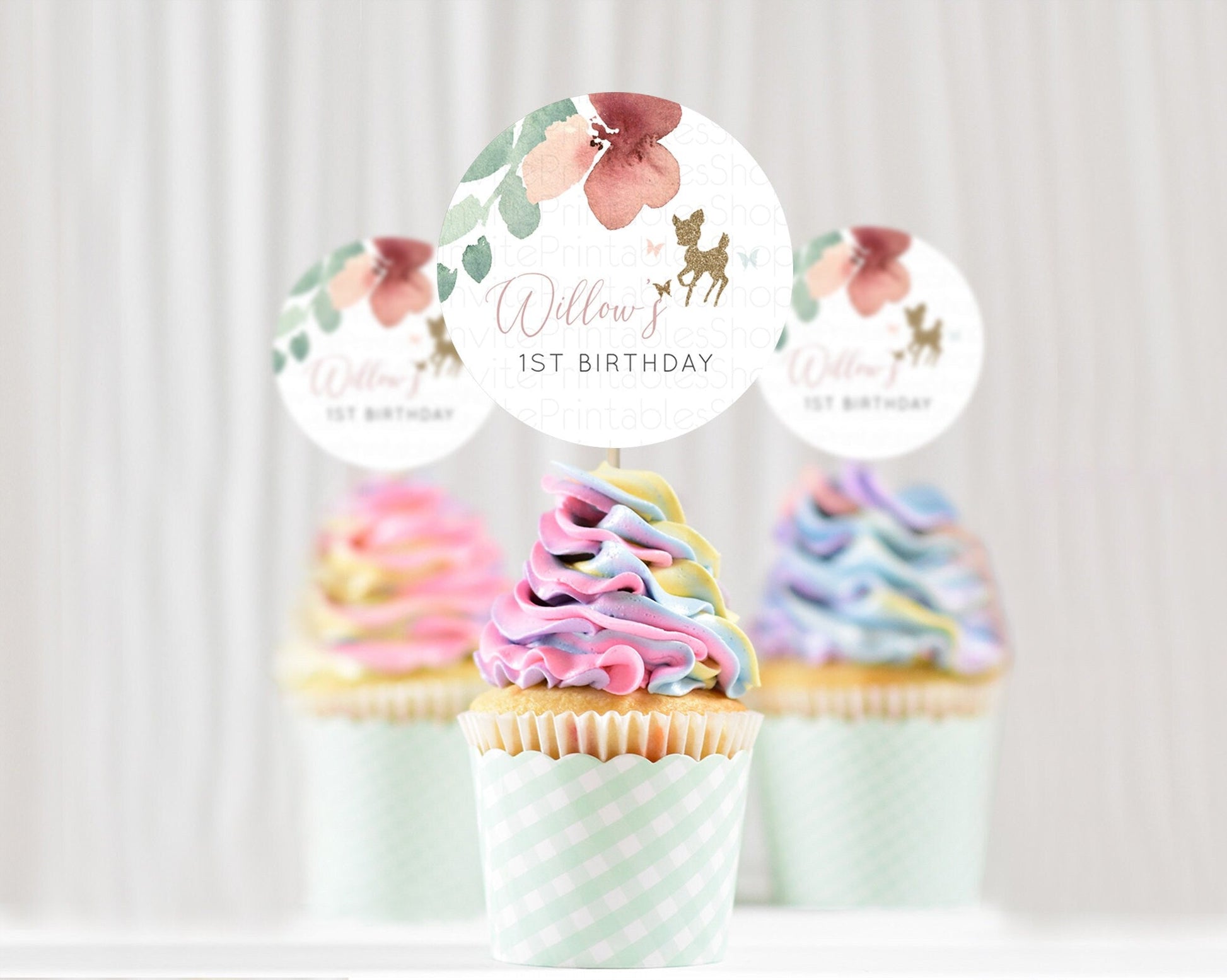 Fawn Cupcake Toppers Deer Cupcake Toppers Enchanted Forest Party Butterfly Pastel Flowers Woofland Cupcake Toppers First Birthday D10459