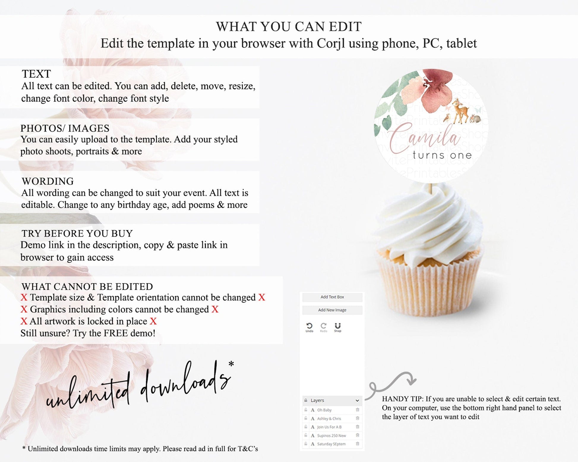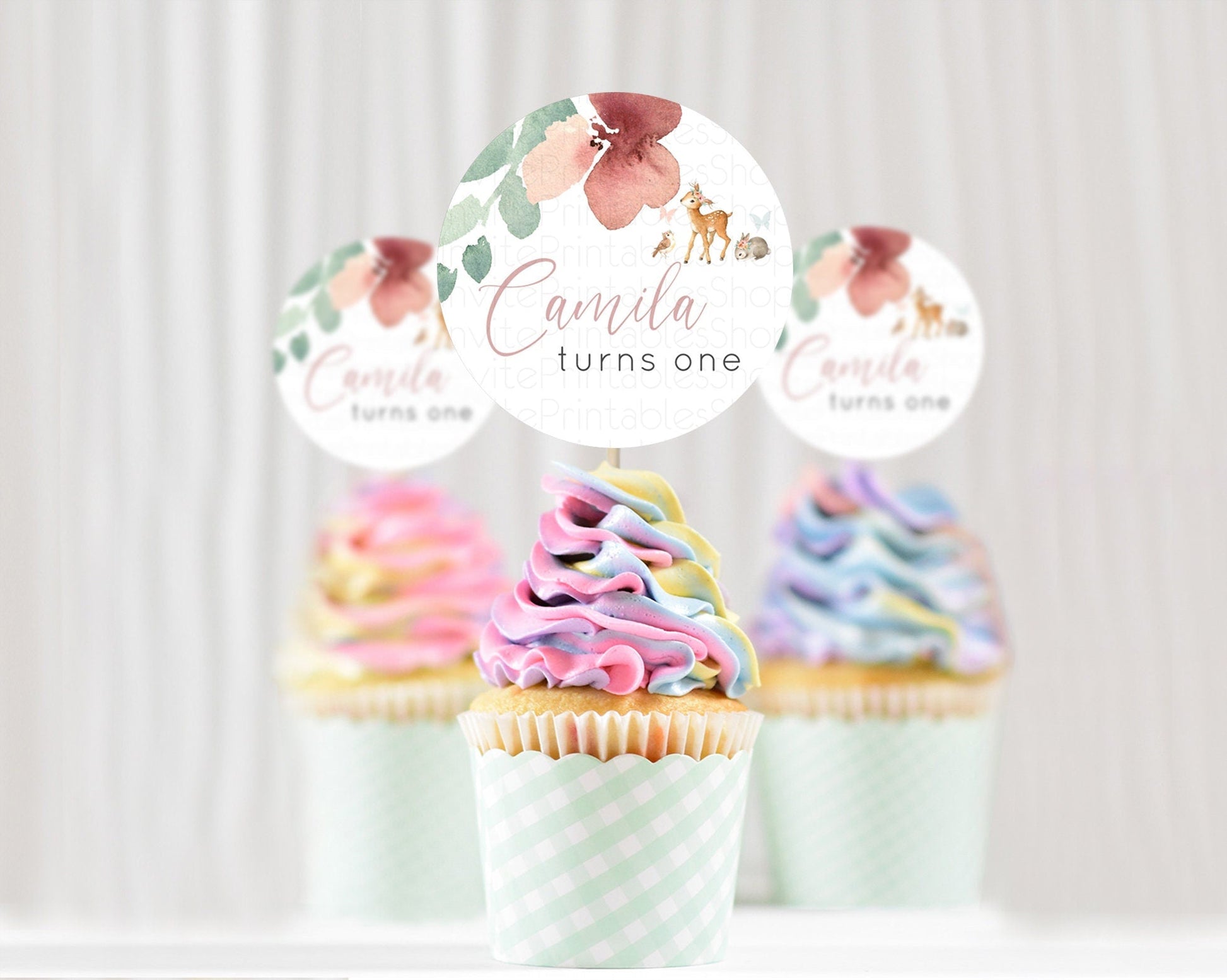 Fawn Cupcake Toppers Deer Cupcake Toppers Enchanted Forest Party Butterfly Pastel Flowers Woofland Cupcake Toppers First Birthday D10913