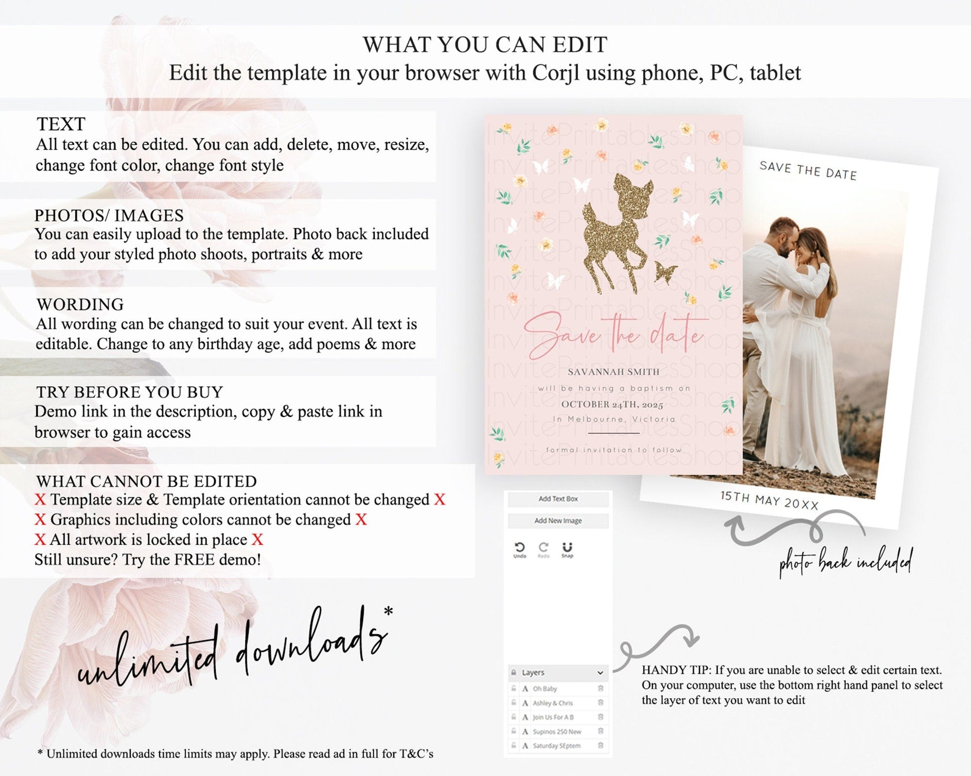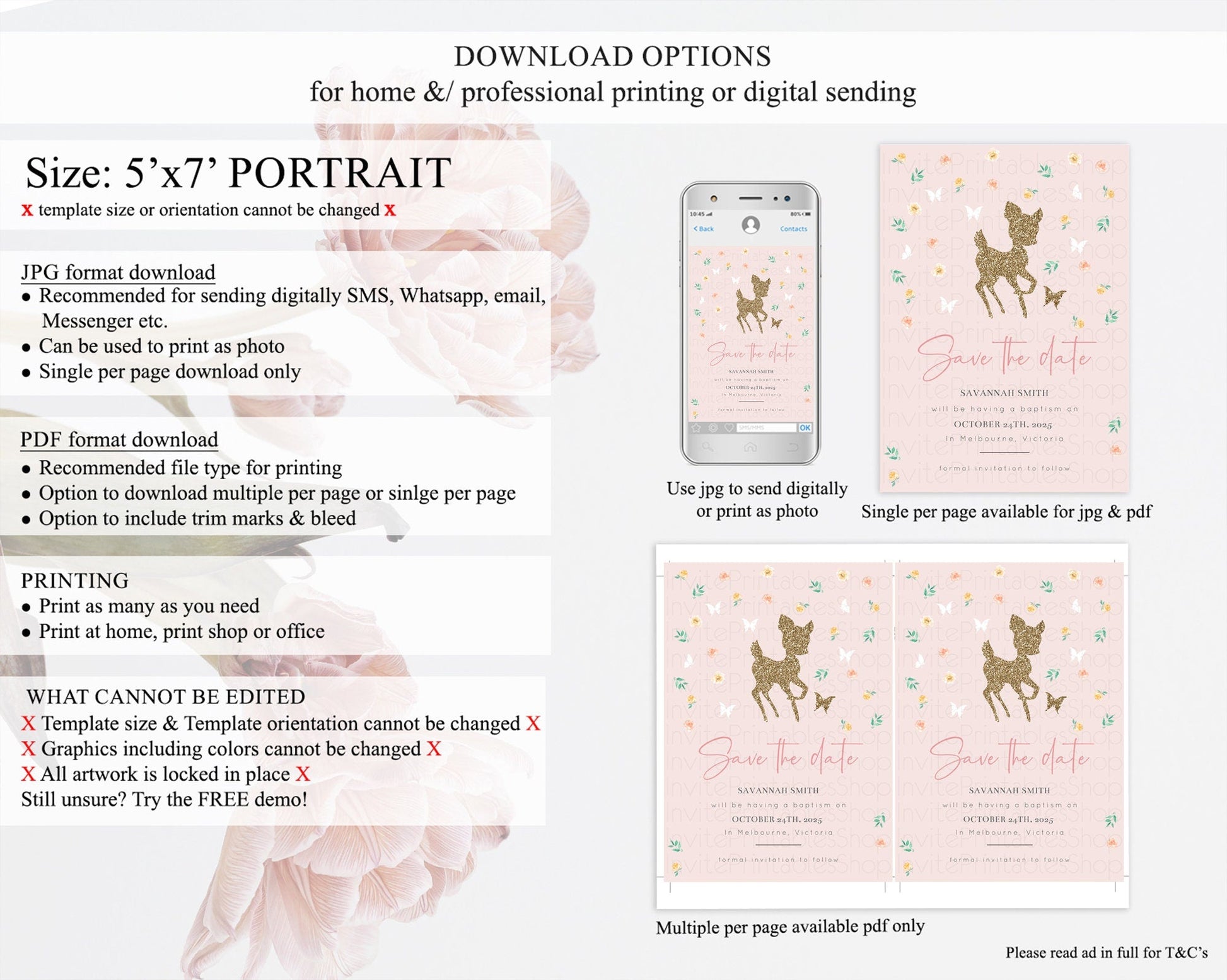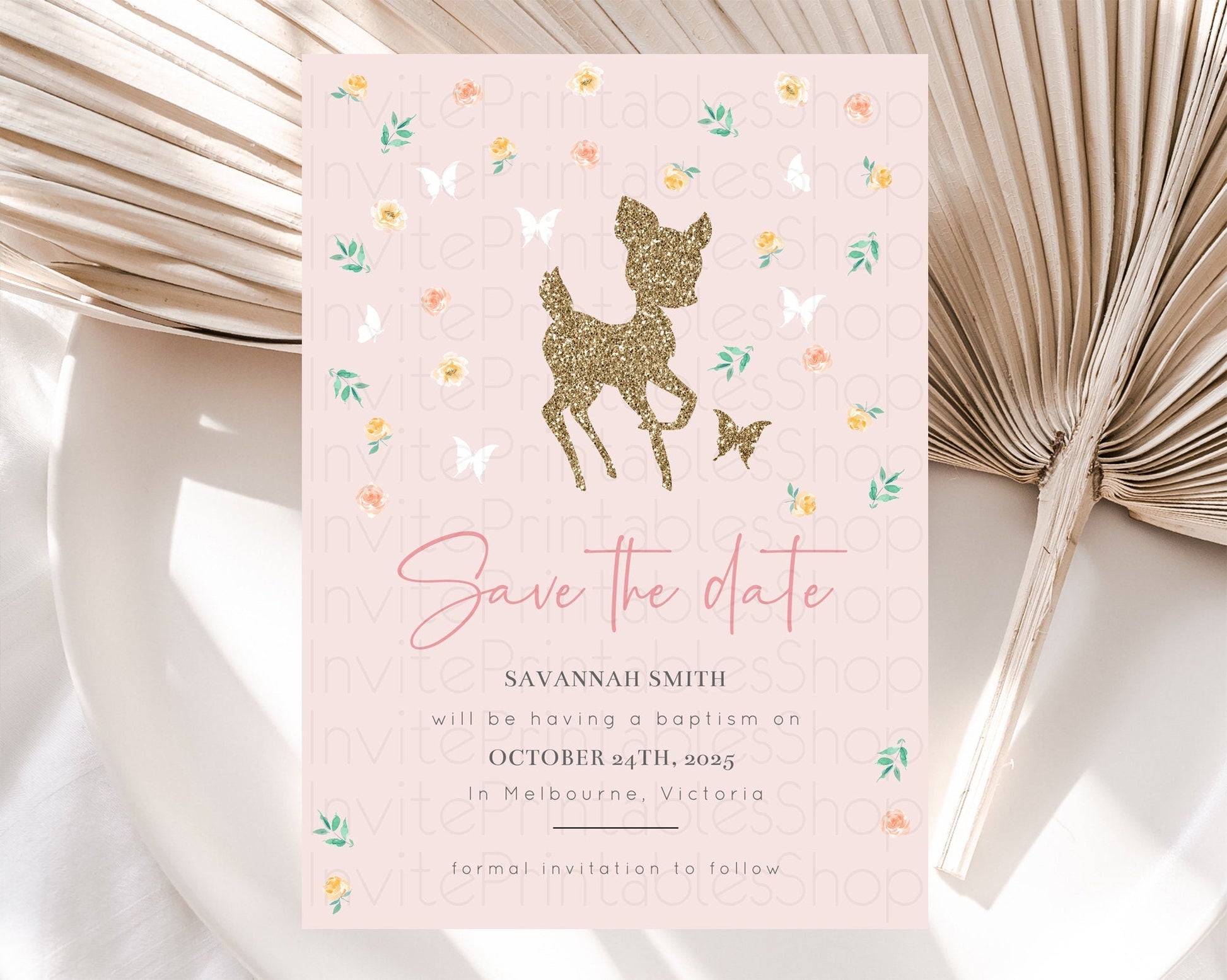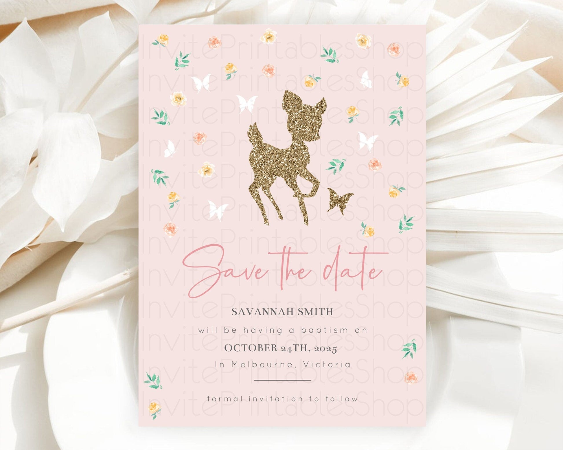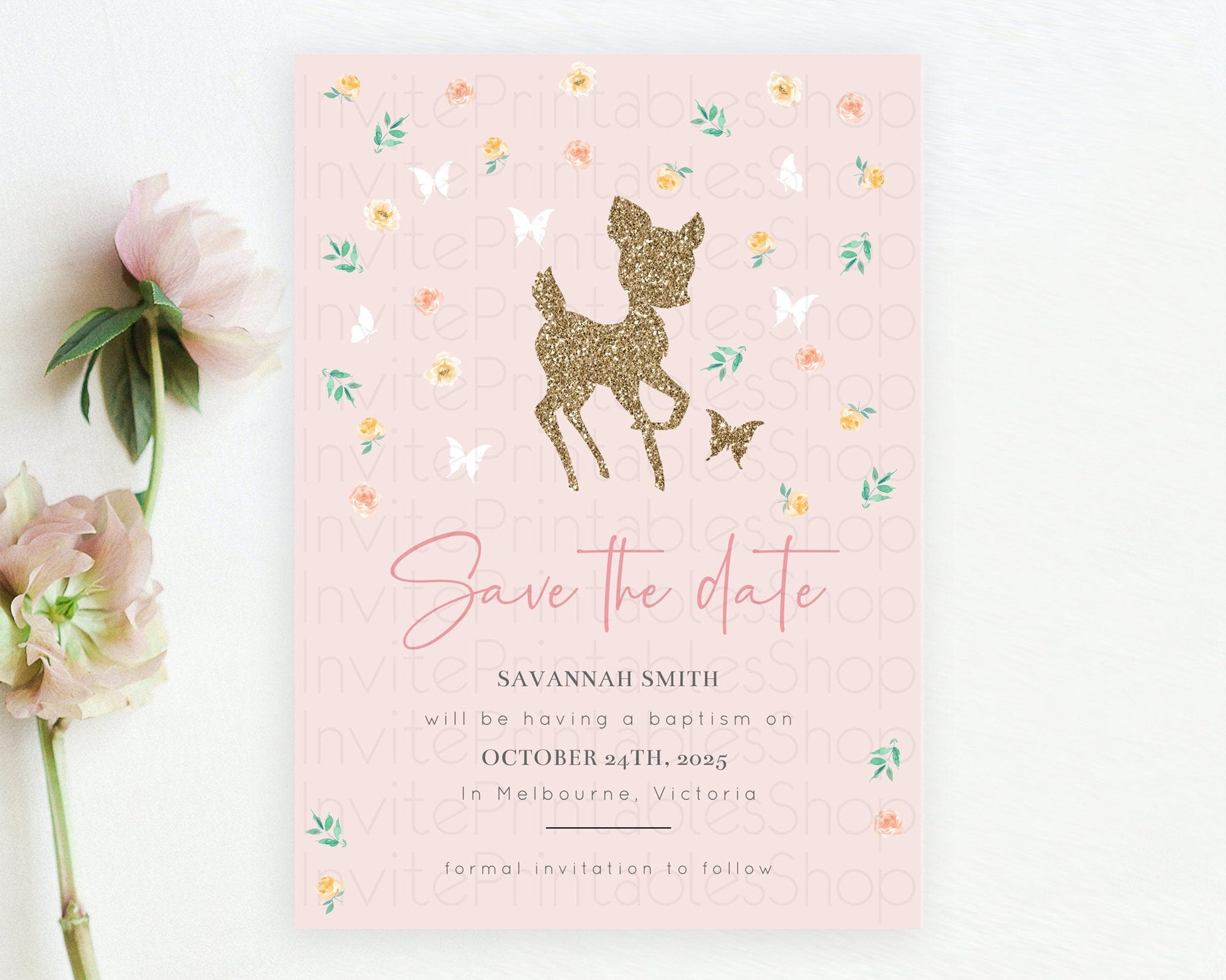 Fawn Deer Save The Date Template Pastel Floral Deer Enchanted Forest Butterfly Party 1st Birthday Baptism Baby Shower Bridal Shower D10386
