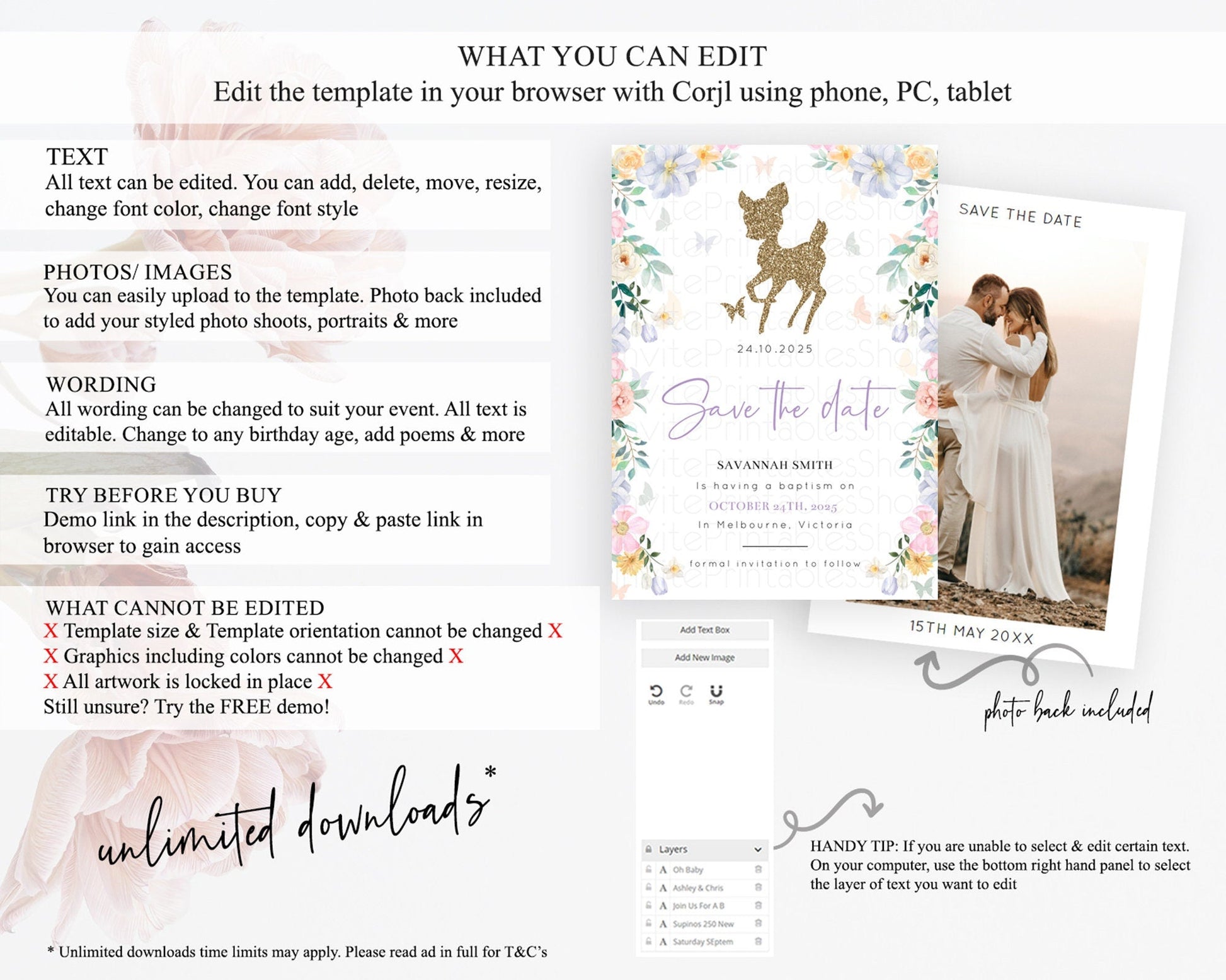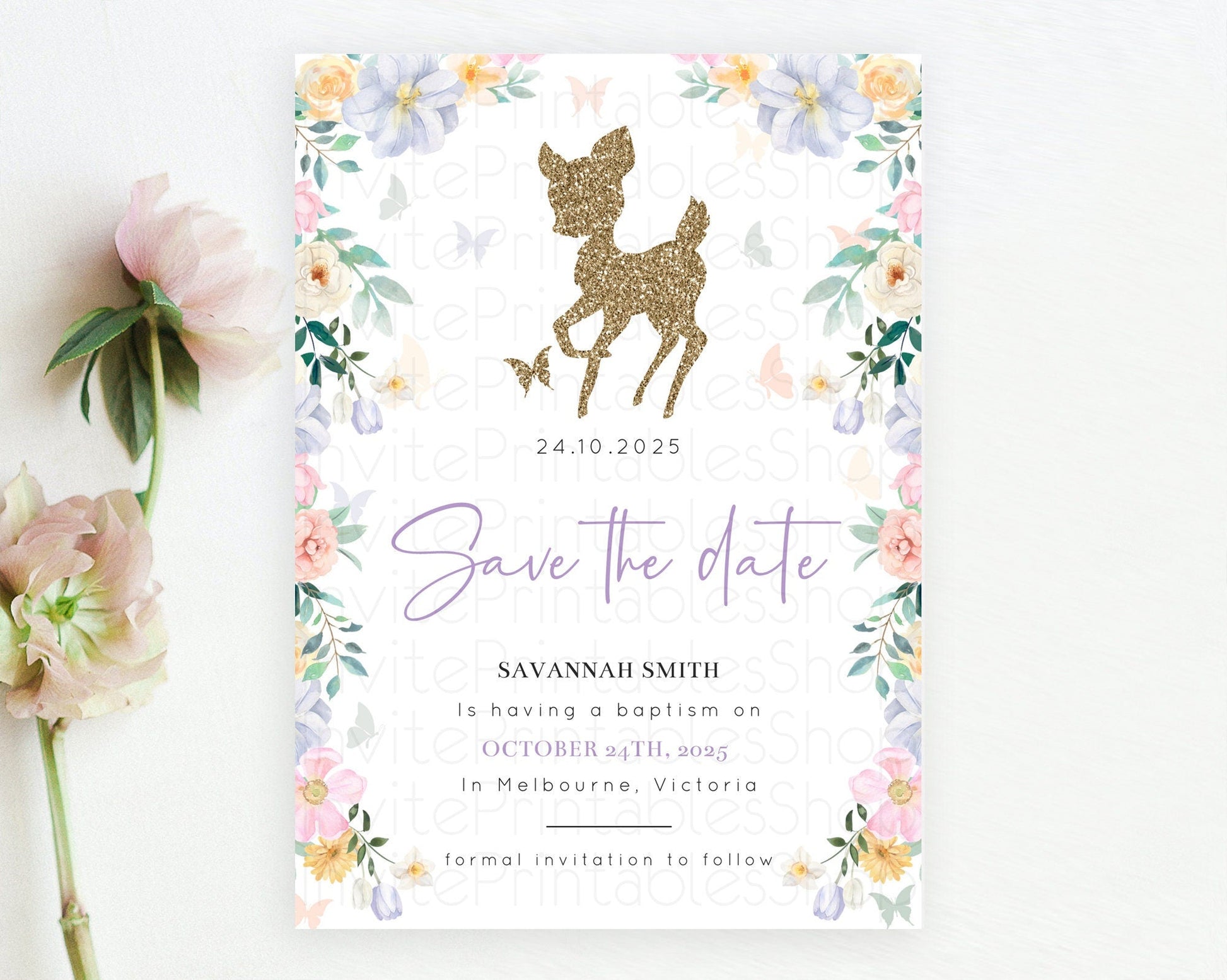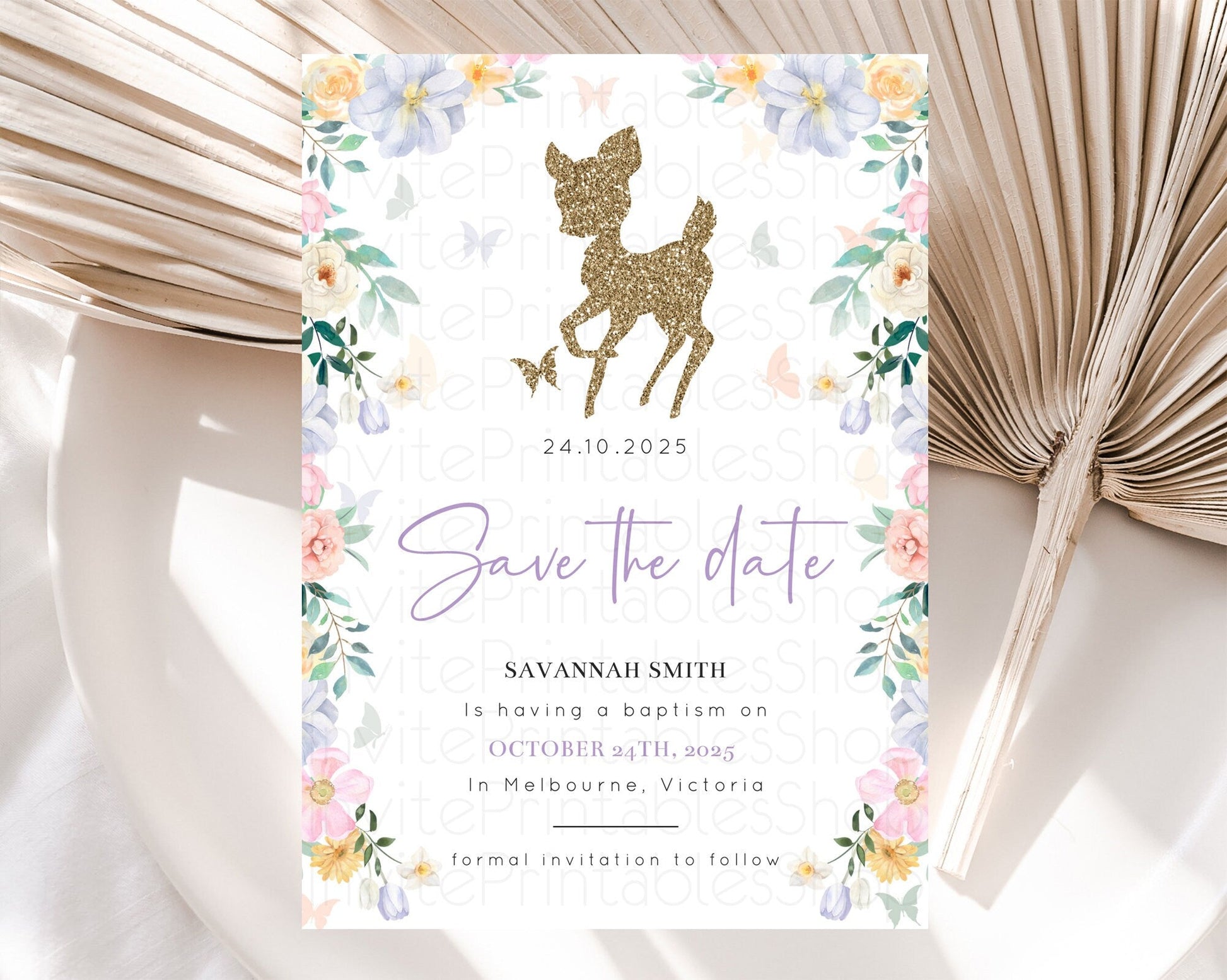 Fawn Deer Save The Date Template Pastel Floral Deer Enchanted Forest Butterfly Party 1st Birthday Baptism Baby Shower Bridal Shower D10477