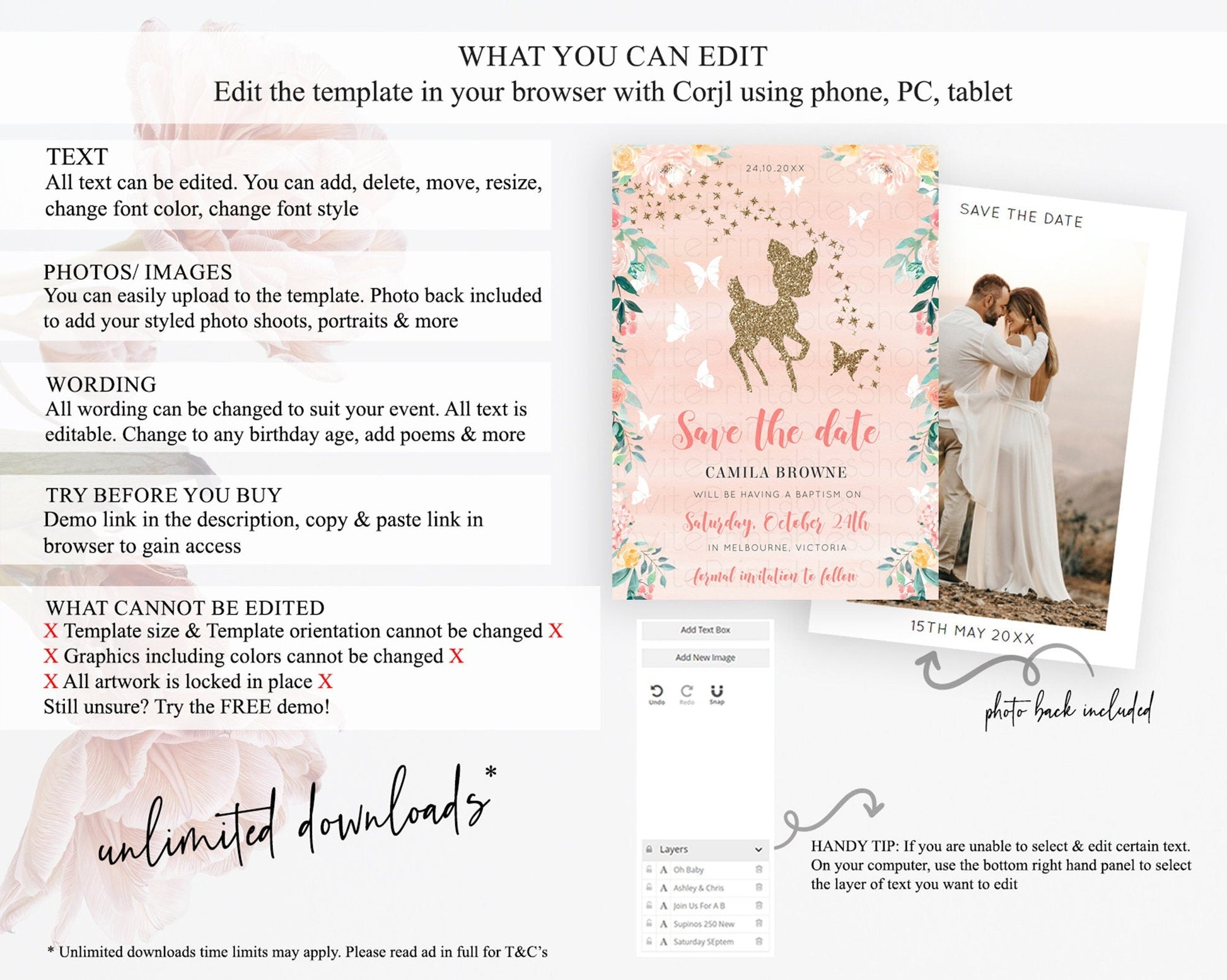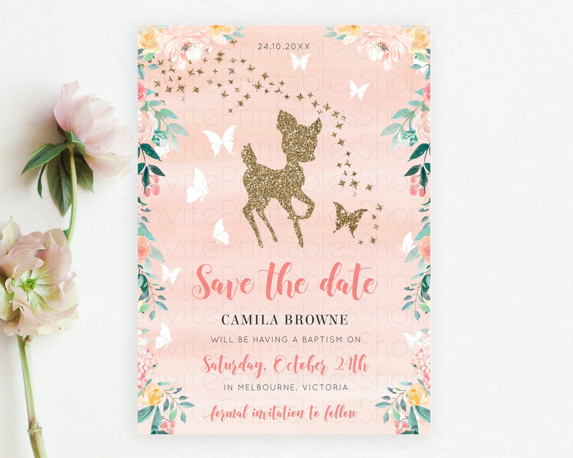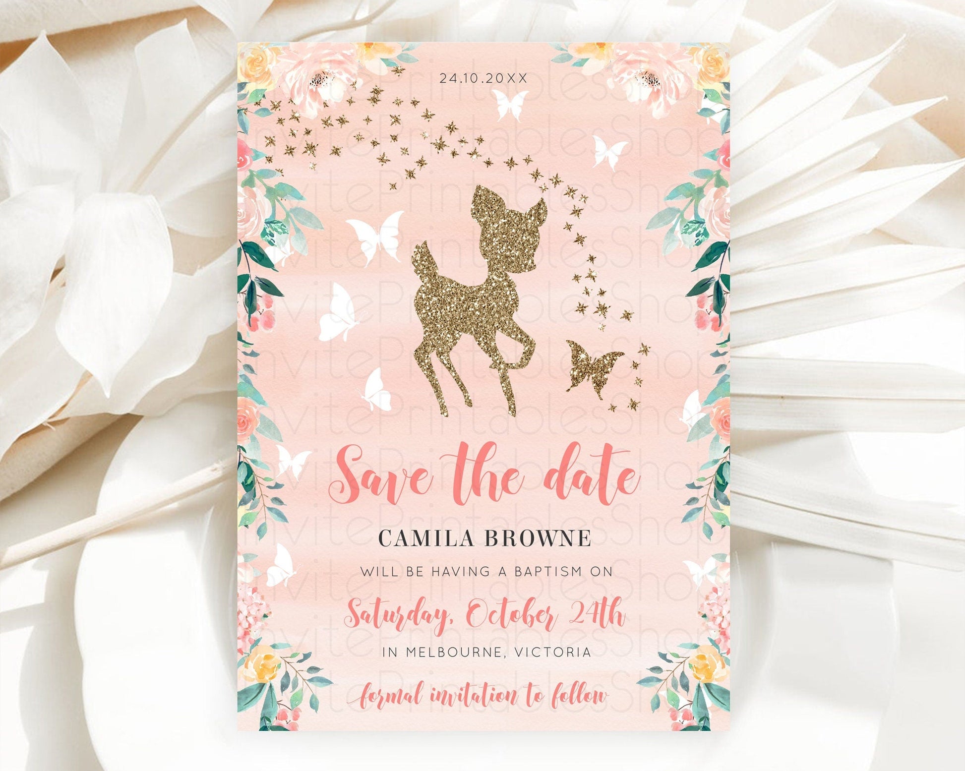 Fawn Deer Save The Date Template Pastel Floral Deer Enchanted Forest Butterfly Party 1st Birthday Baptism Baby Shower Bridal Shower D10873