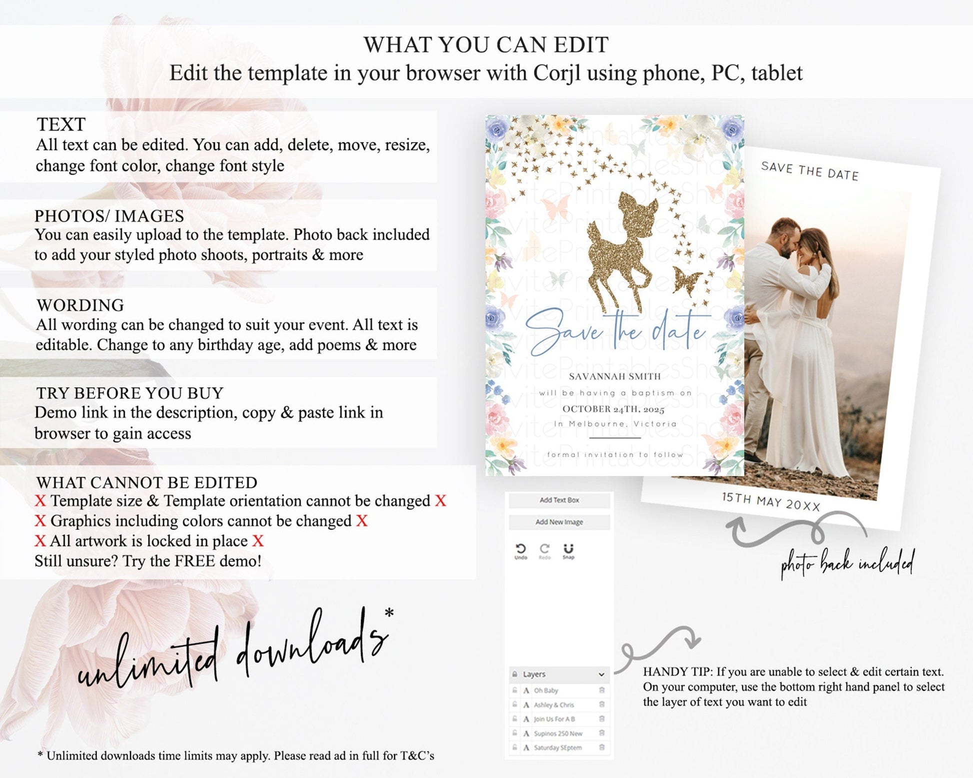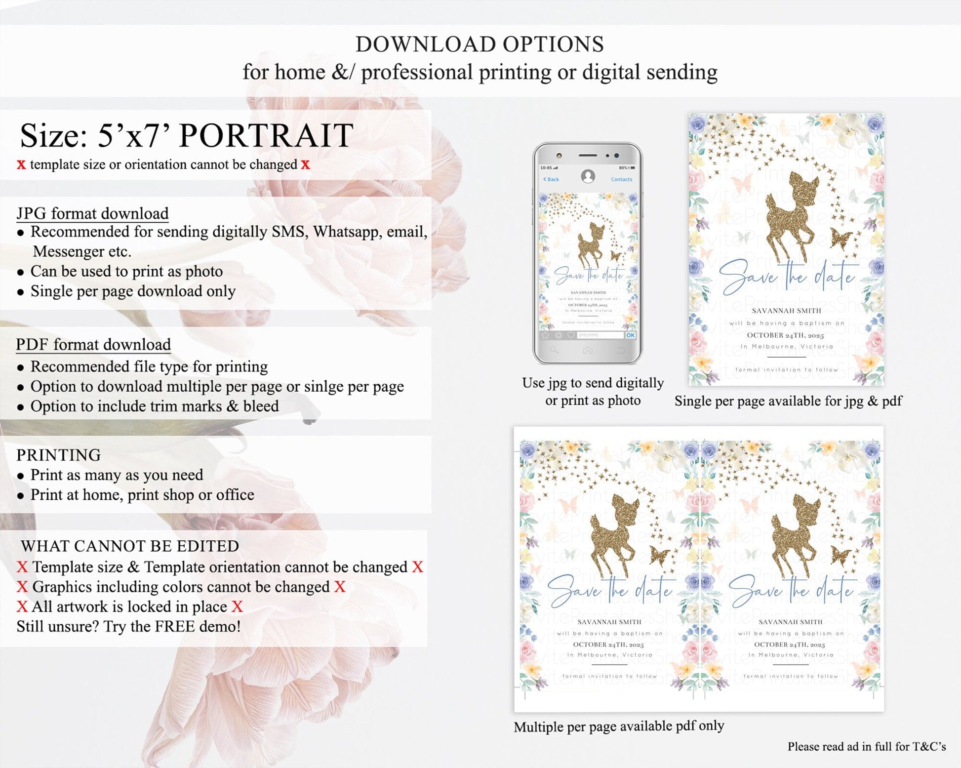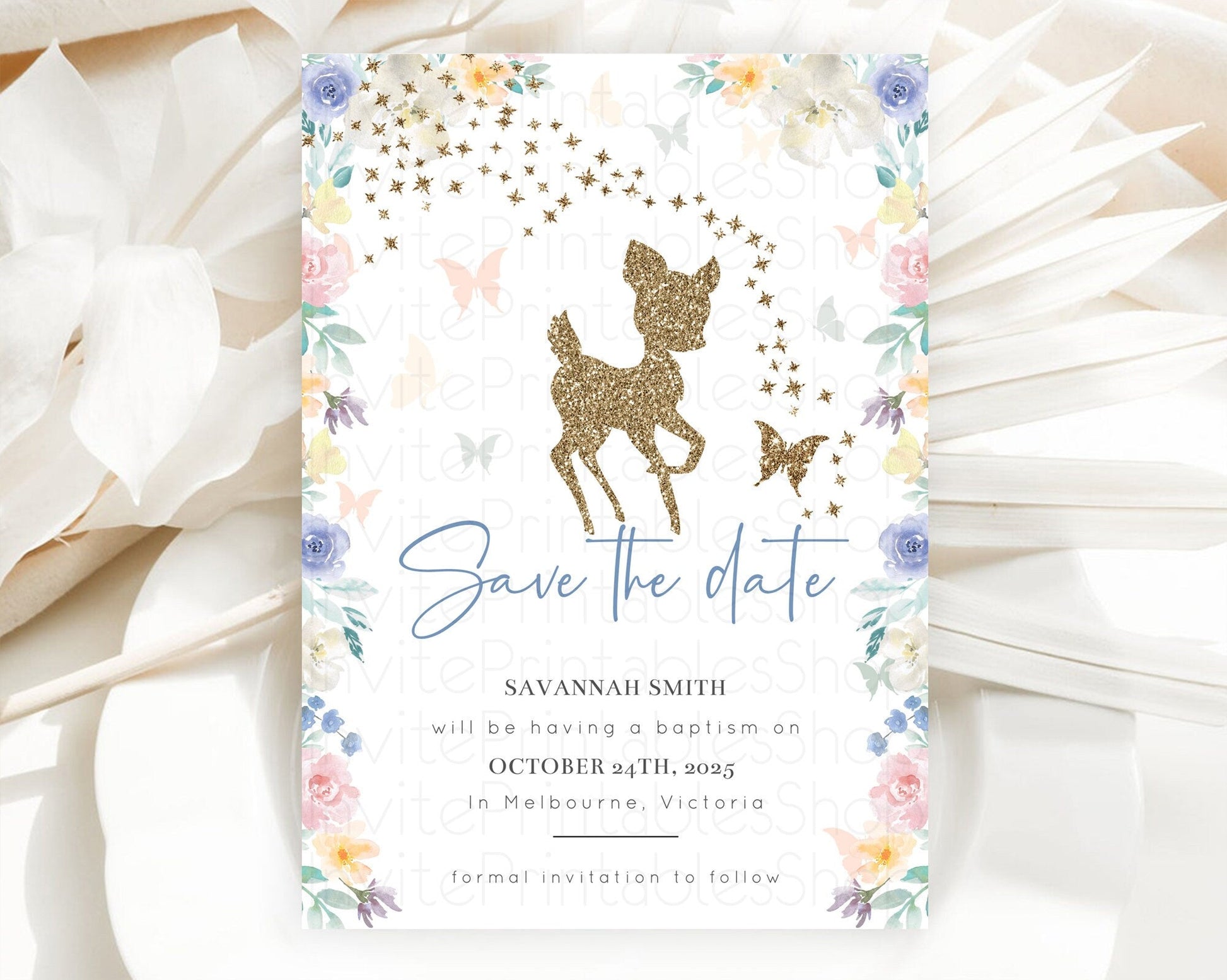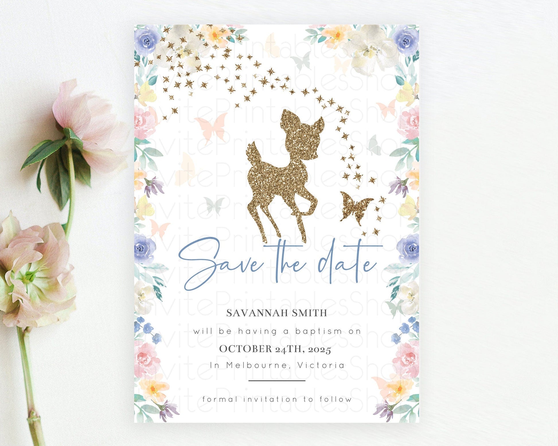 Fawn Deer Save The Date Template Pastel Floral Deer Enchanted Forest Butterfly Party 1st Birthday Baptism Baby Shower Bridal Shower D10878