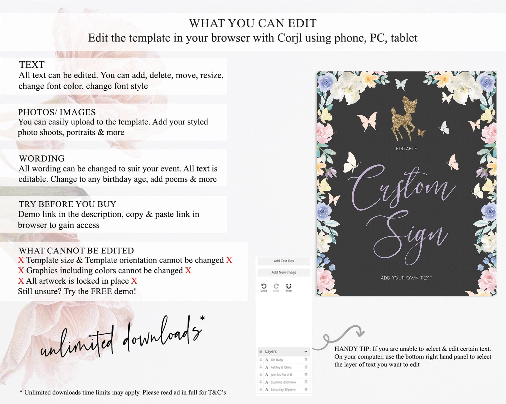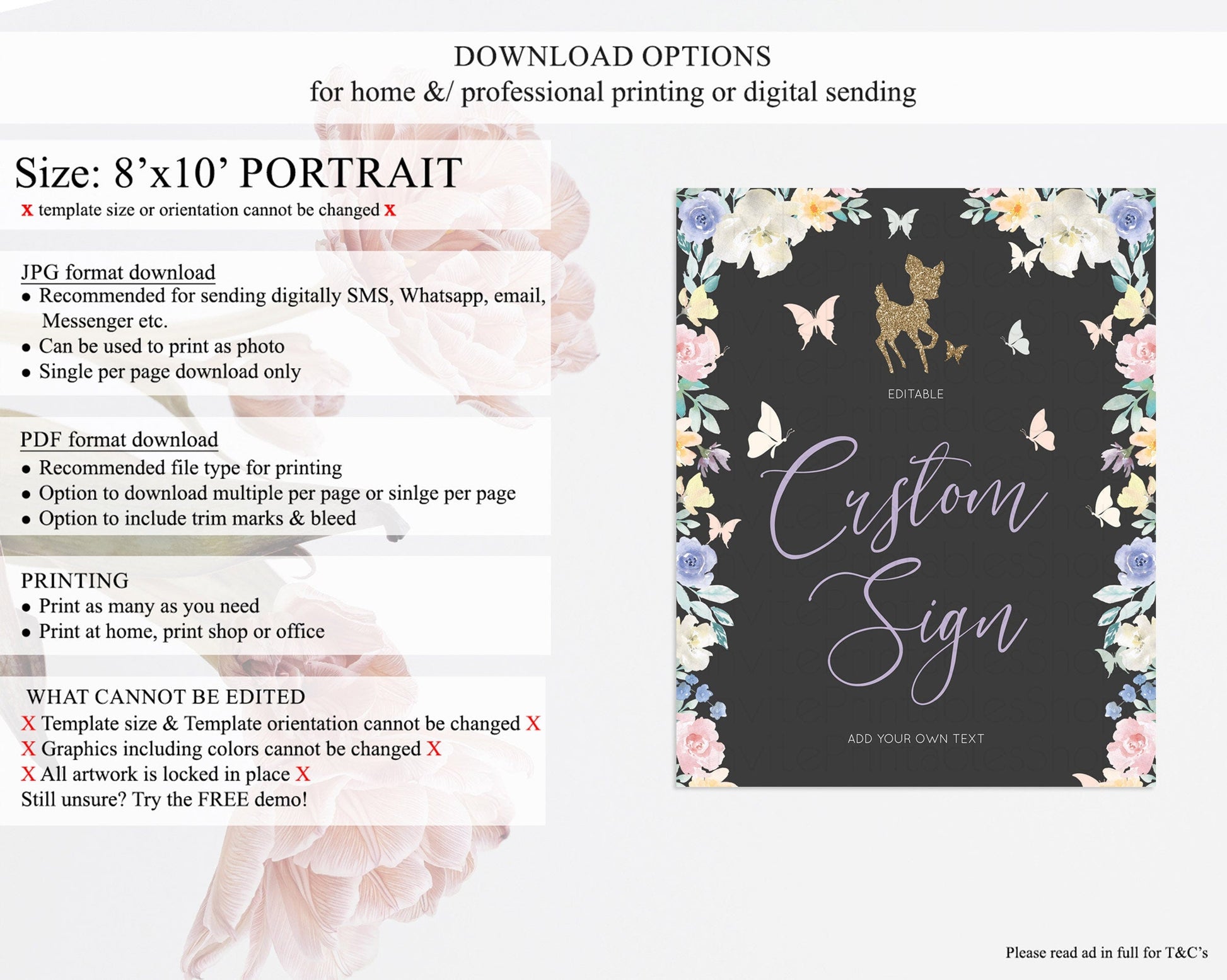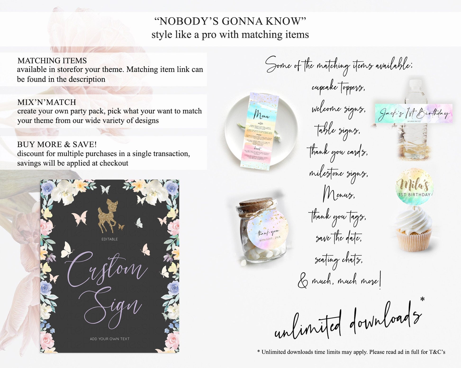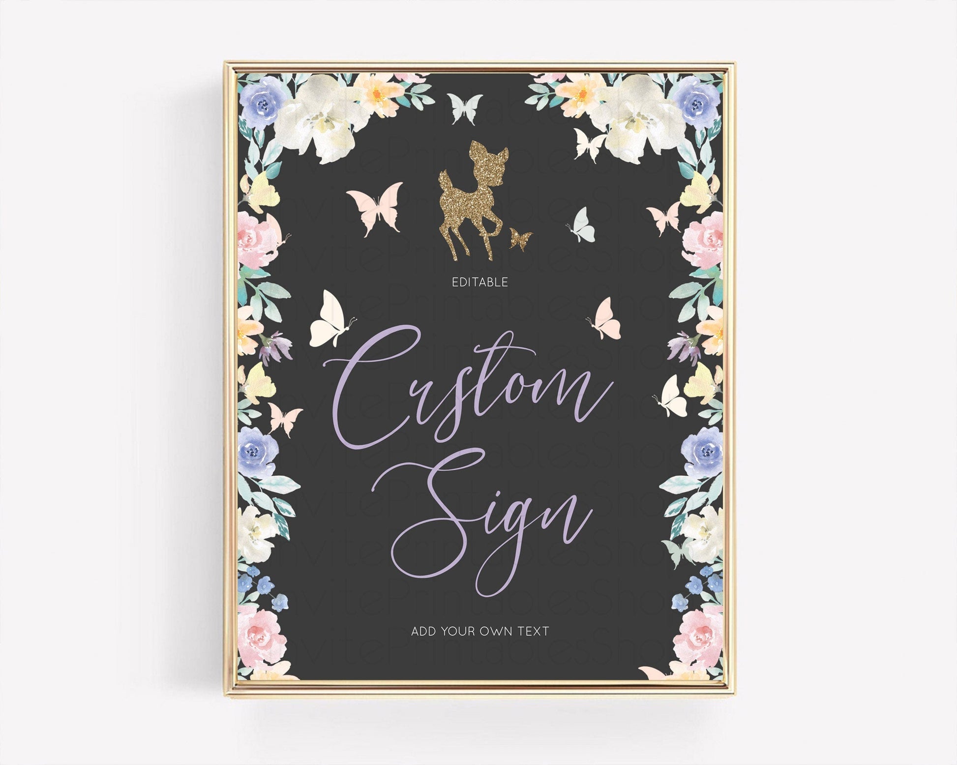 Fawn Deer Sign Pastel Floral Deer Table Sign Decor Enchanted Forest Butterfly Party 1st Birthday Baptism Baby Shower Bridal Shower D10323