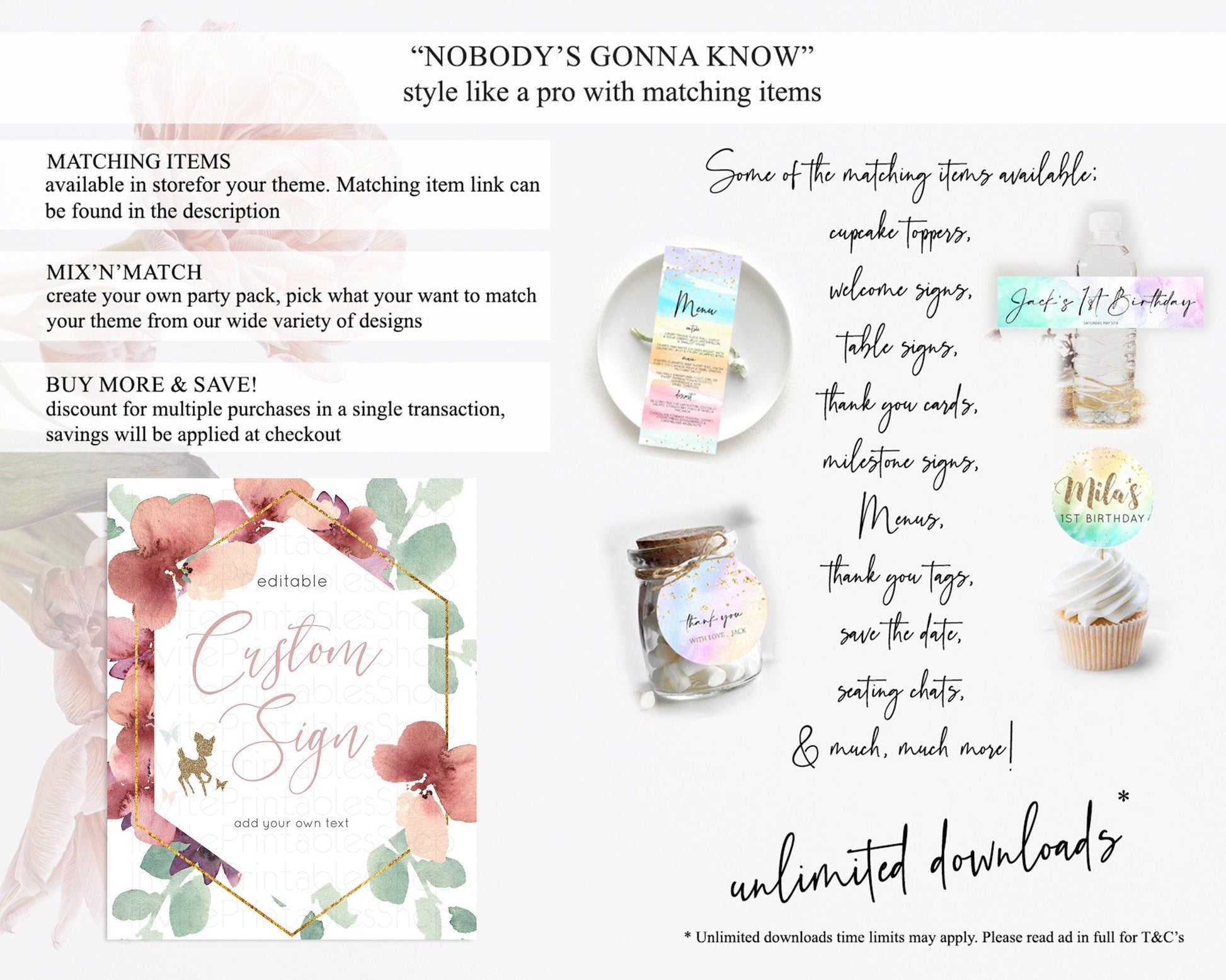 Fawn Deer Sign Pastel Floral Deer Table Sign Decor Enchanted Forest Butterfly Party 1st Birthday Baptism Baby Shower Bridal Shower D10459