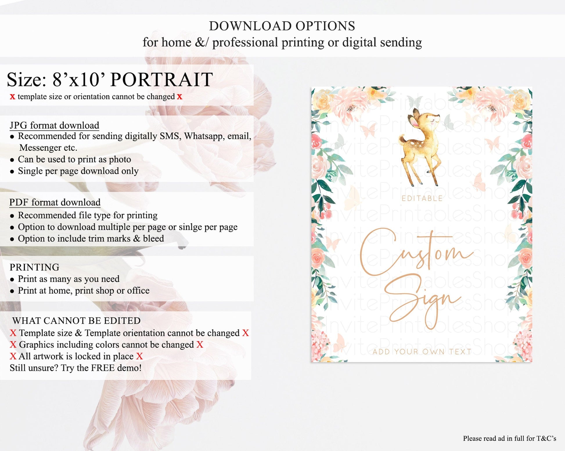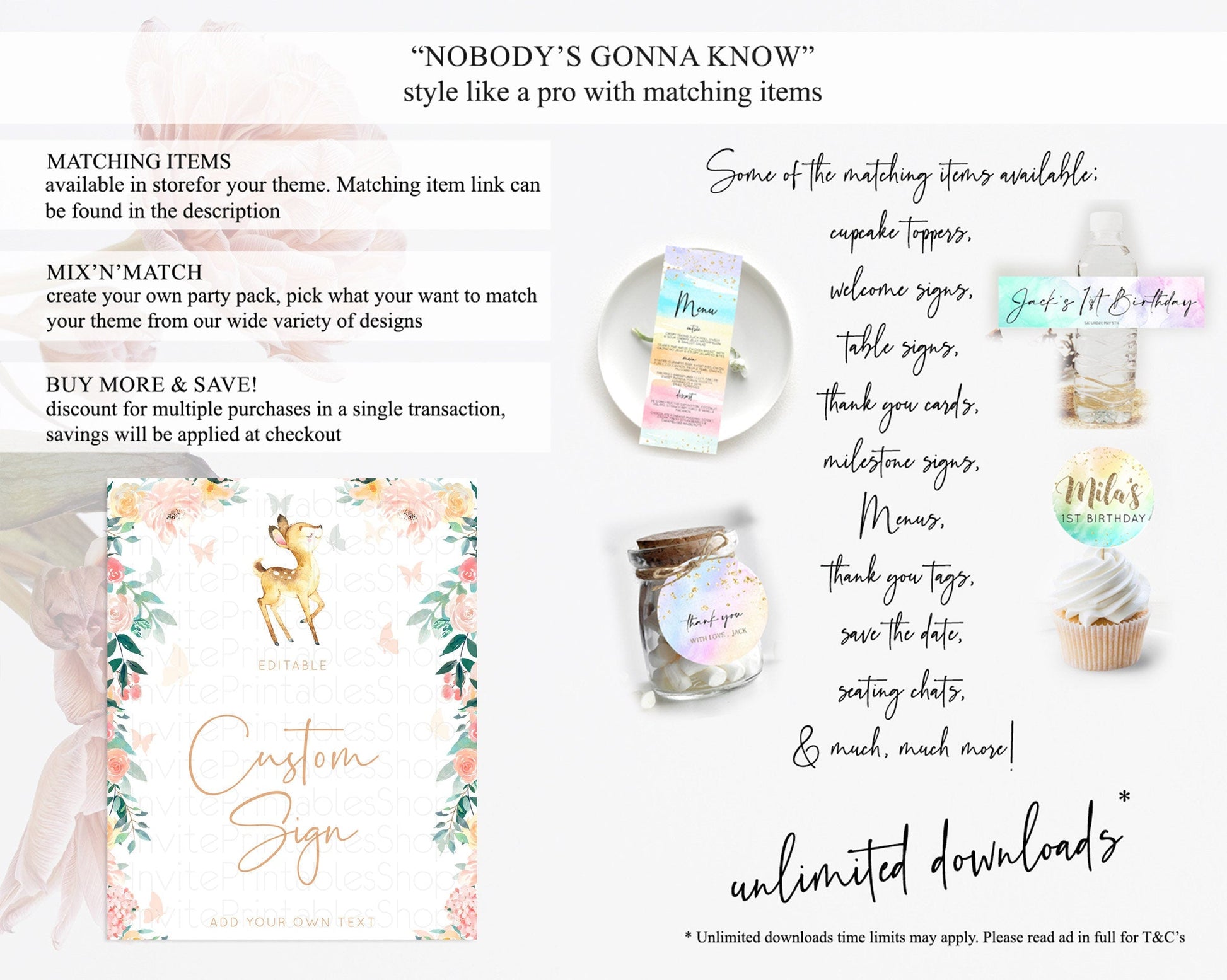 Fawn Deer Sign Pastel Floral Deer Table Sign Decor Enchanted Forest Butterfly Party 1st Birthday Baptism Baby Shower Bridal Shower D10753