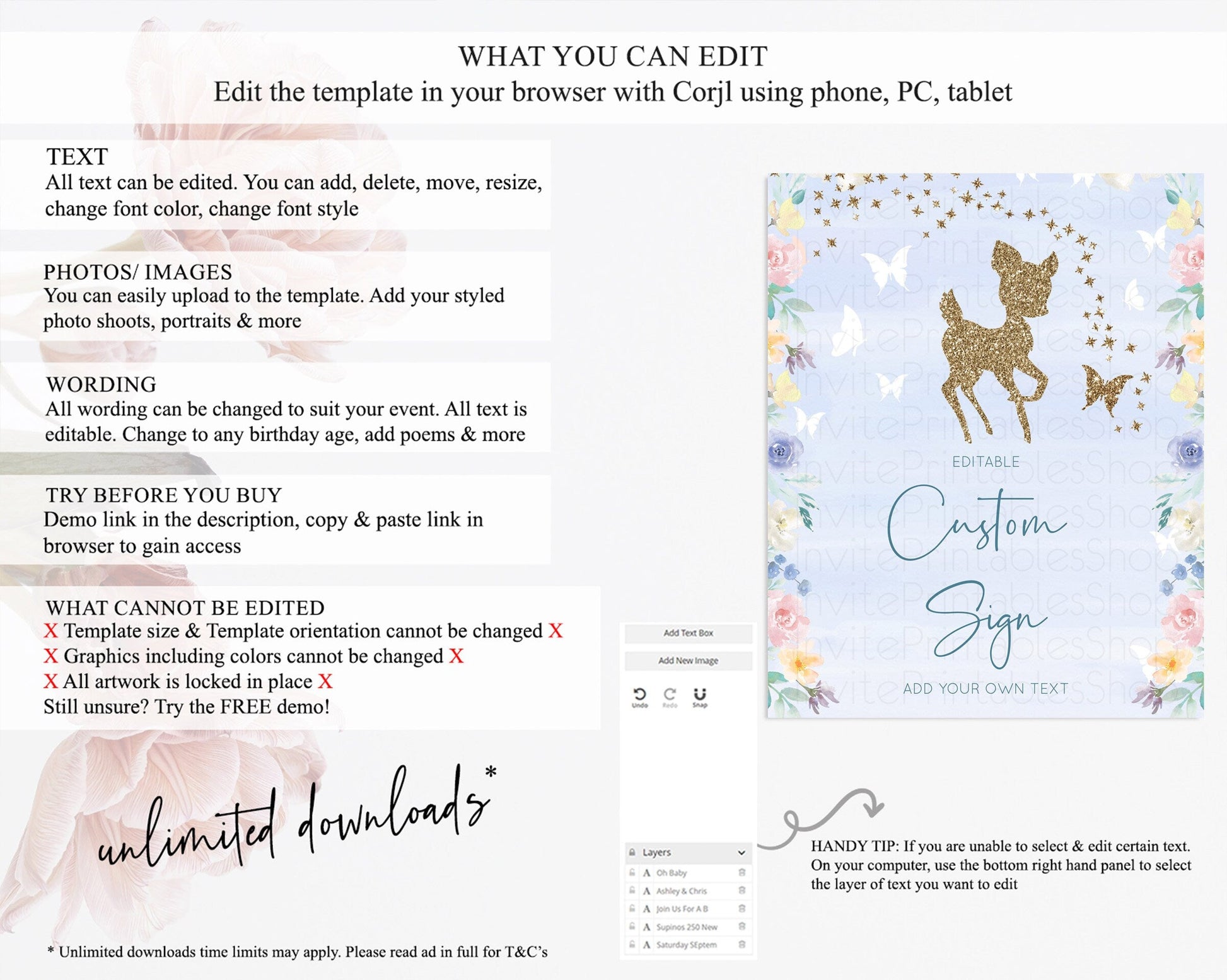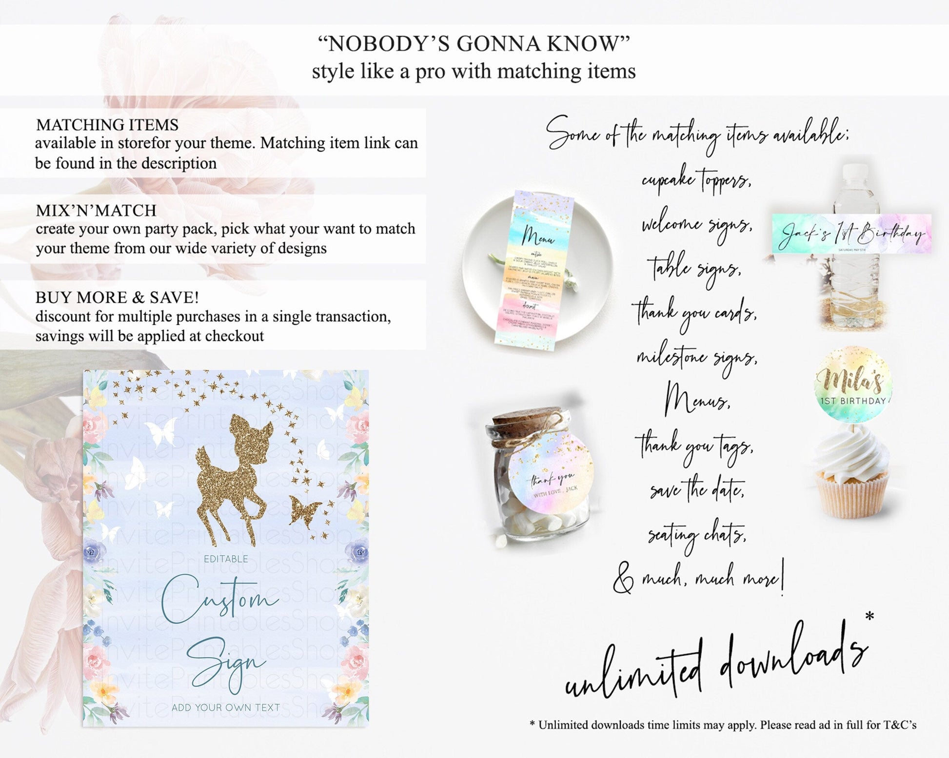 Fawn Deer Sign Pastel Floral Deer Table Sign Decor Enchanted Forest Butterfly Party 1st Birthday Baptism Baby Shower Bridal Shower D10879