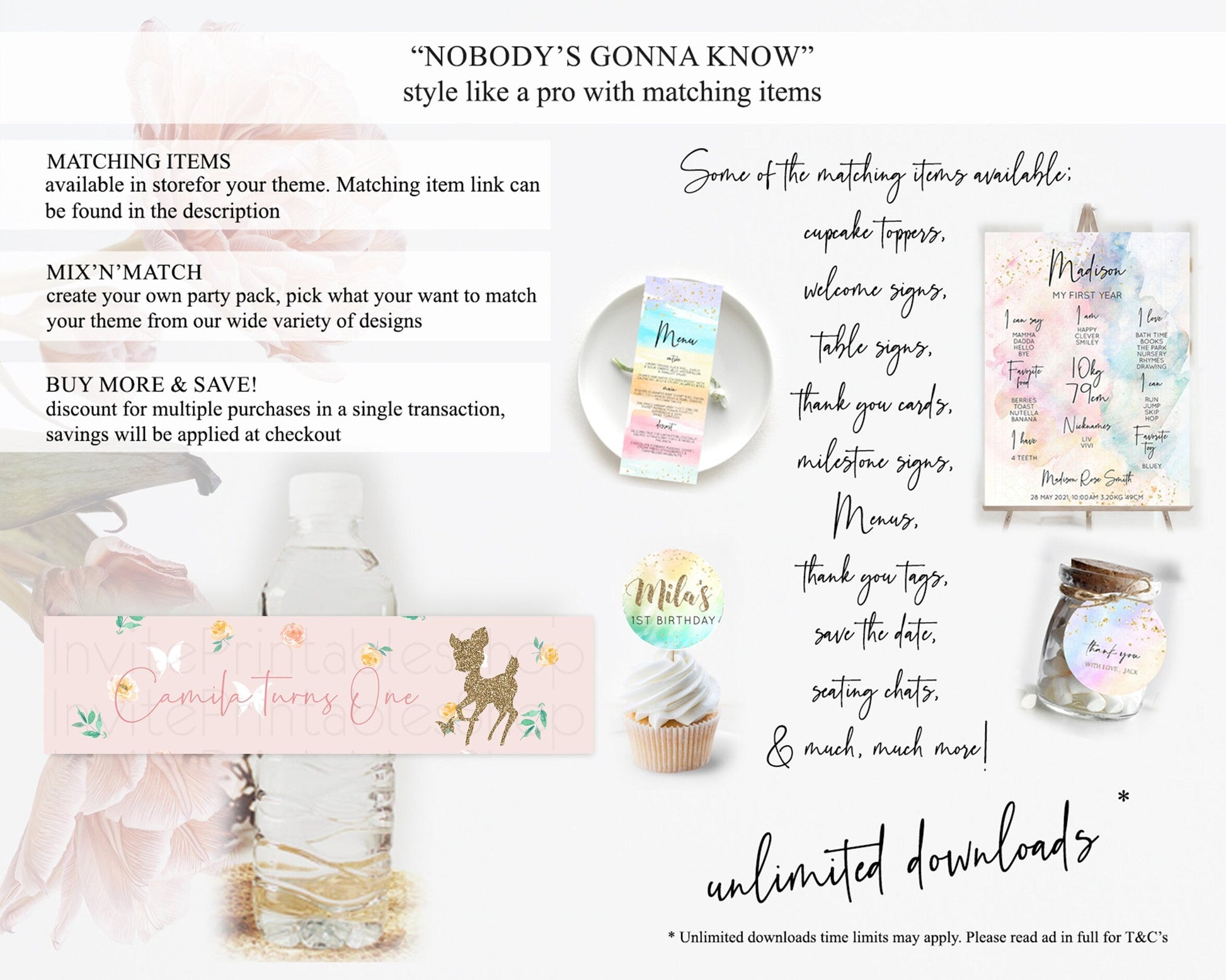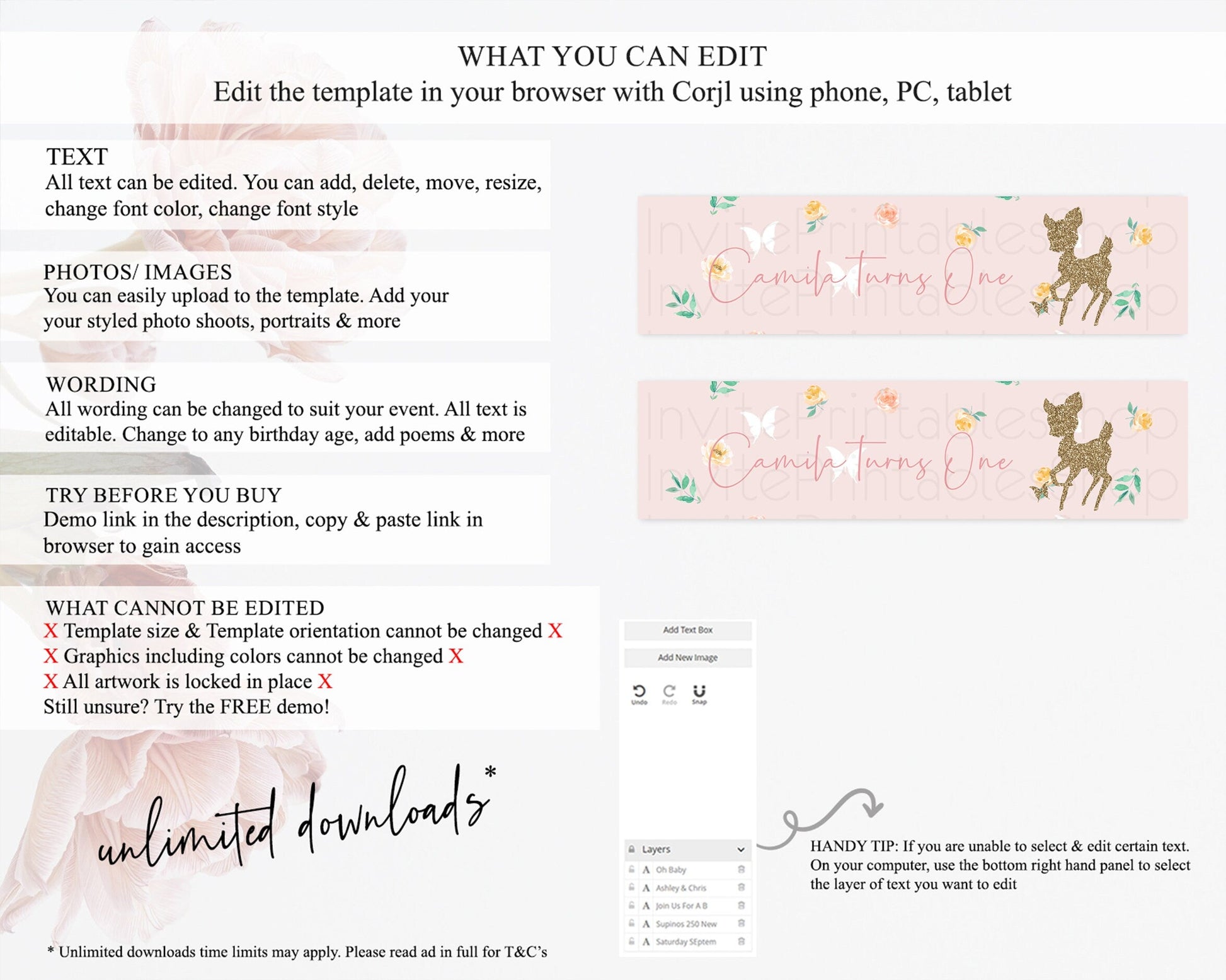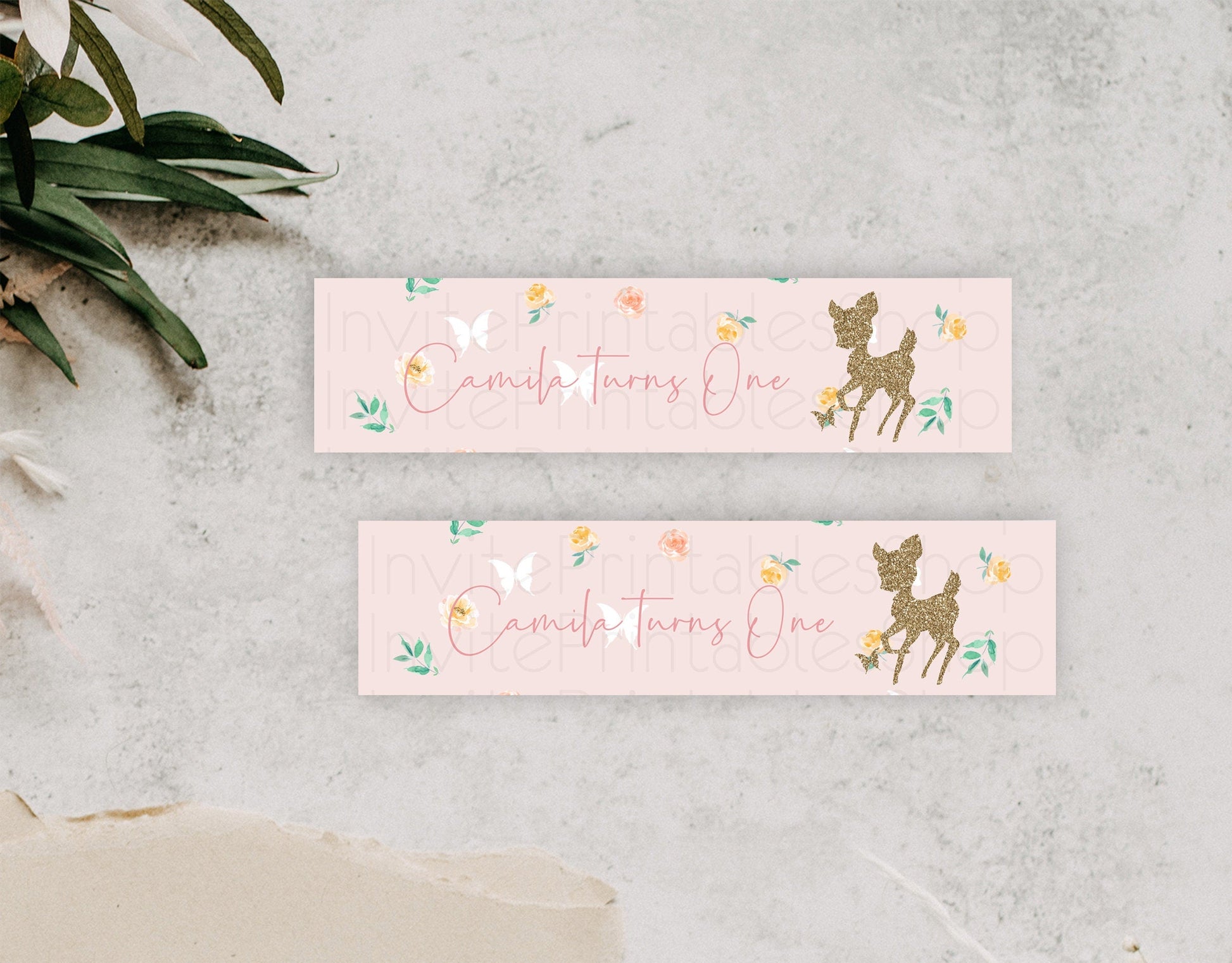 Fawn Deer Water Label Template Pastel Floral Deer Enchanted Forest Butterfly Party Decor Birthday Baptism Baby Shower Bridal Shower D10386