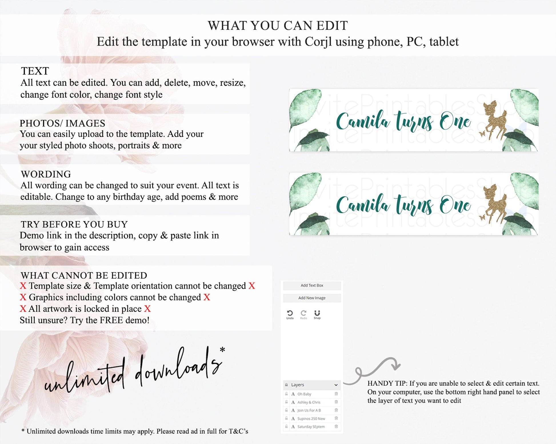 Fawn Deer Water Label Template Pastel Floral Deer Enchanted Forest Butterfly Party Decor Birthday Baptism Baby Shower Bridal Shower D10882