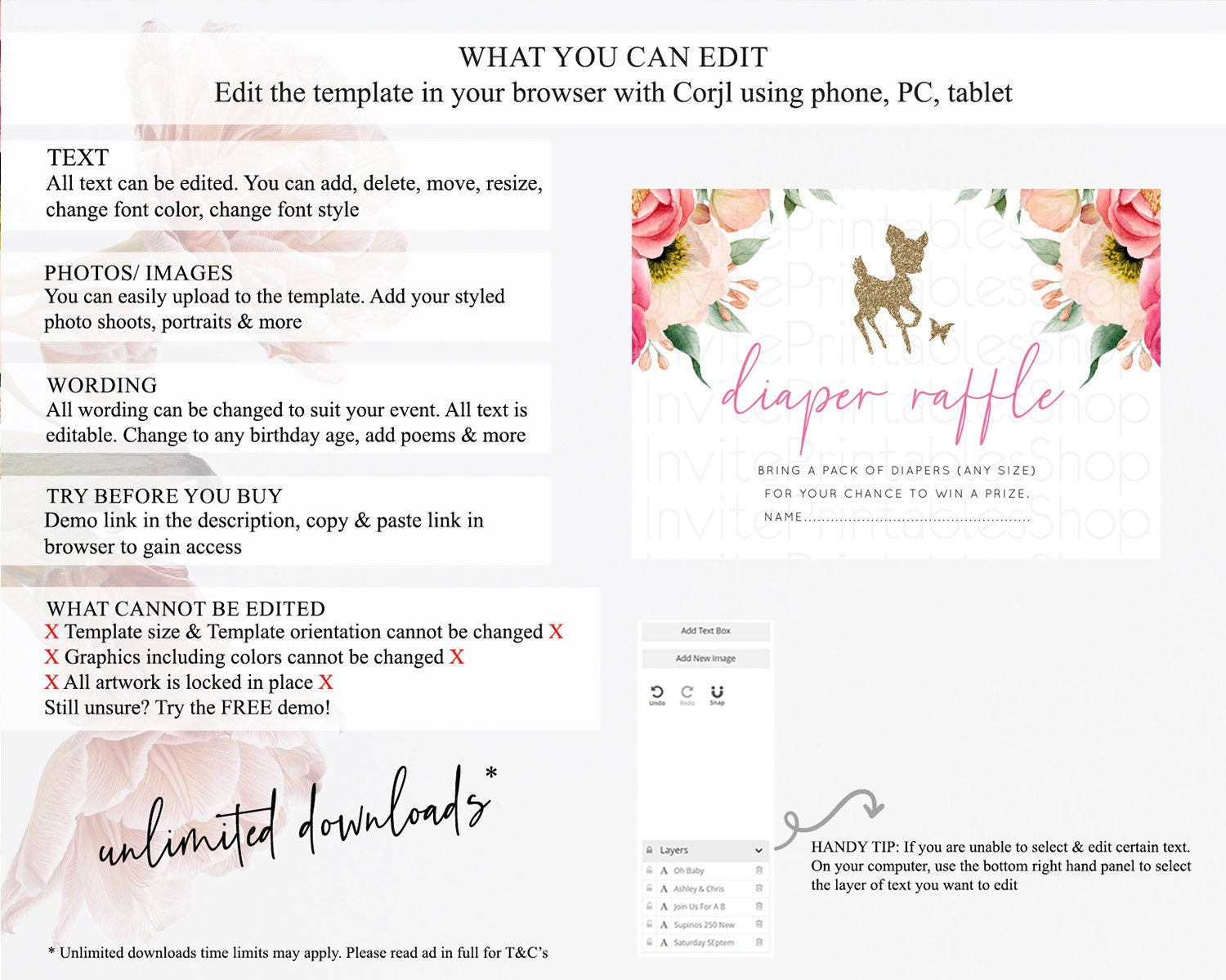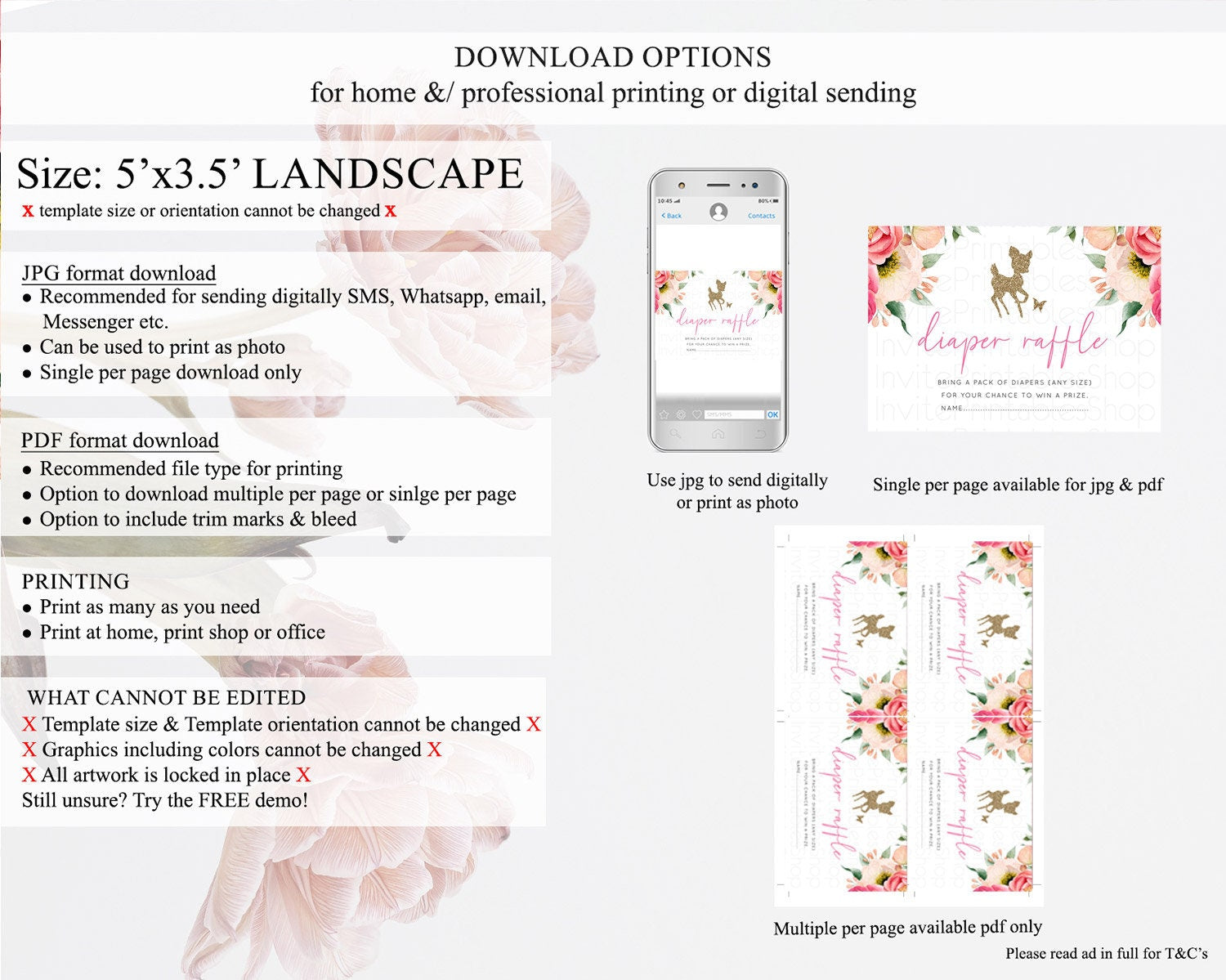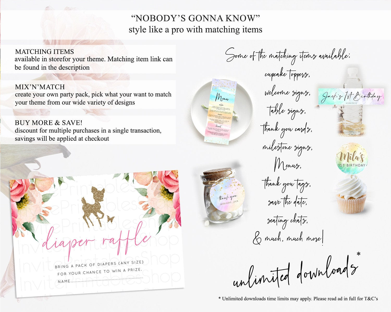 Fawn Diaper Raffle Card Deer Diaper Insert Floral Deer Diaper Ticket Enchanted Forest Butterfly Pastel Baby Shower Raffle Game D10326