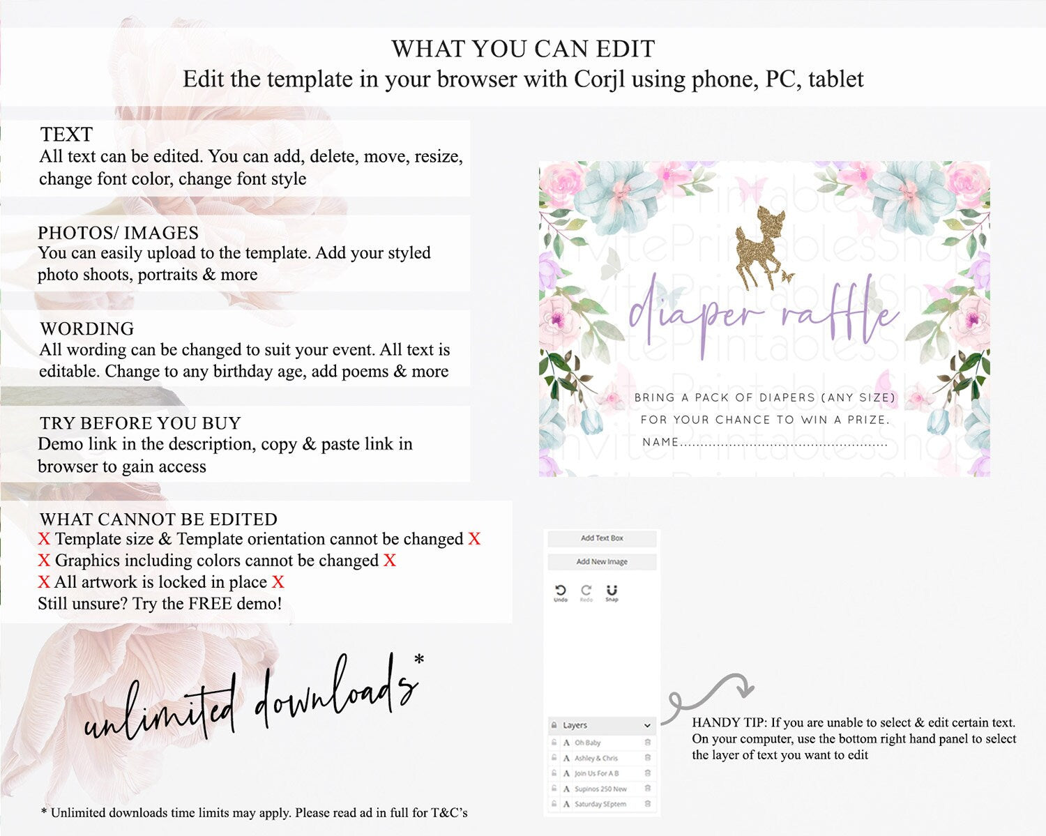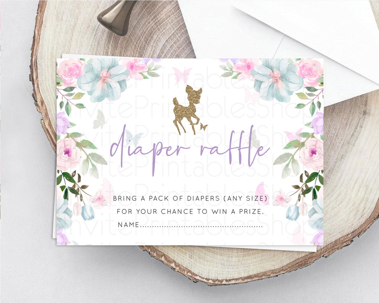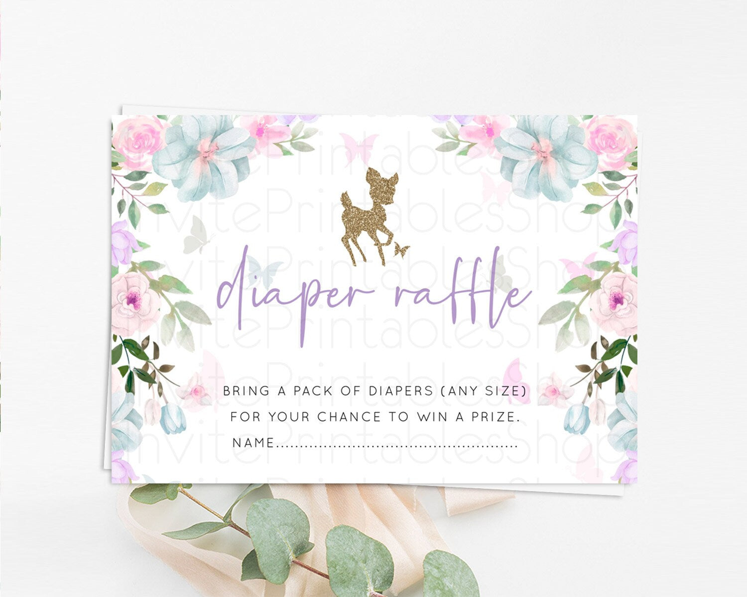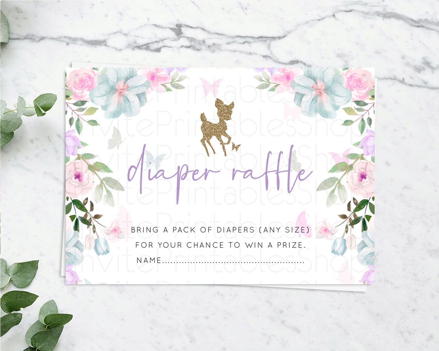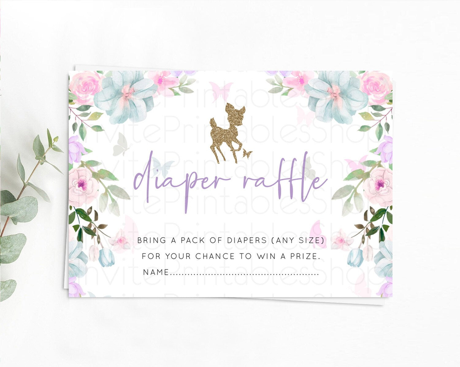 Fawn Diaper Raffle Card Deer Diaper Insert Floral Deer Diaper Ticket Enchanted Forest Butterfly Pastel Baby Shower Raffle Game D10476