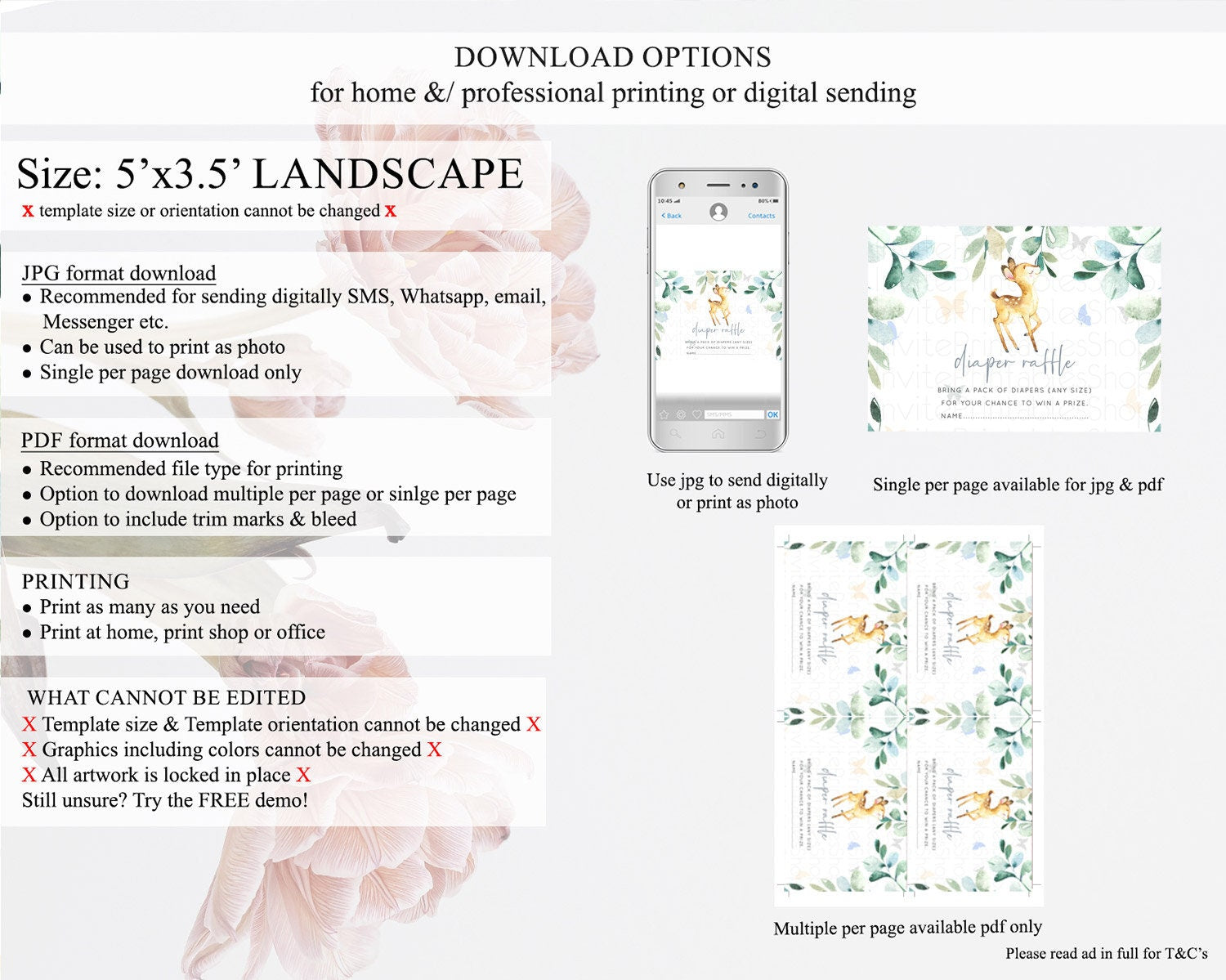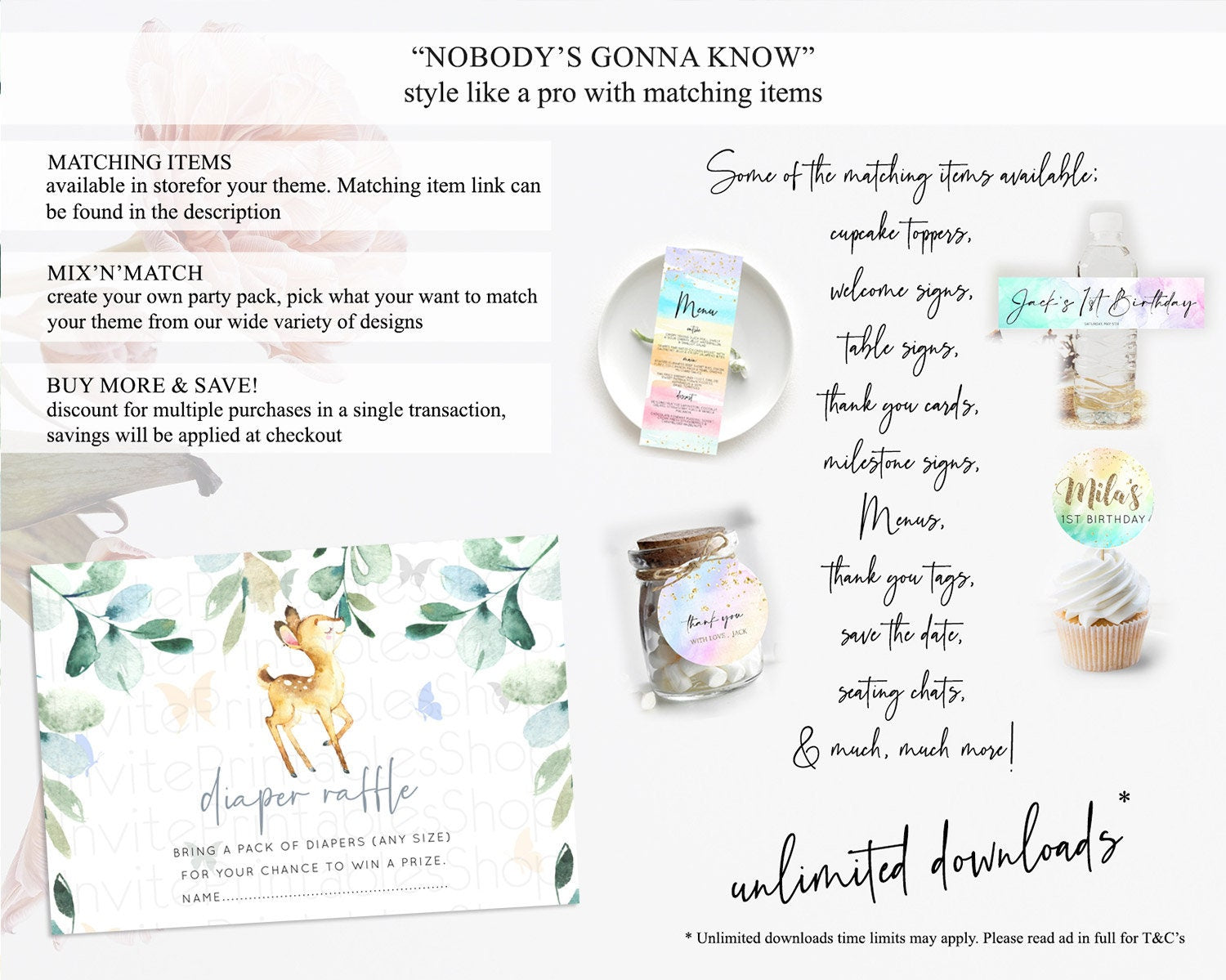 Fawn Diaper Raffle Card Deer Diaper Insert Floral Deer Diaper Ticket Enchanted Forest Butterfly Pastel Baby Shower Raffle Game D10767