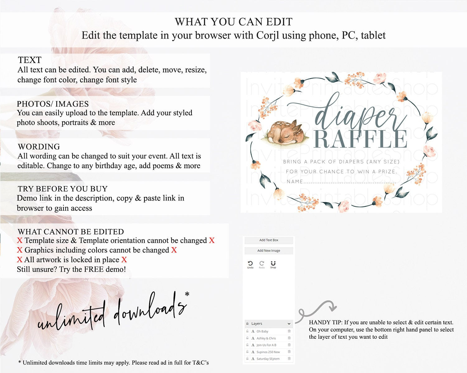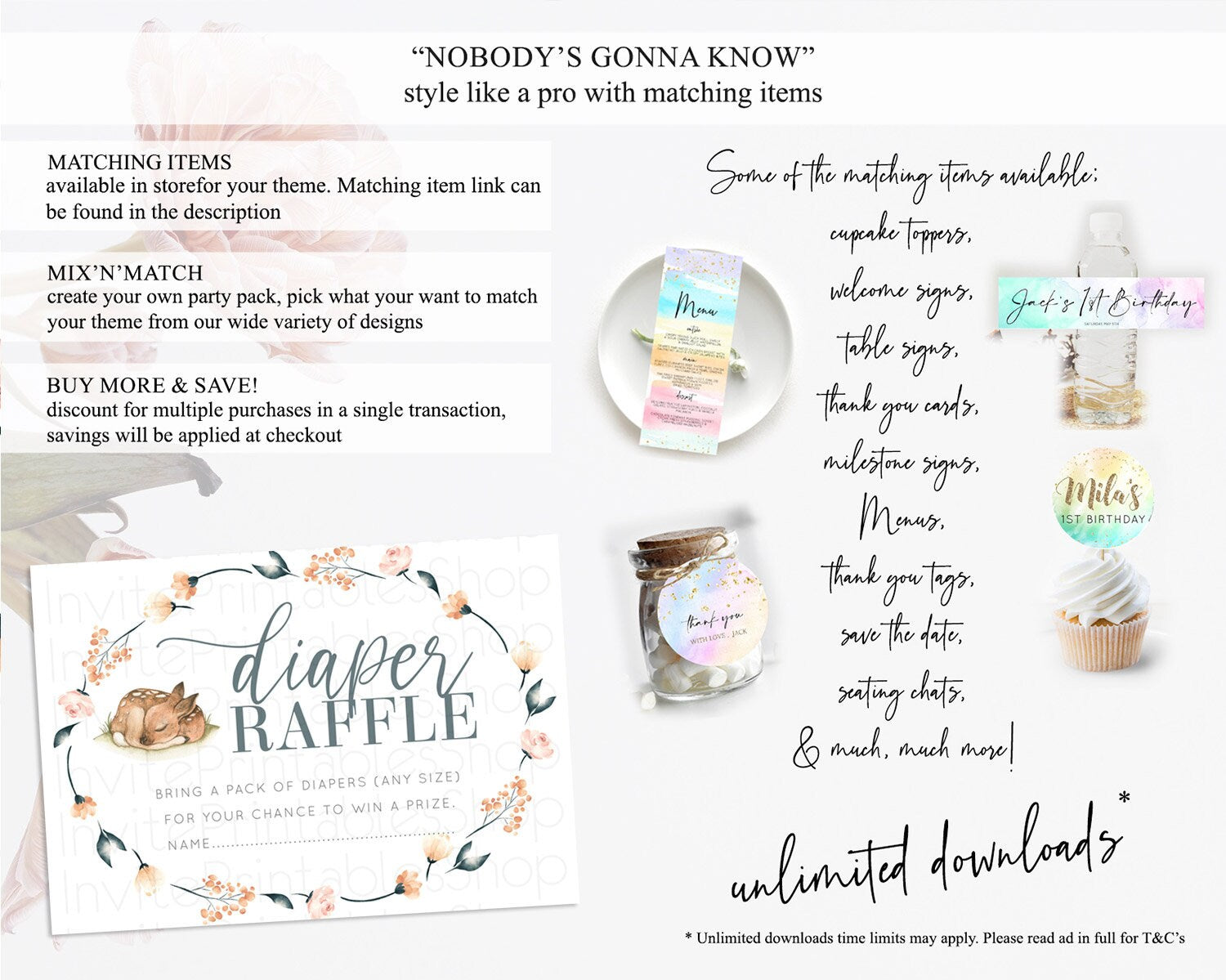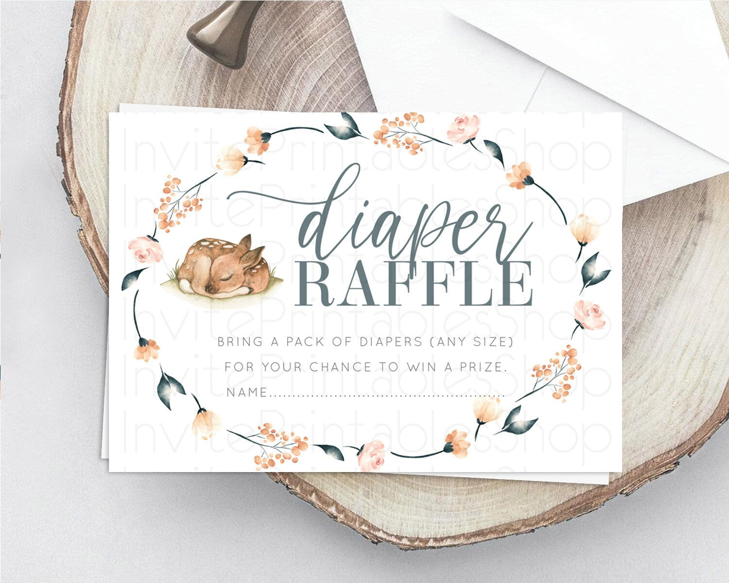Fawn Diaper Raffle Card Deer Diaper Insert Floral Deer Diaper Ticket Enchanted Forest Butterfly Pastel Baby Shower Raffle Game D10790