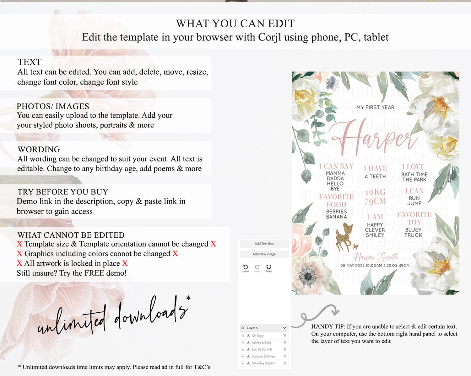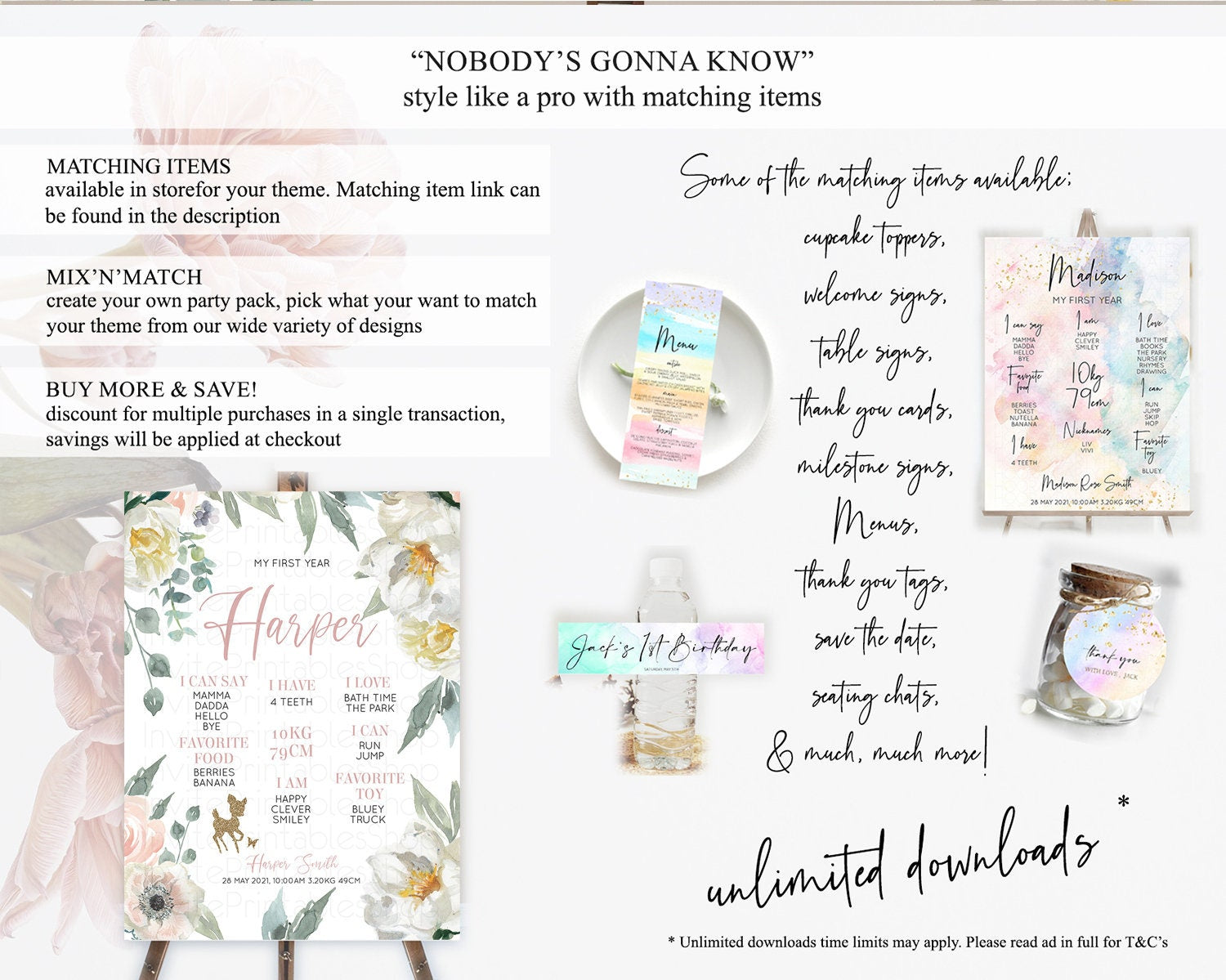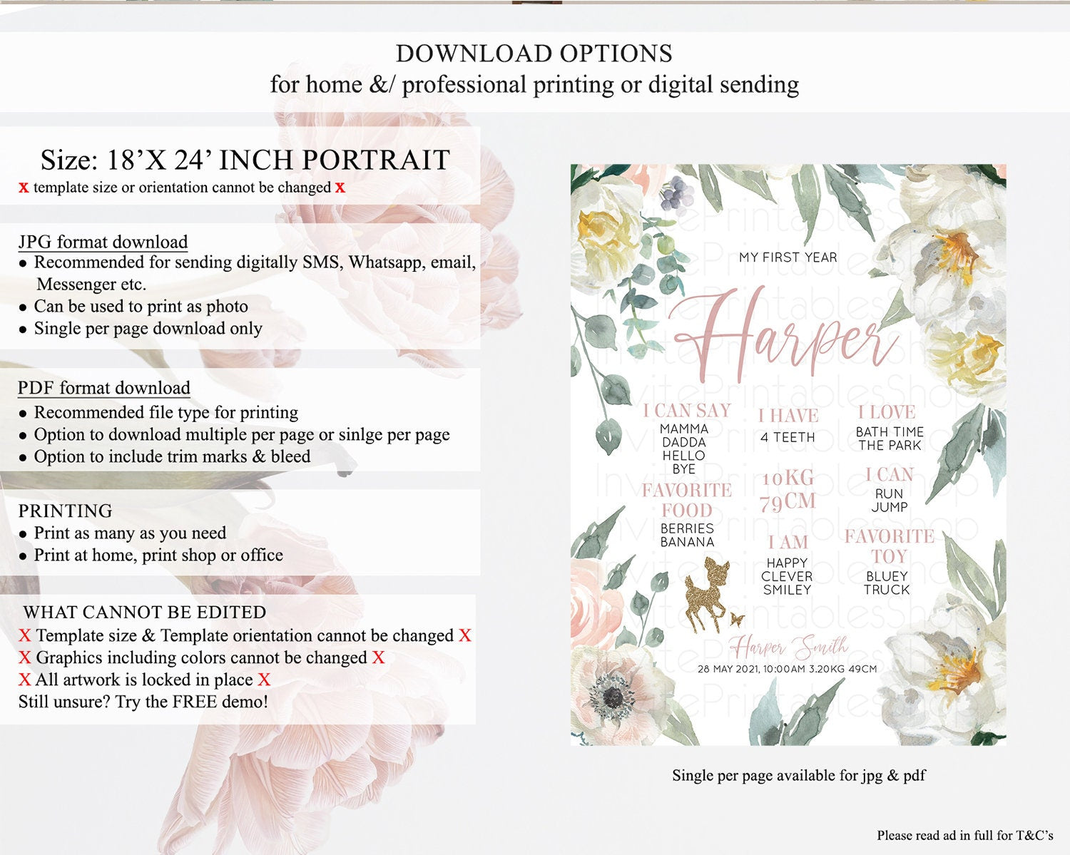 Fawn First Birthday Milestone Board Deer First Birthday Milestone Poster Enchanted Forest Butterfly Pastel Flowers 1st Birthday Sign D10120