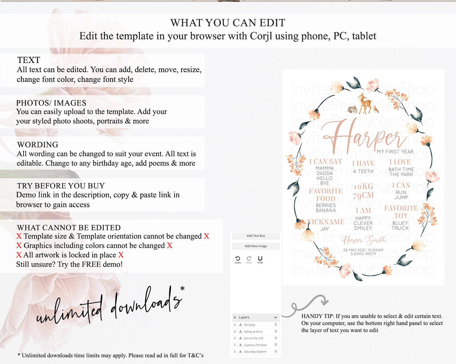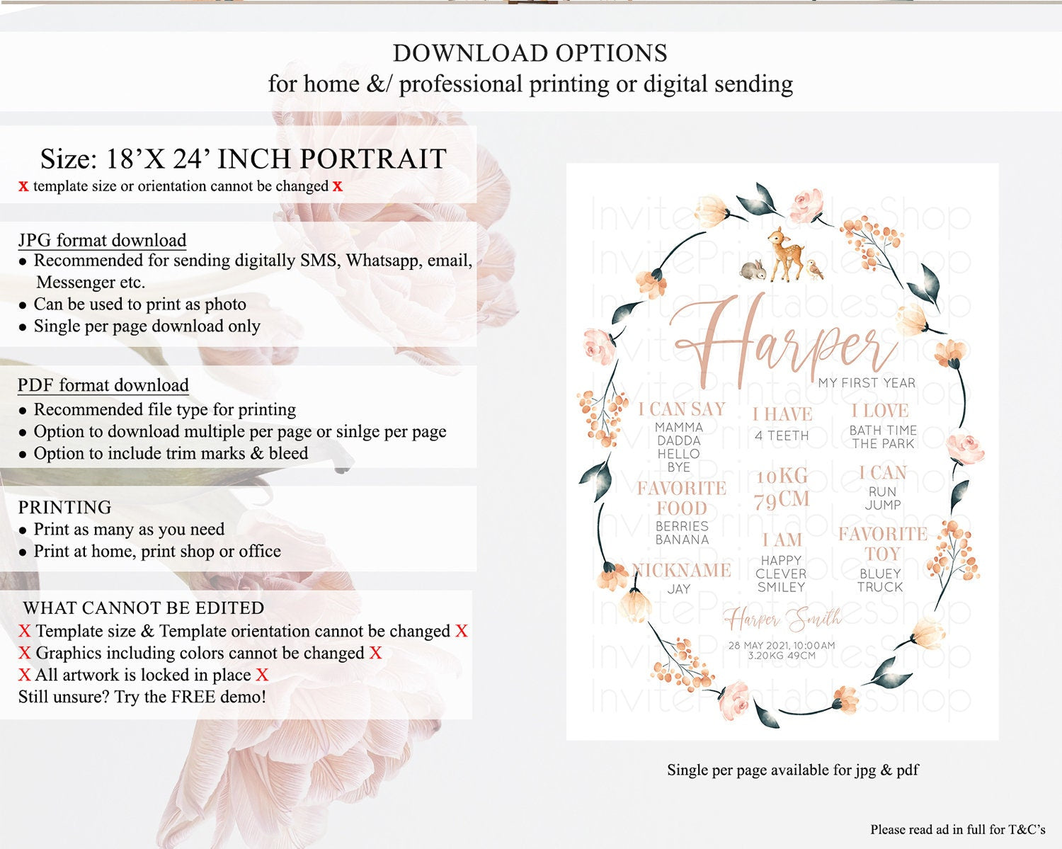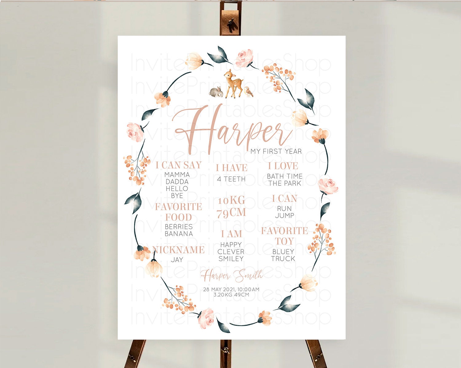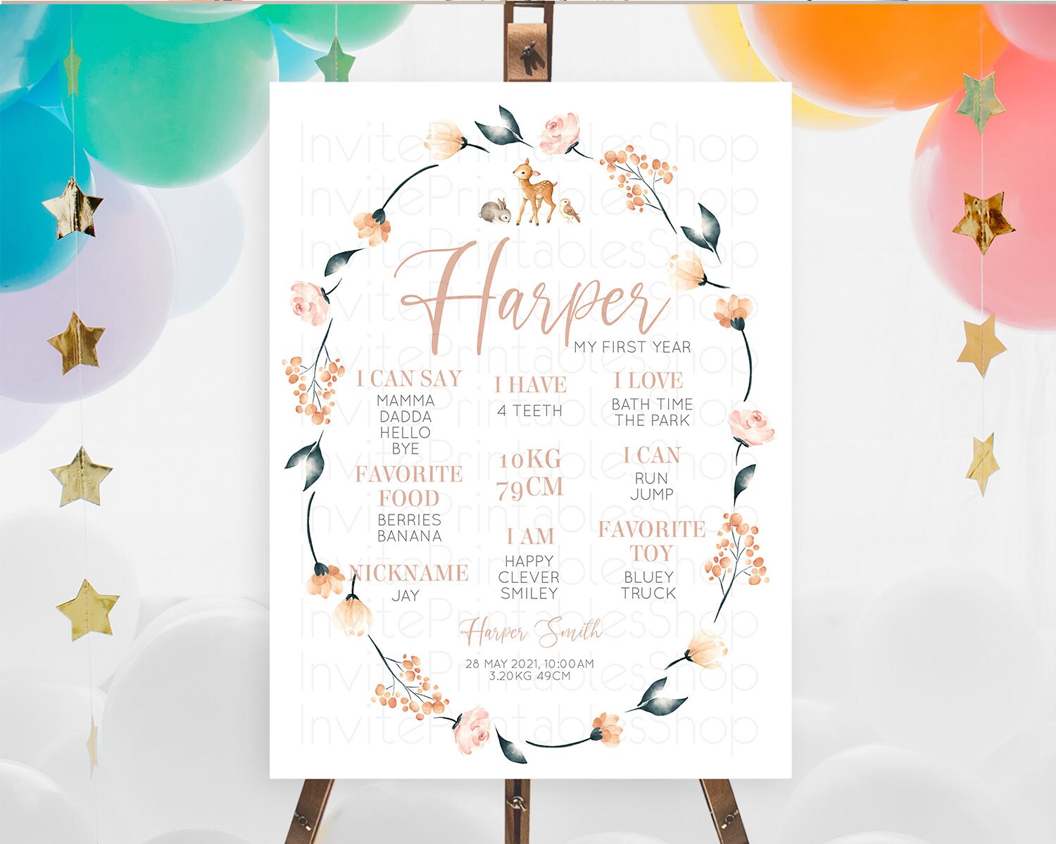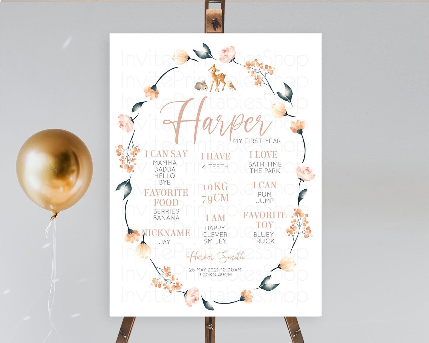 Fawn First Birthday Milestone Board Deer First Birthday Milestone Poster Enchanted Forest Butterfly Pastel Flowers 1st Birthday Sign D10241