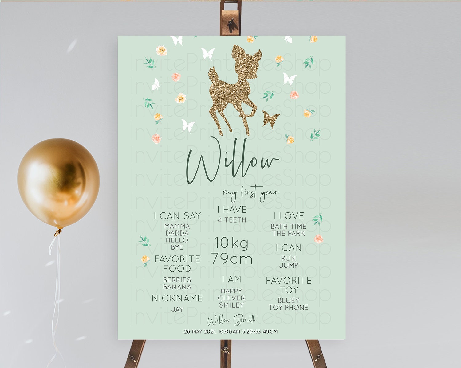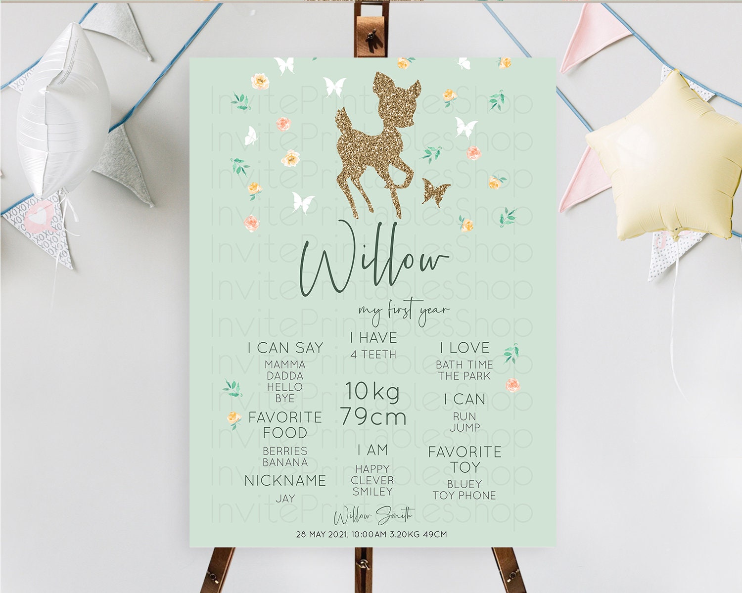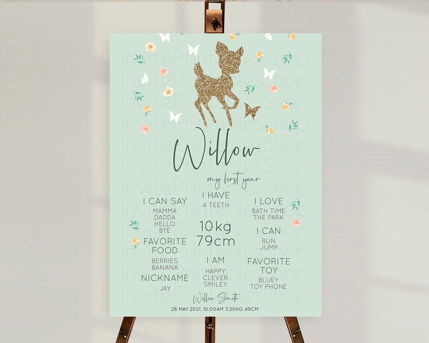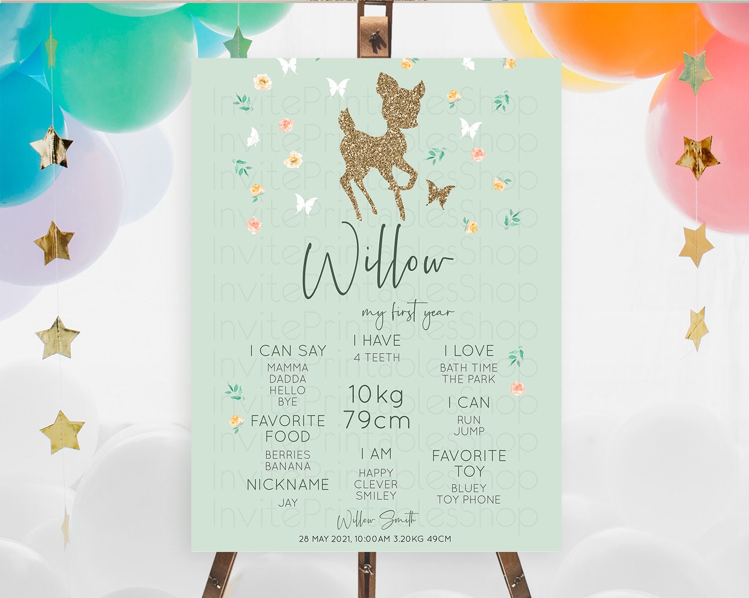 Fawn First Birthday Milestone Board Deer First Birthday Milestone Poster Enchanted Forest Butterfly Pastel Flowers 1st Birthday Sign D10385