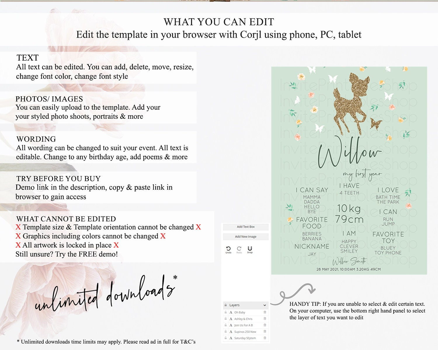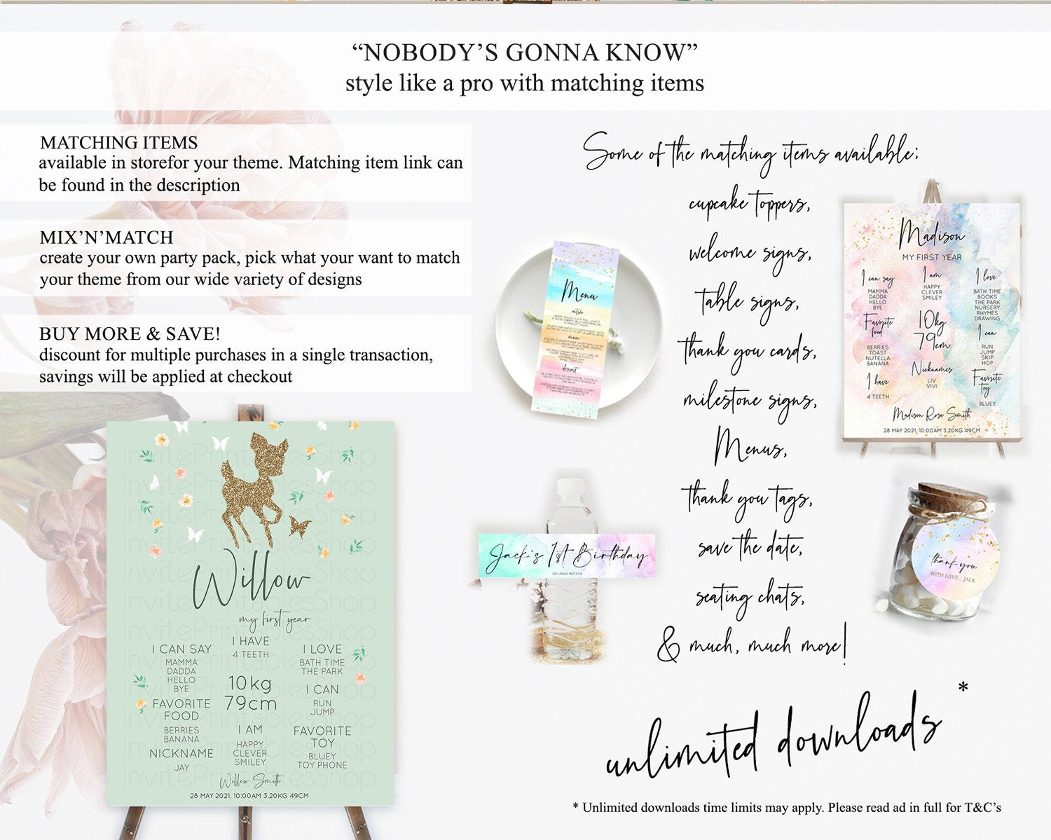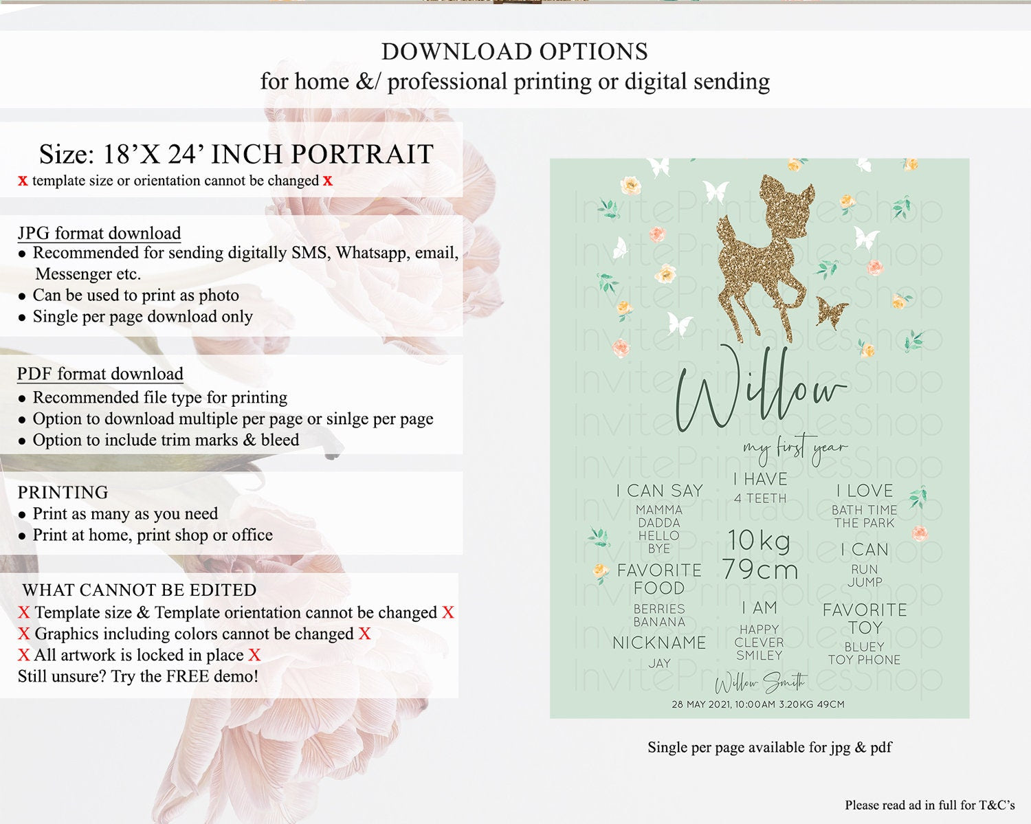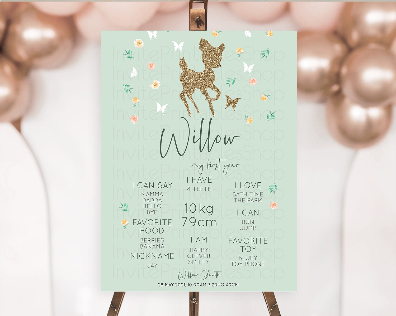 Fawn First Birthday Milestone Board Deer First Birthday Milestone Poster Enchanted Forest Butterfly Pastel Flowers 1st Birthday Sign D10385