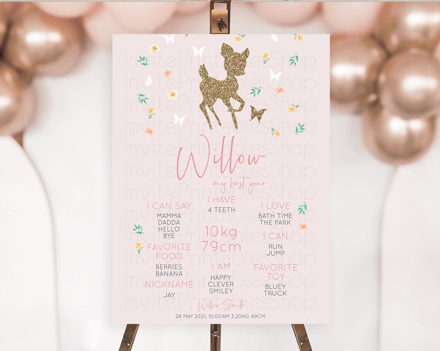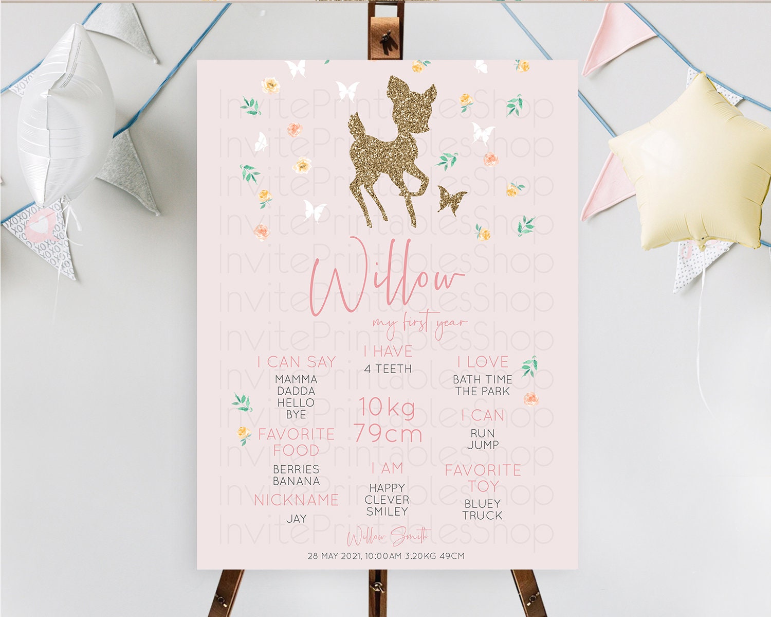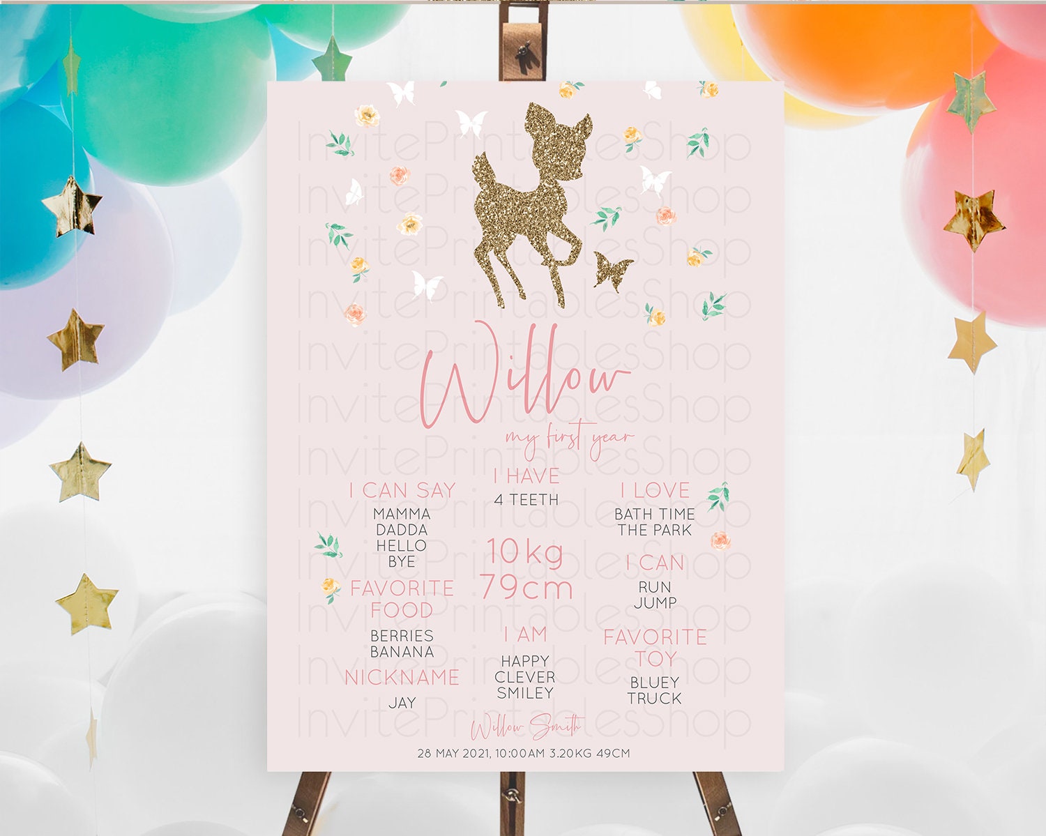 Fawn First Birthday Milestone Board Deer First Birthday Milestone Poster Enchanted Forest Butterfly Pastel Flowers 1st Birthday Sign D10386