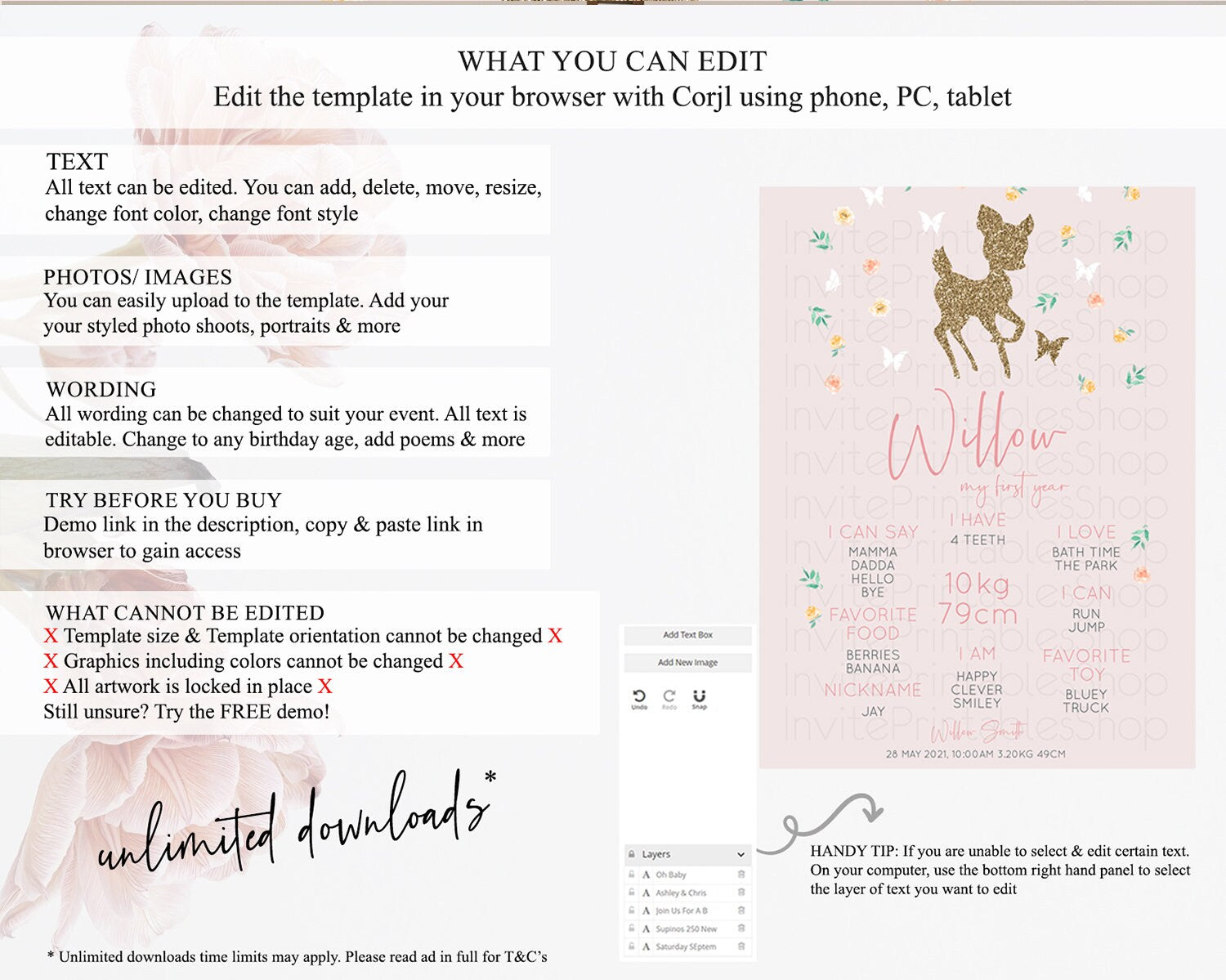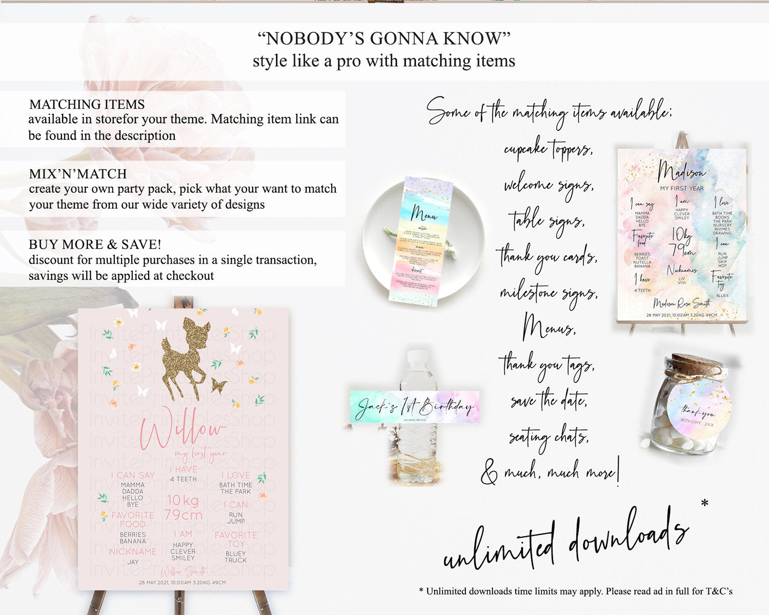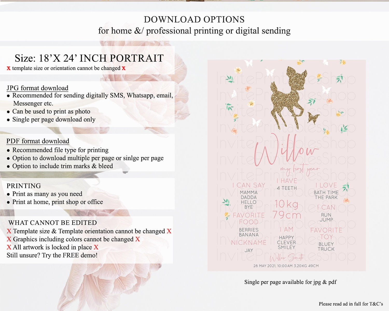 Fawn First Birthday Milestone Board Deer First Birthday Milestone Poster Enchanted Forest Butterfly Pastel Flowers 1st Birthday Sign D10386
