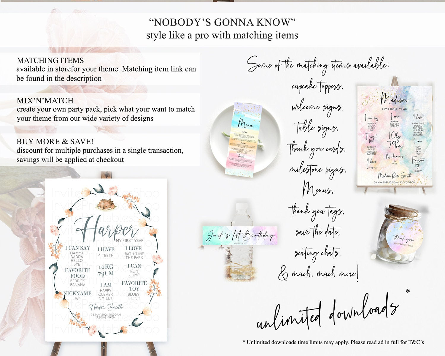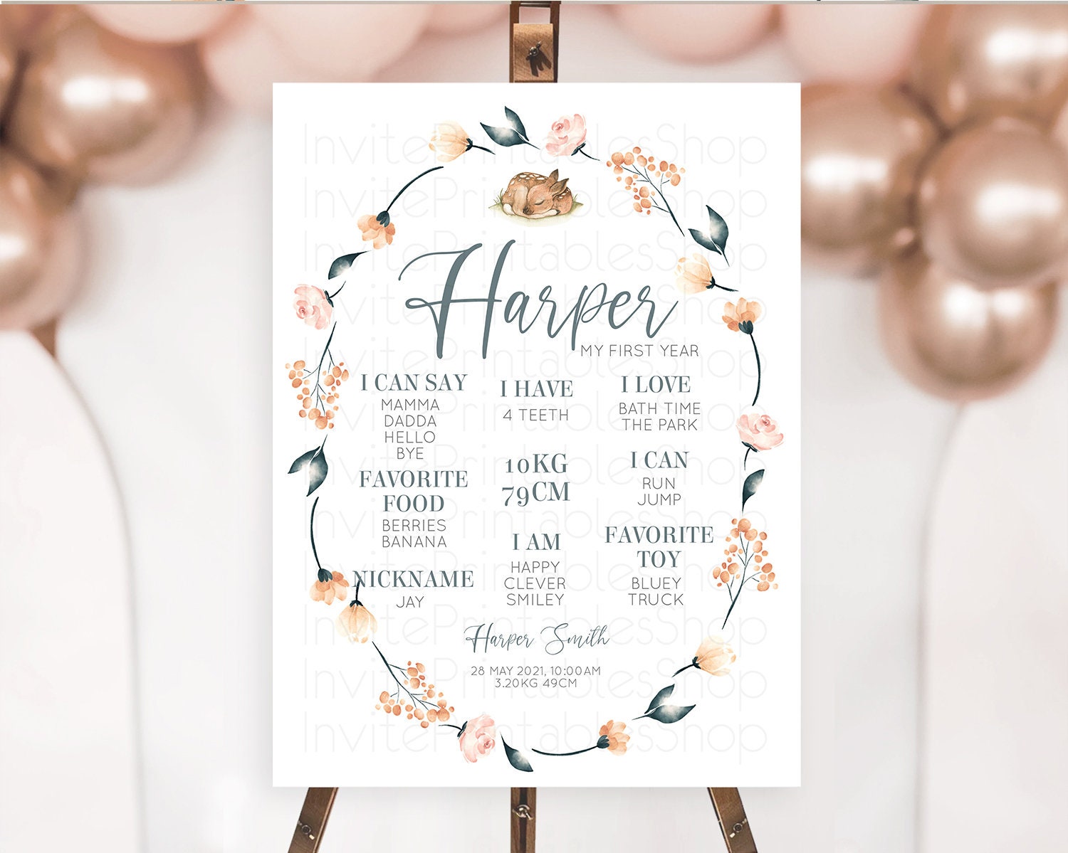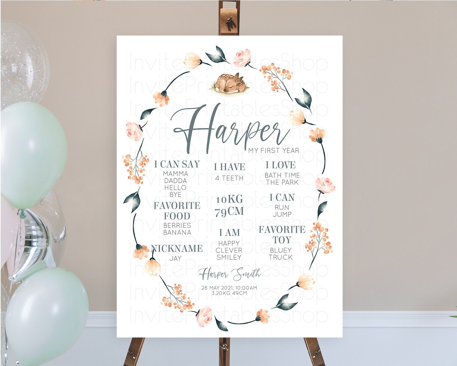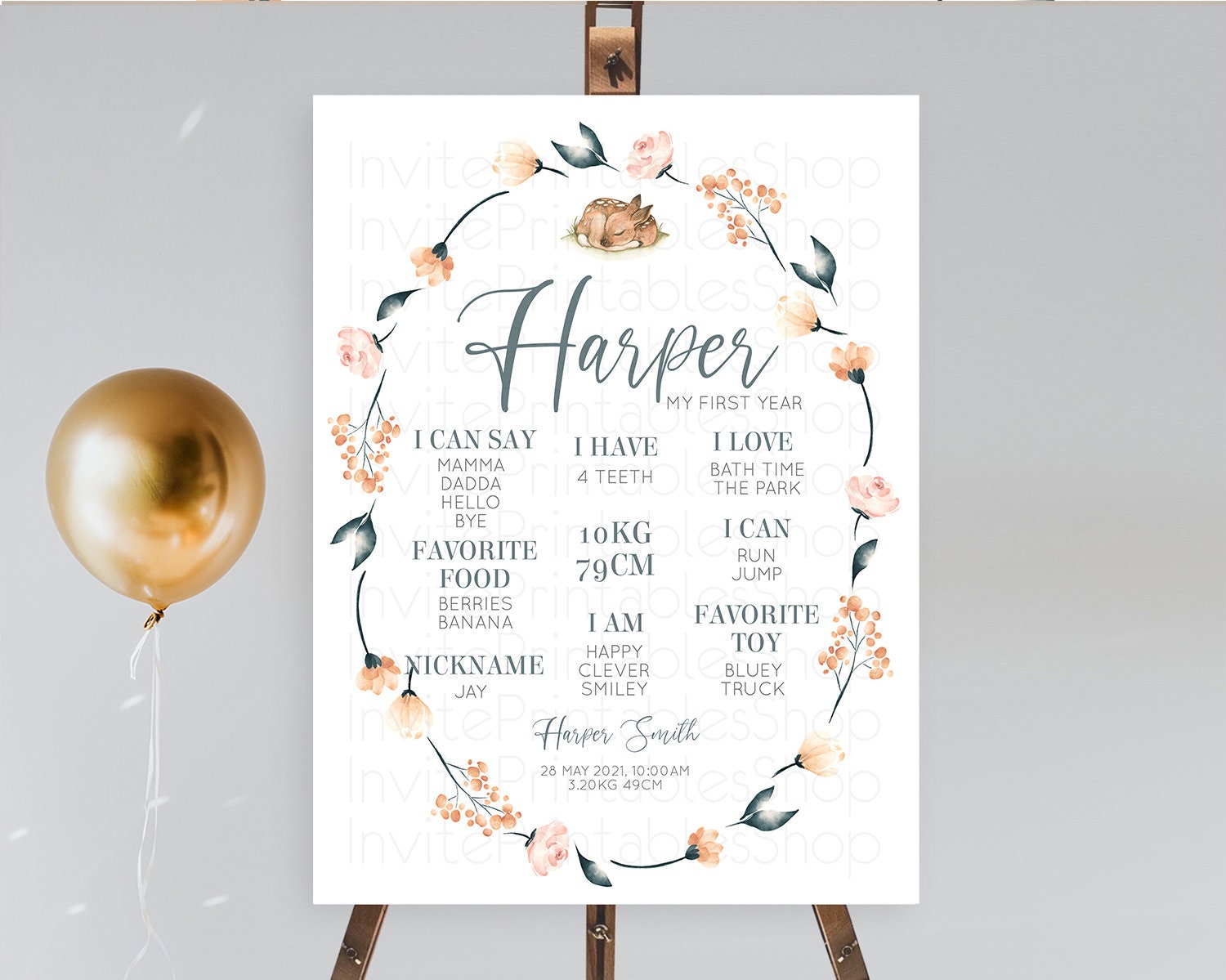 Fawn First Birthday Milestone Board Deer First Birthday Milestone Poster Enchanted Forest Butterfly Pastel Flowers 1st Birthday Sign D10790