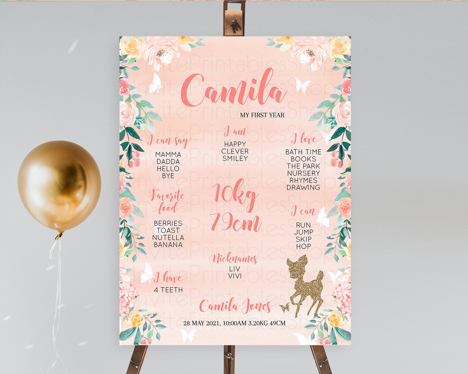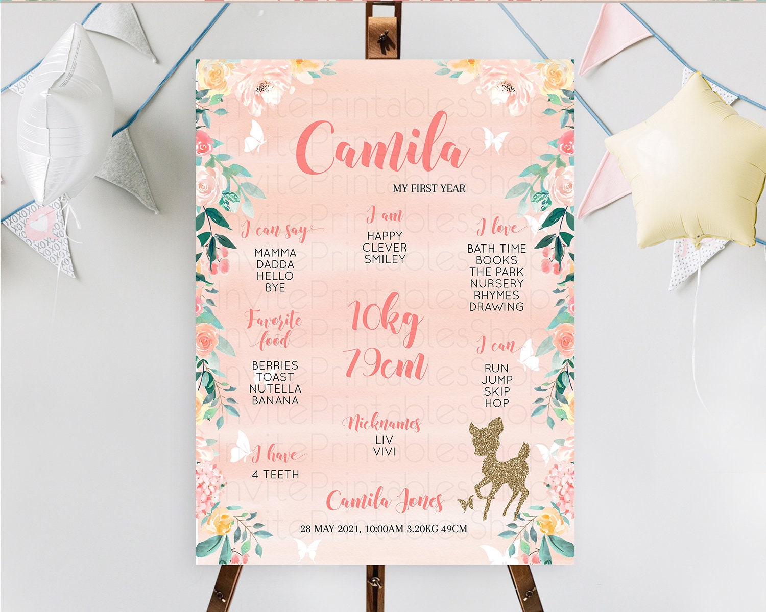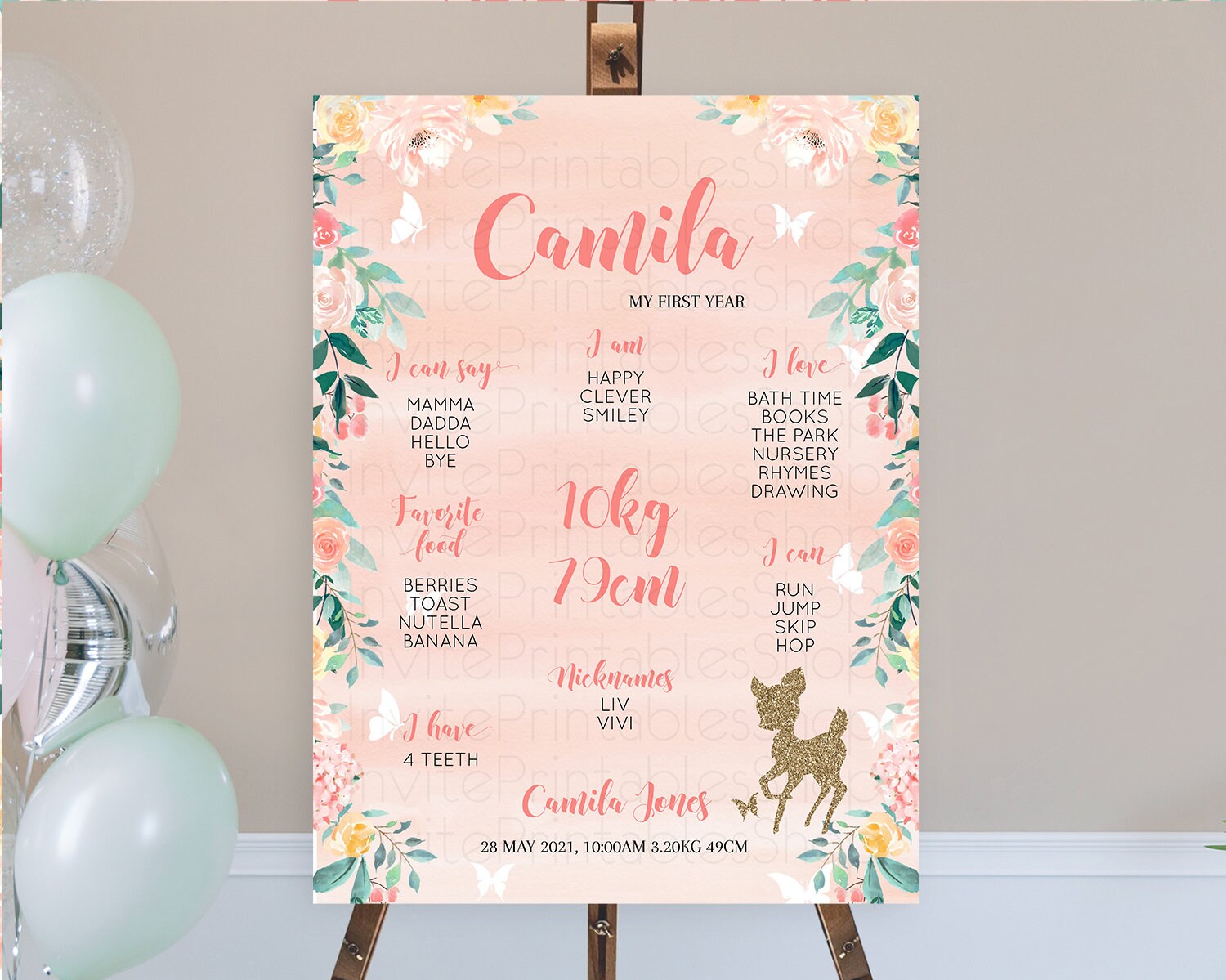 Fawn First Birthday Milestone Board Deer First Birthday Milestone Poster Enchanted Forest Butterfly Pastel Flowers 1st Birthday Sign D10873