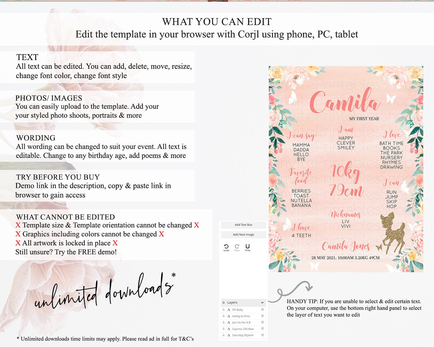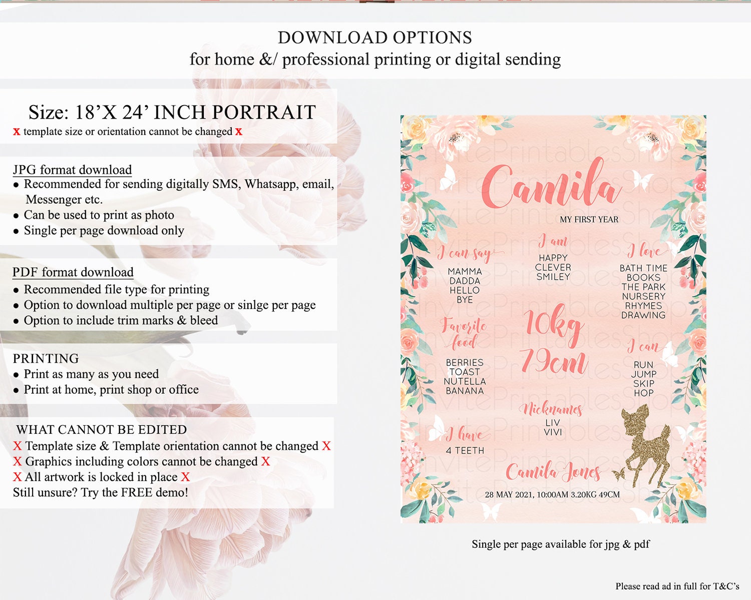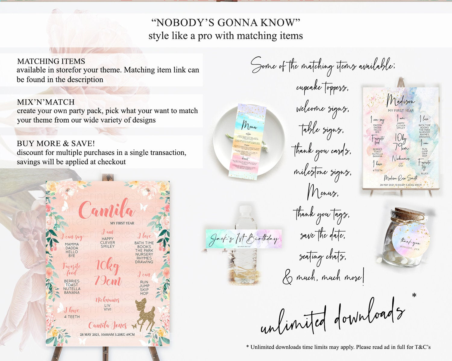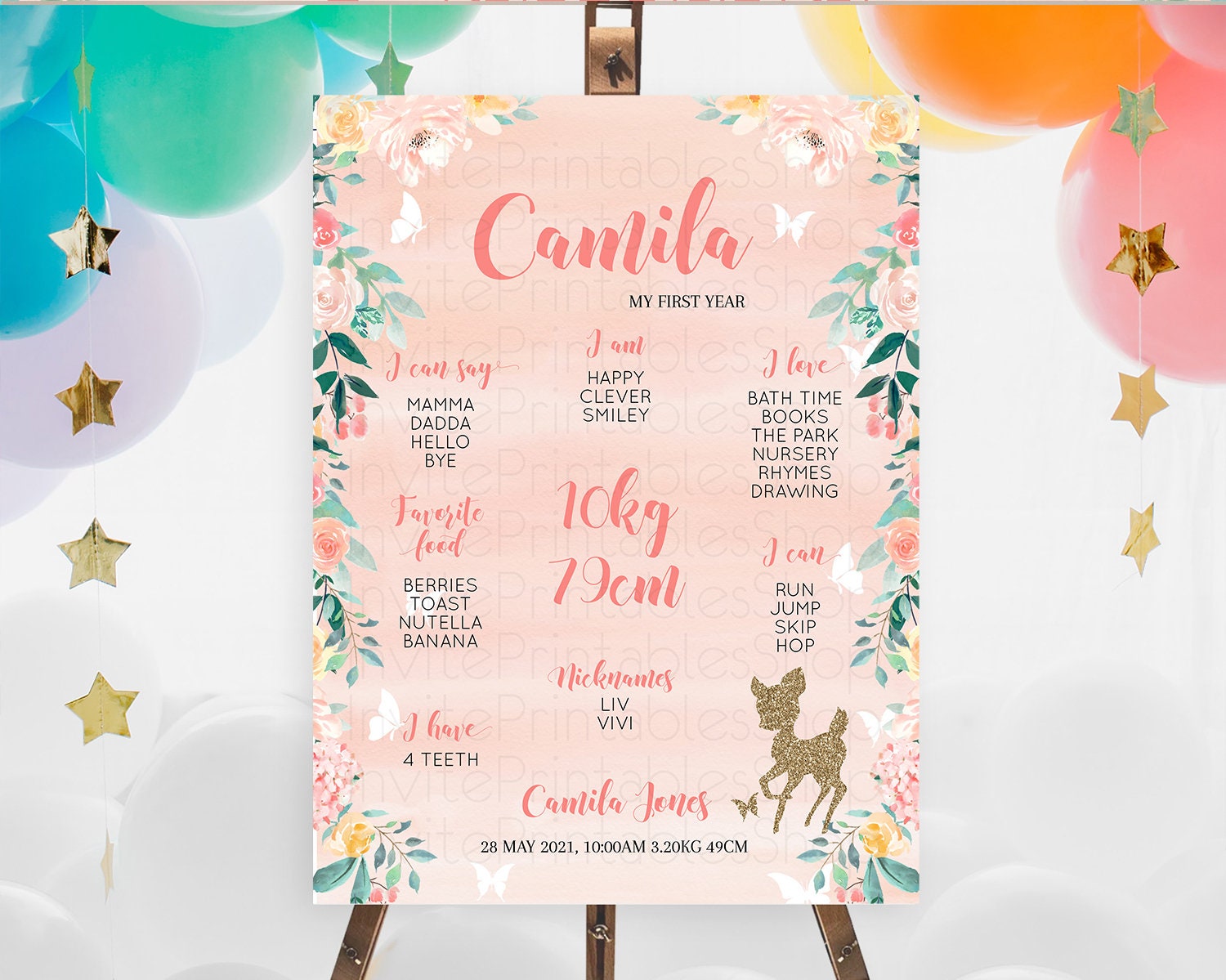 Fawn First Birthday Milestone Board Deer First Birthday Milestone Poster Enchanted Forest Butterfly Pastel Flowers 1st Birthday Sign D10873
