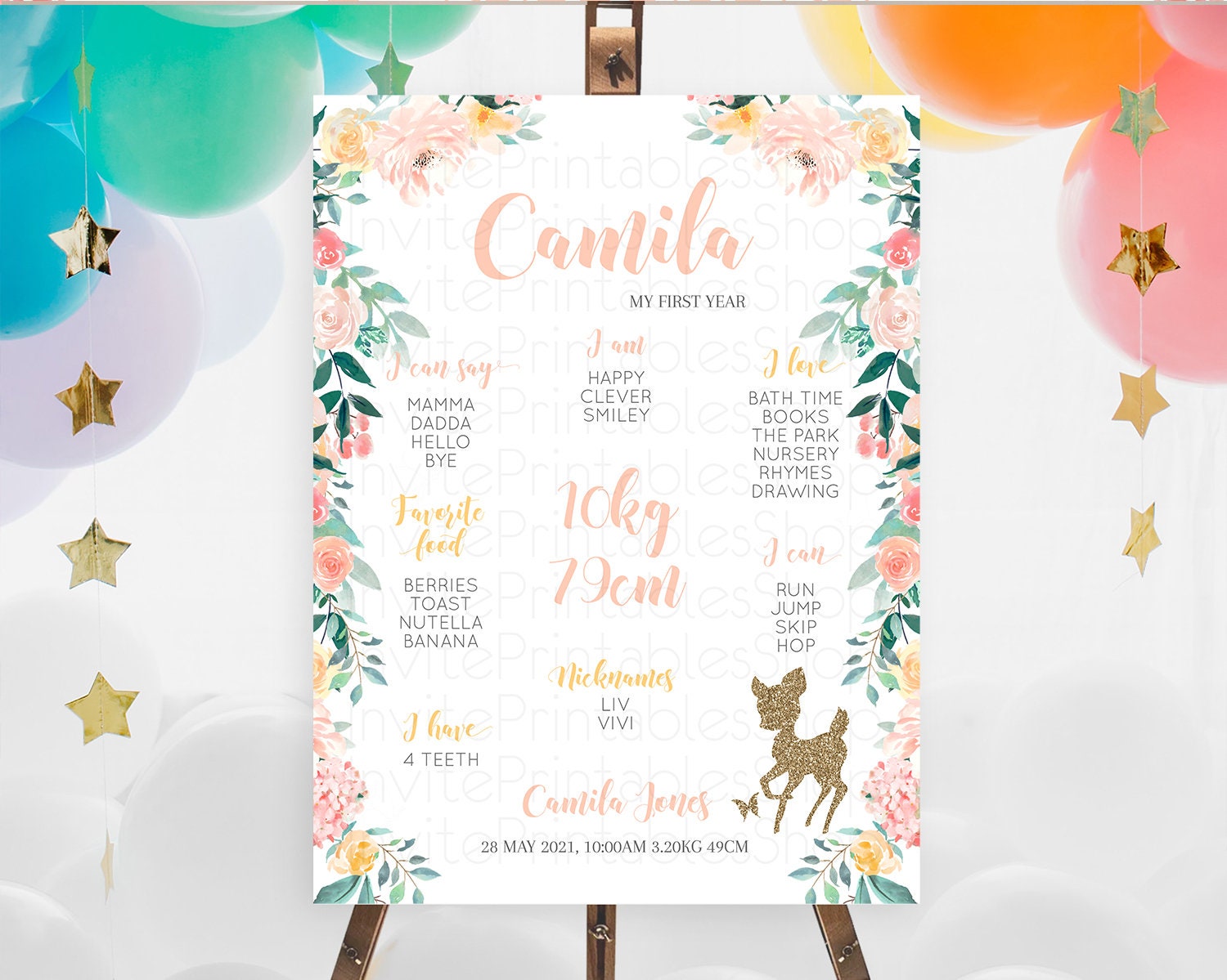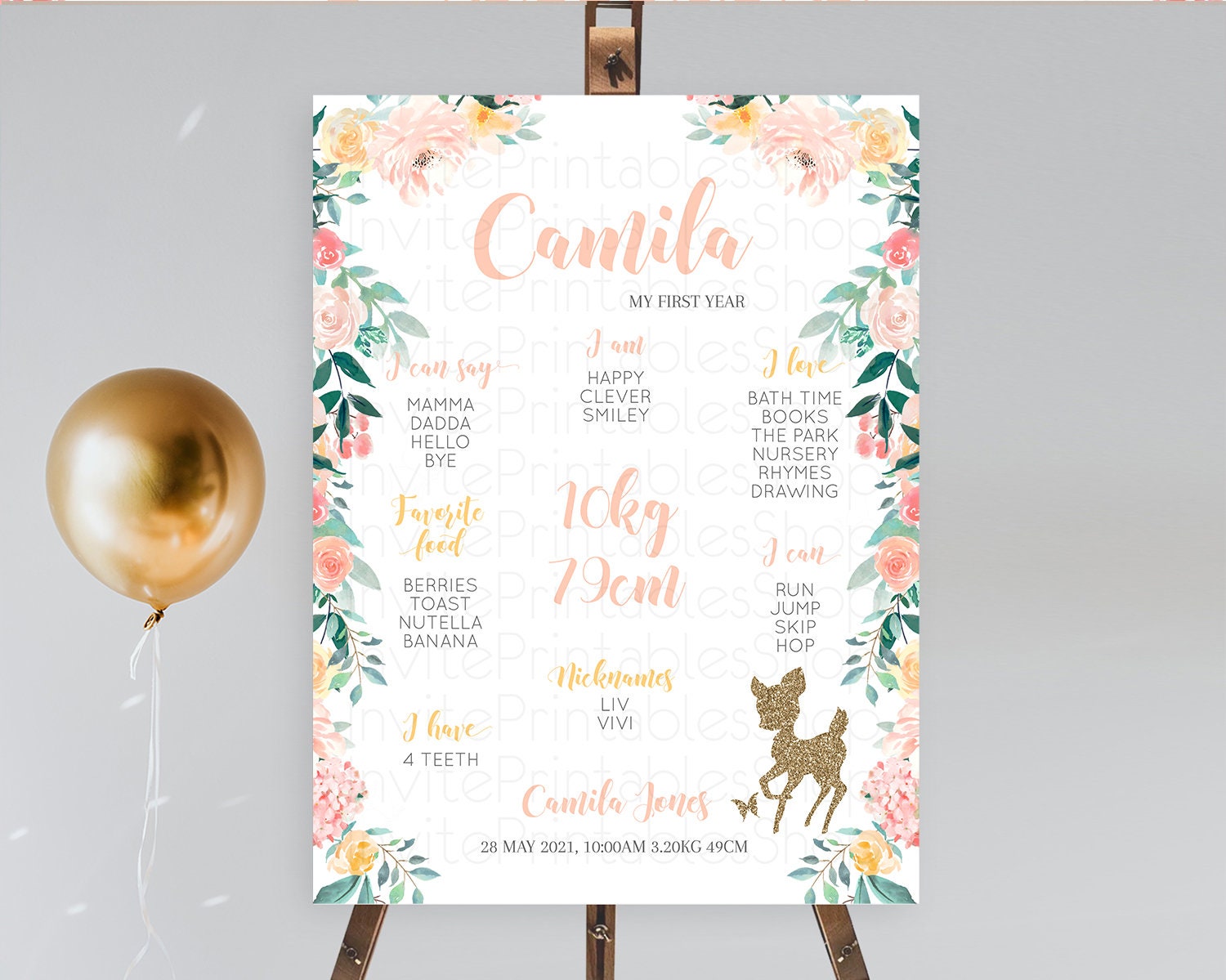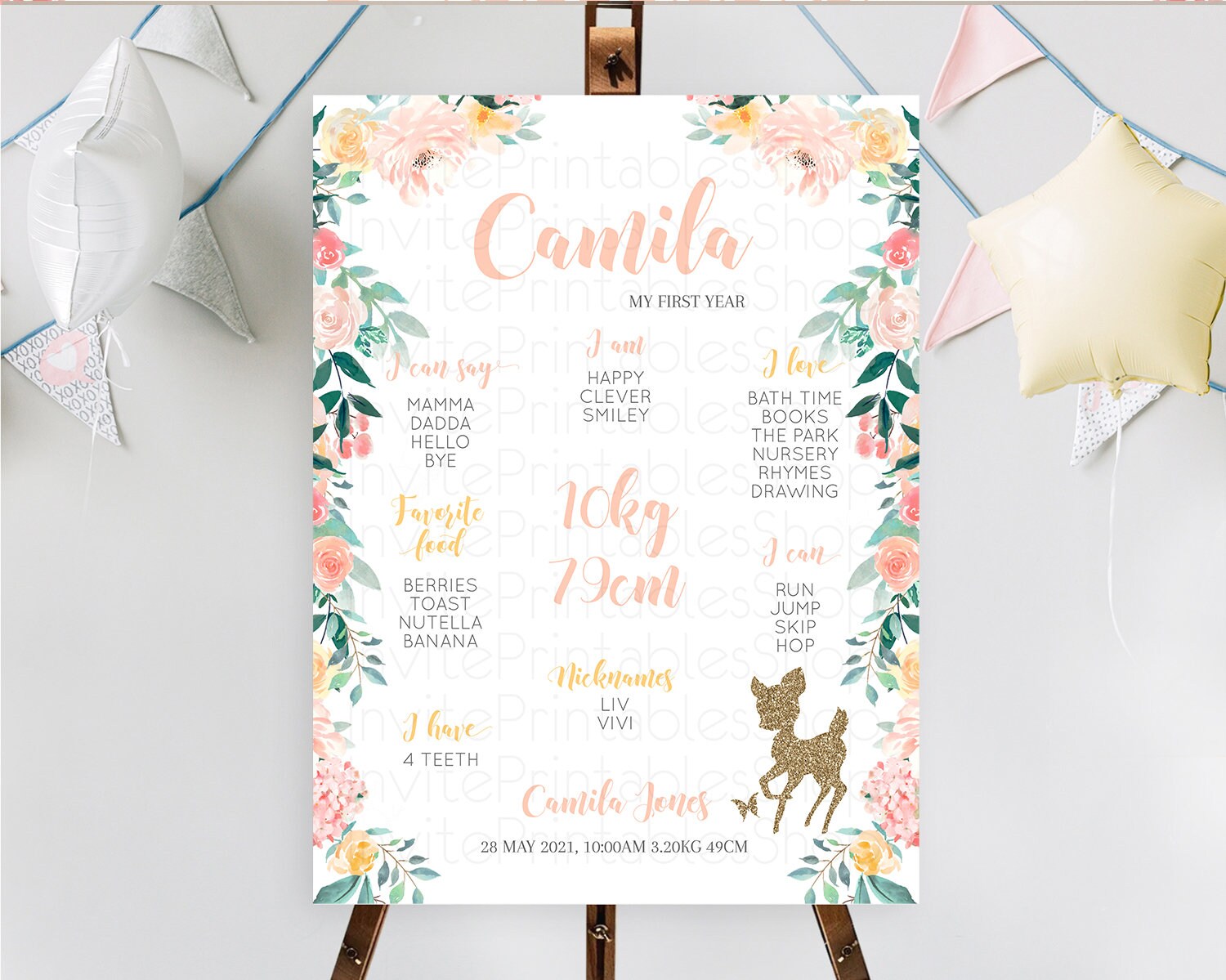 Fawn First Birthday Milestone Board Deer First Birthday Milestone Poster Enchanted Forest Butterfly Pastel Flowers 1st Birthday Sign D10874