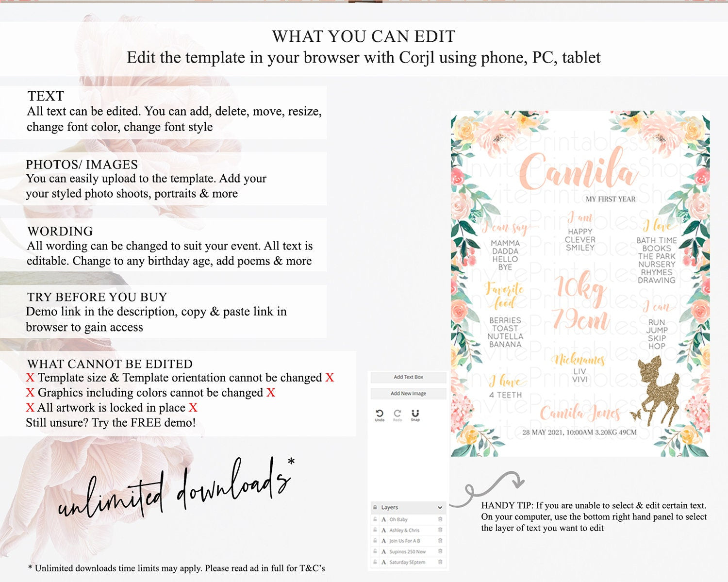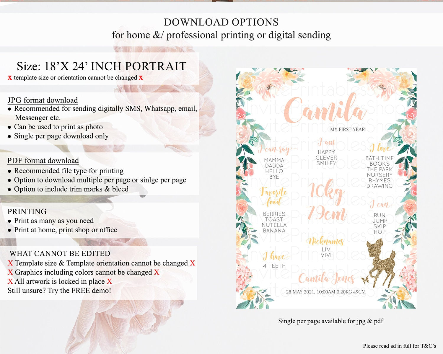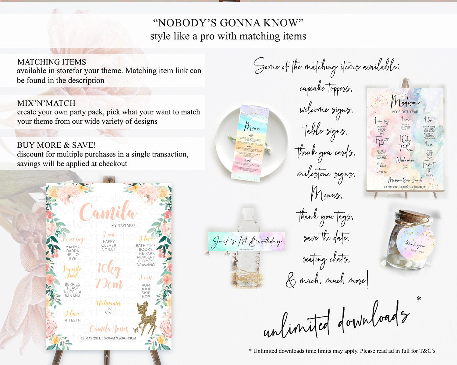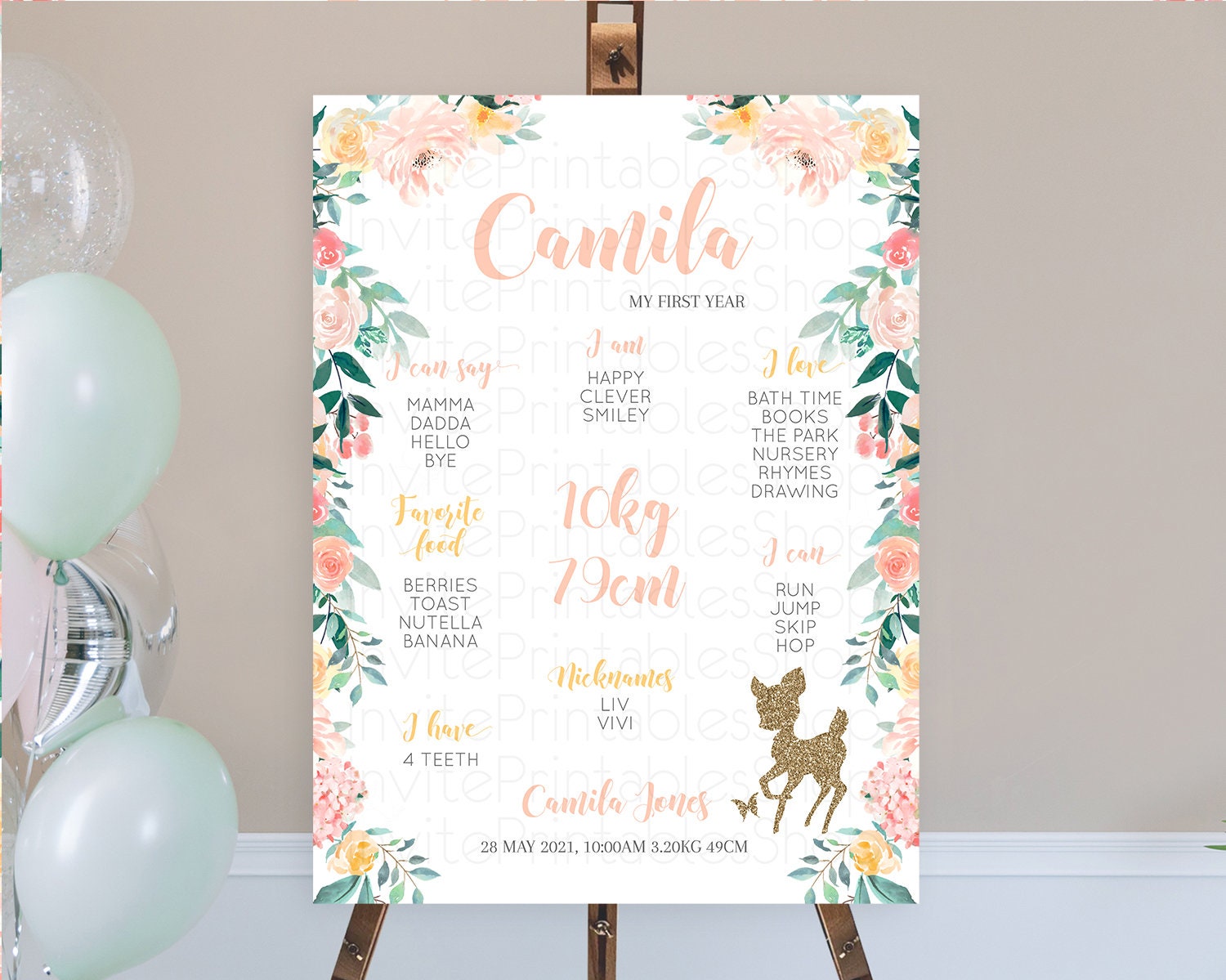 Fawn First Birthday Milestone Board Deer First Birthday Milestone Poster Enchanted Forest Butterfly Pastel Flowers 1st Birthday Sign D10874