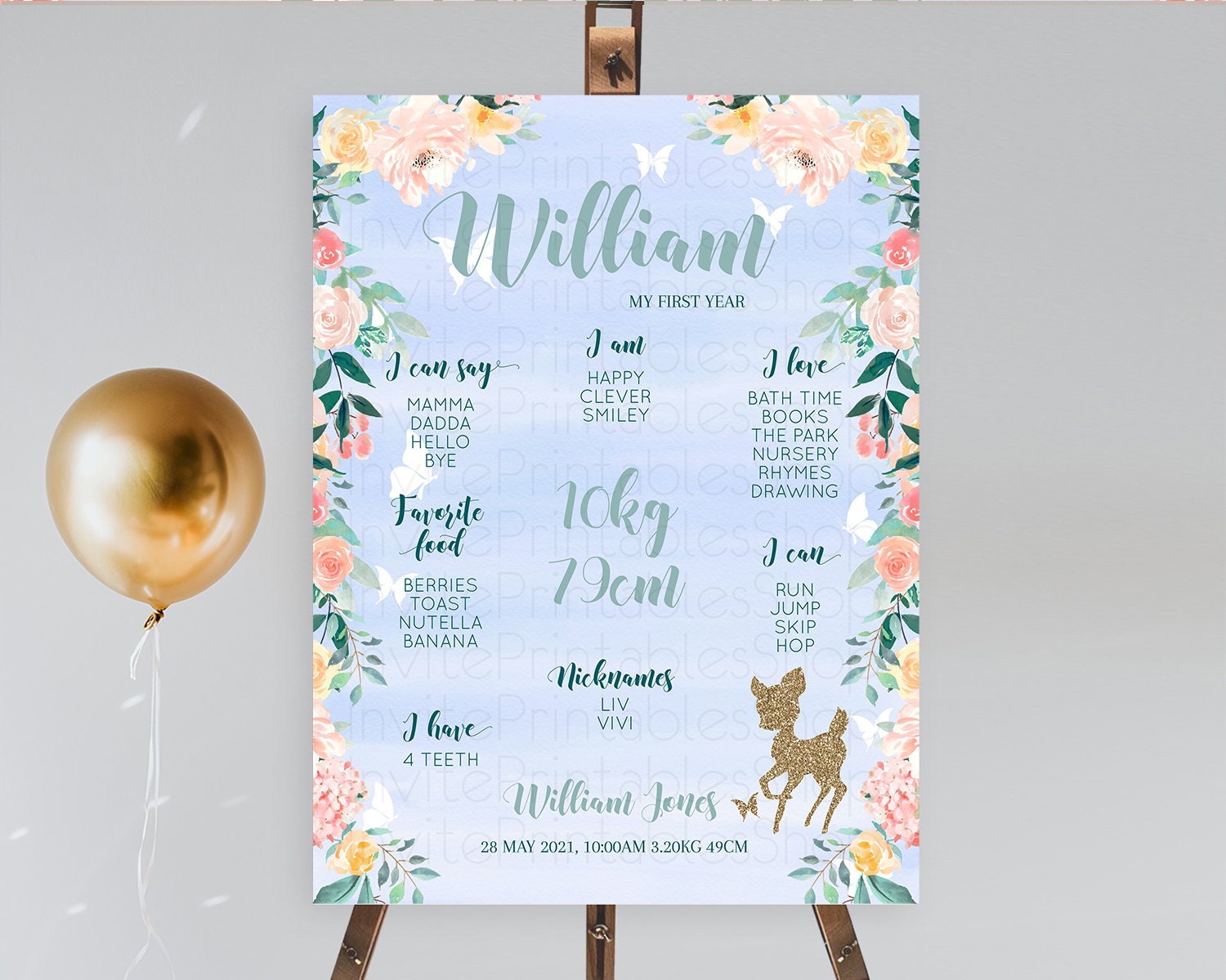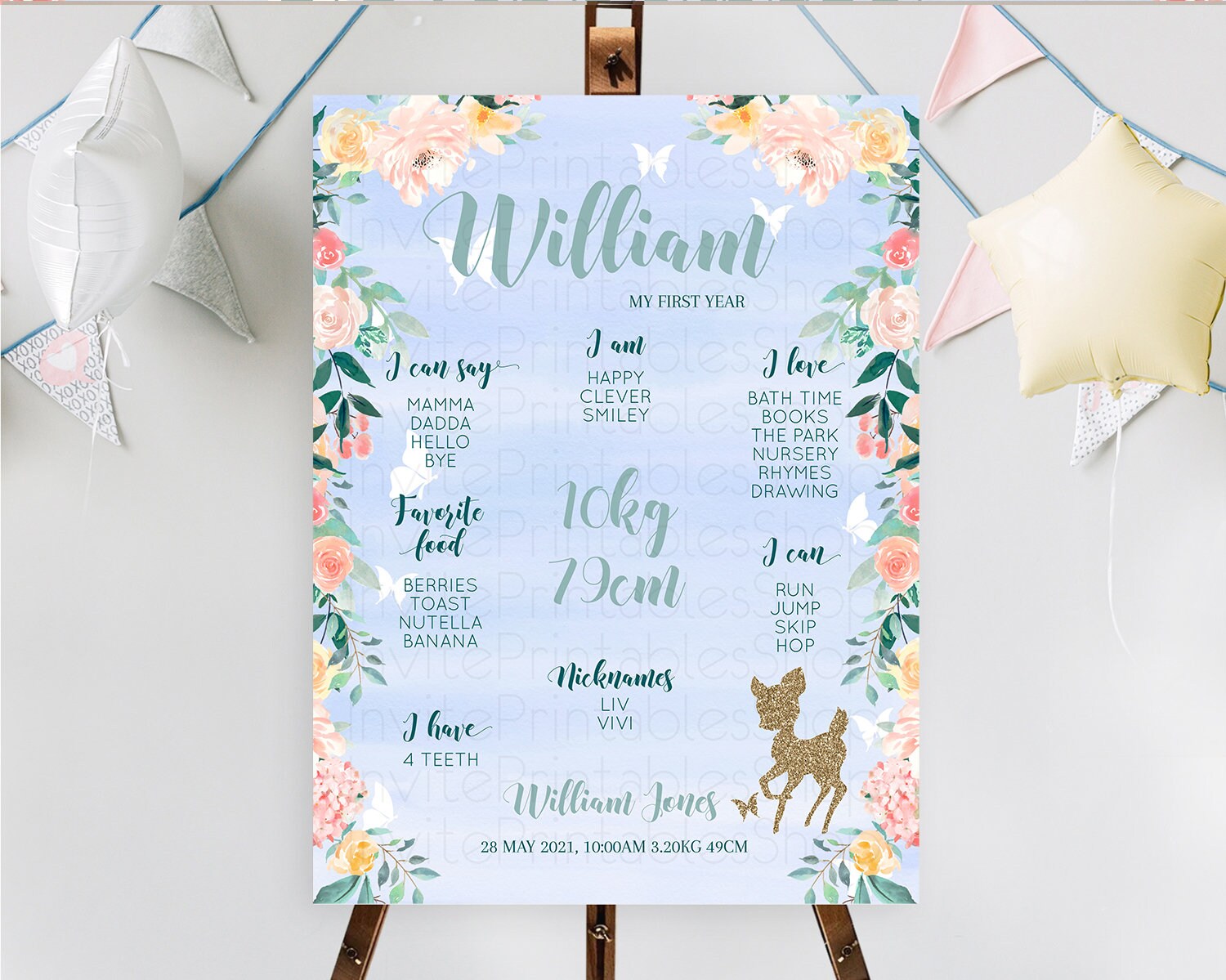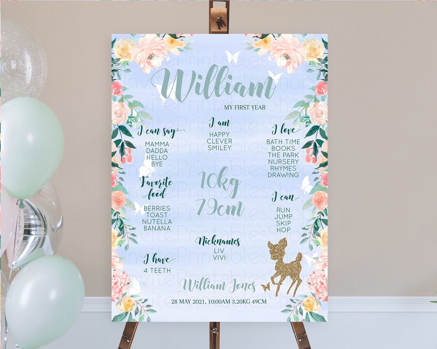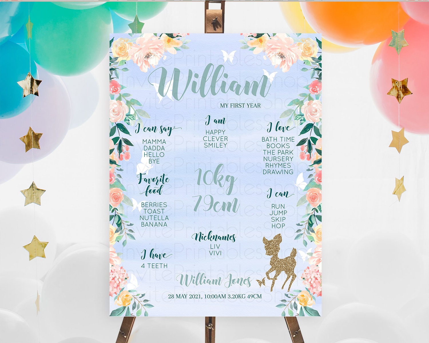 Fawn First Birthday Milestone Board Deer First Birthday Milestone Poster Enchanted Forest Butterfly Pastel Flowers 1st Birthday Sign D10875